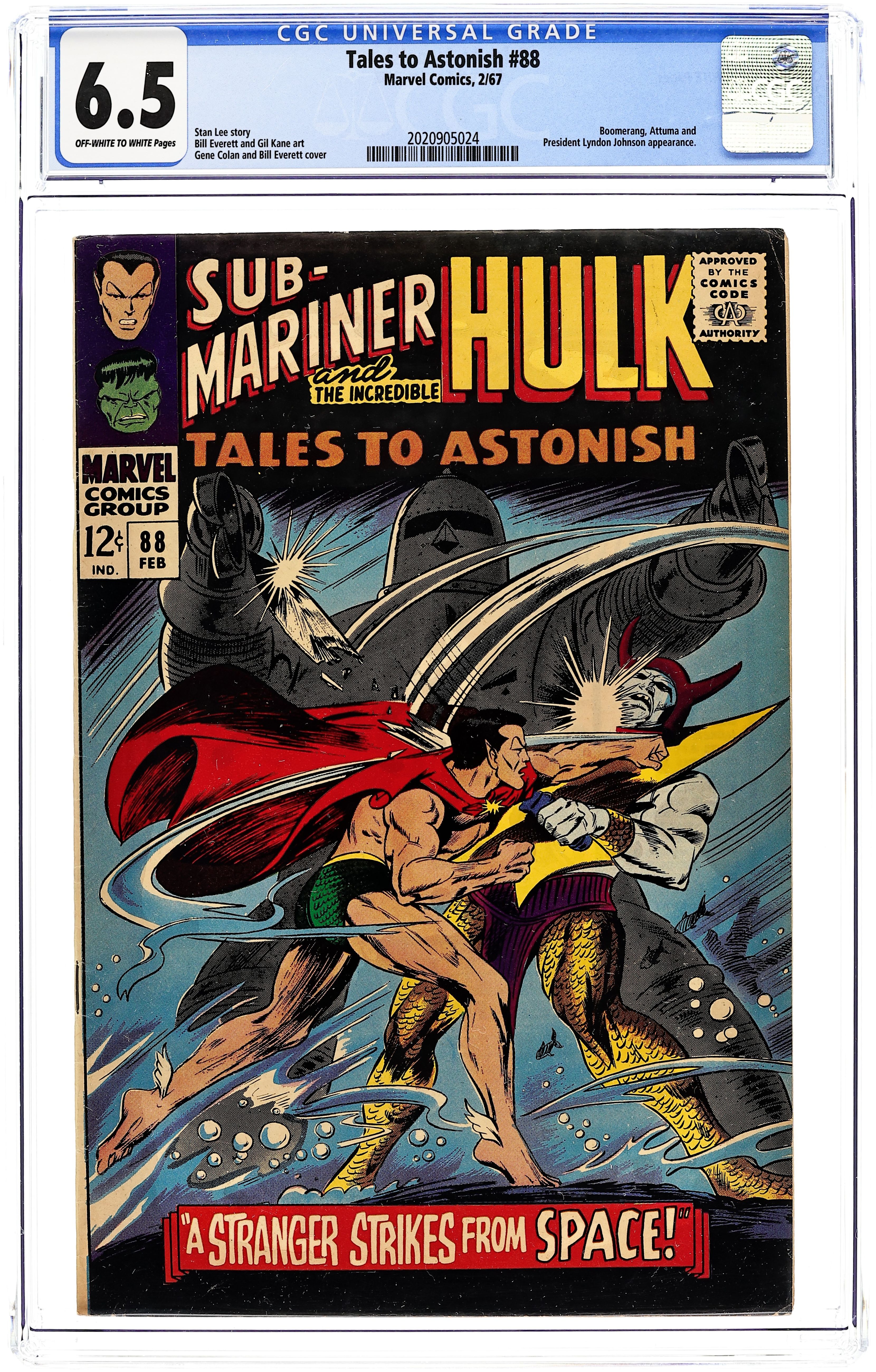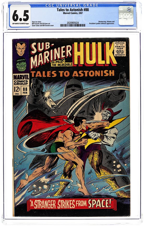 Cover by Marie Severin and Frank Giacoia. The Monarch and the Monster, script by Roy Thomas and Dan Adkins; As Namor battles It, torpedoes from the submarine cause an avalanche, trapping It; Namor turns on the submarine and begins to punch holes in it; It (the creature) returns and they battle, further damaging the submarine and (apparently) killing it;The submarine leaves (with the carcass of It) while Namor breaks off, feeling weakness overwhelm him. He Who Strikes the Silver Surfer, script by Stan Lee, art by Marie Severin; Having 'caught' the Silver Surfer (believing him to be an alien starship), Hulk starts a fight with perhaps the only being on Earth stronger than Hulk is; The Surfer, irritated, knocks him out, then probes Hulk to discover the reason for his belligerence and discovers the damage done by the gamma radiation; Just as the Surfer prepares to reverse the damage and return Dr. Banner's life, Hulk wakes up and, seeing the action as an attack, lashes out. 36 pages, full color. Cover price $0.12.