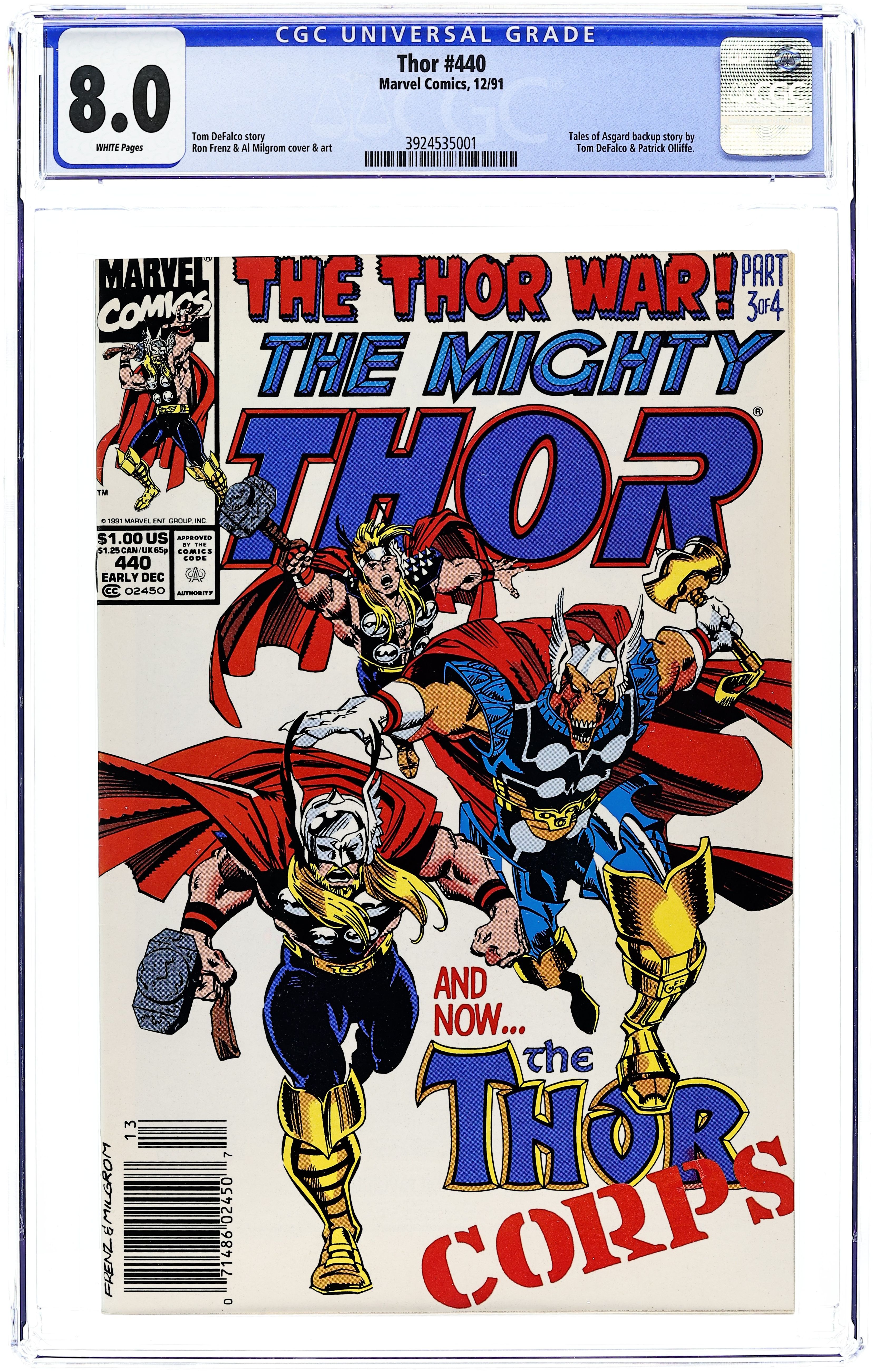 Direct Edition. Cover pencils by Ron Frenz, inks by Al Milgrom. Metallic purple cover. Intro new Thor (Eric Masterson) in "Whosoever Holds This Hammer," script by Tom DeFalco and Ron Frenz (plot), pencils by Ron Frenz (layouts), inks by Al Milgrom (finished art); Eric Masterson must begin to learn how to handle the new Thor powers without the guidance of the old Thor; Ulik battles Thor and Code Blue. Bullpen Bulletins. Ron Frenz writes about the retirement of Joe Sinnott. 52 pgs., full color. $1.50. Cover price $1.00.