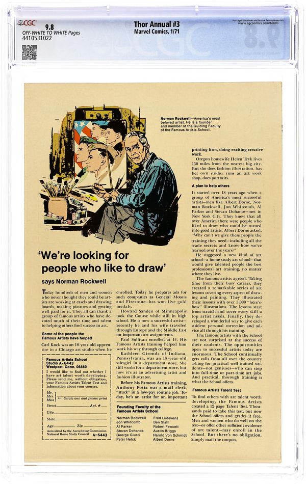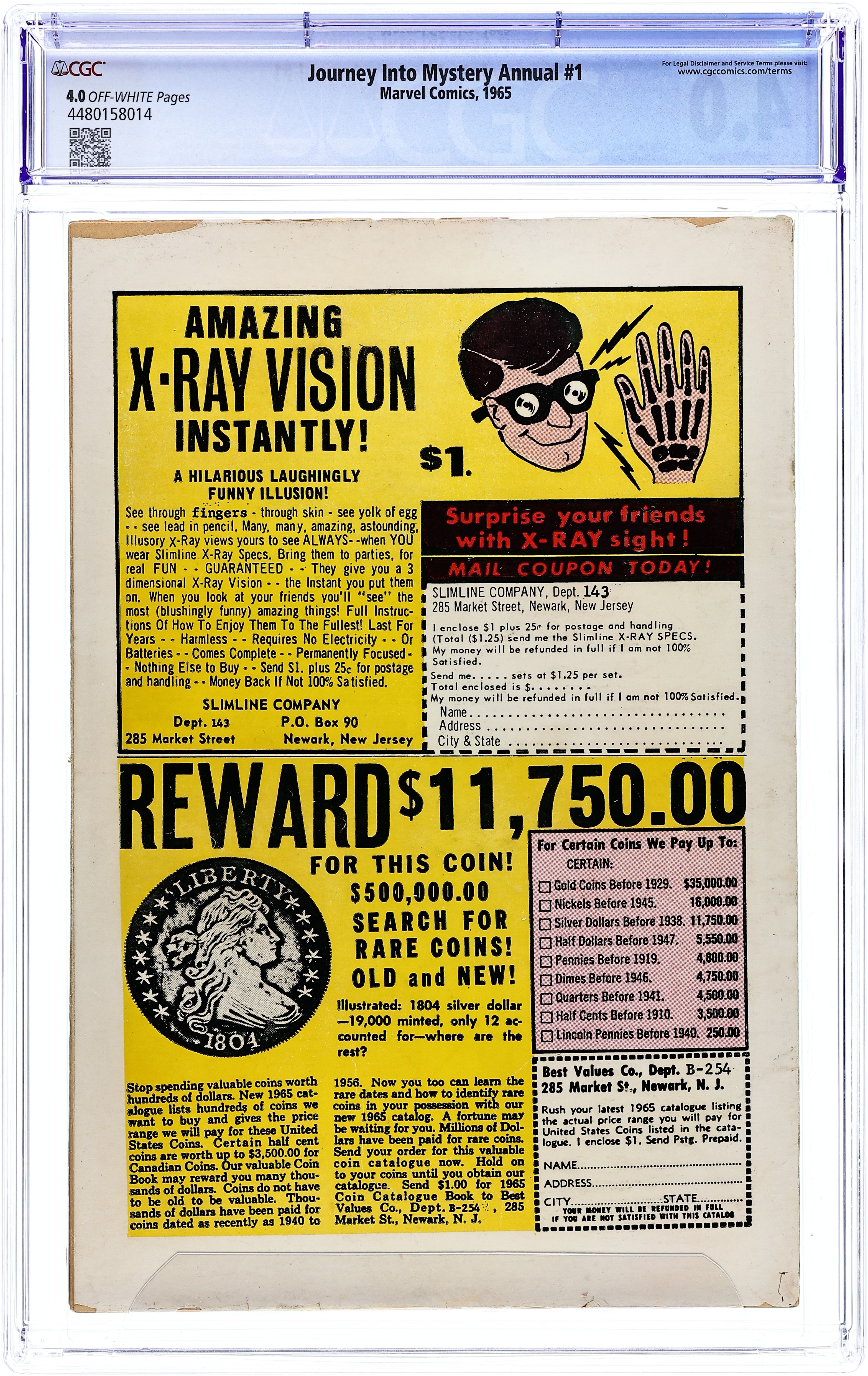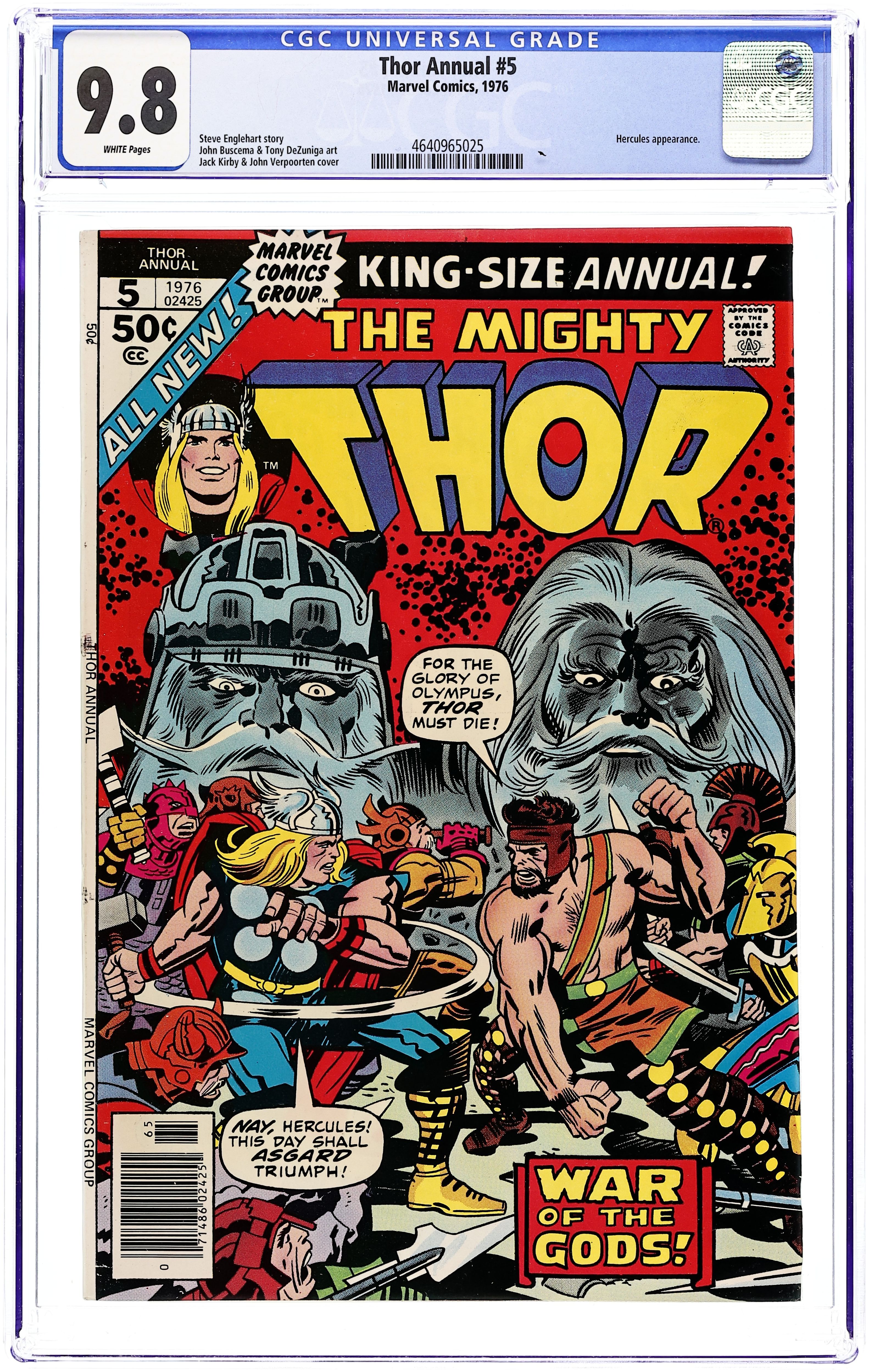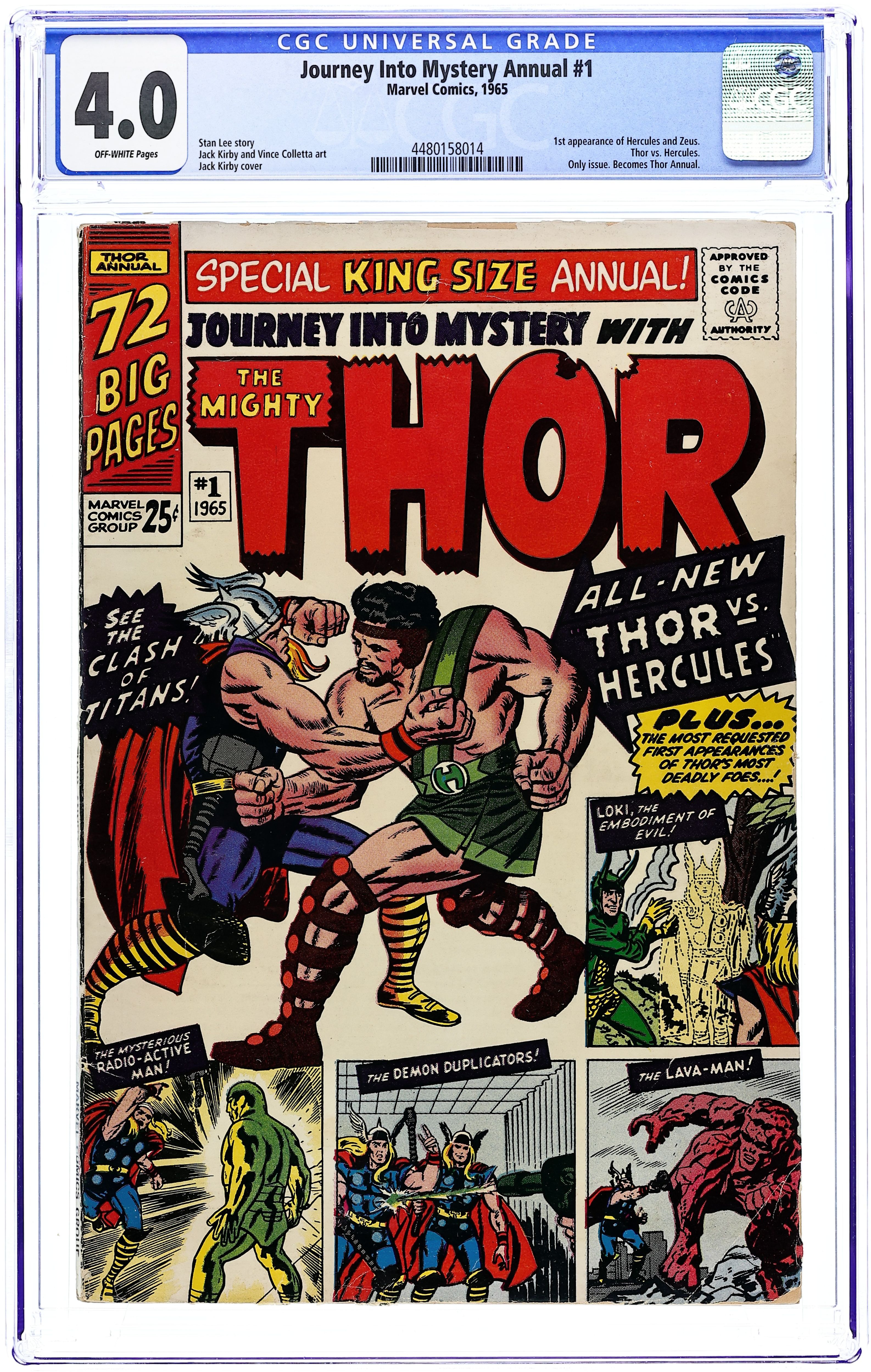 72 page giant. First appearance of Hercules in "When Titans Clash!" Cover by Jack Kirby. Script by Stan Lee, pencils by Jack Kirby, inks by Vince Colletta. Loki appearance. This issue also includes a diagram of Asgard and Thor reprints: "Trapped by Loki, the God of Mischief" (from Journey Into Mystery 85); "The Mysterious Radio-Active Man" (JIM 93); "The Demon Duplicators" (JIM 95); and "The Mighty Thor Battles the Lava Man" (JIM 97). Kirby cover. 76 pages, full color. Cover price $0.25.