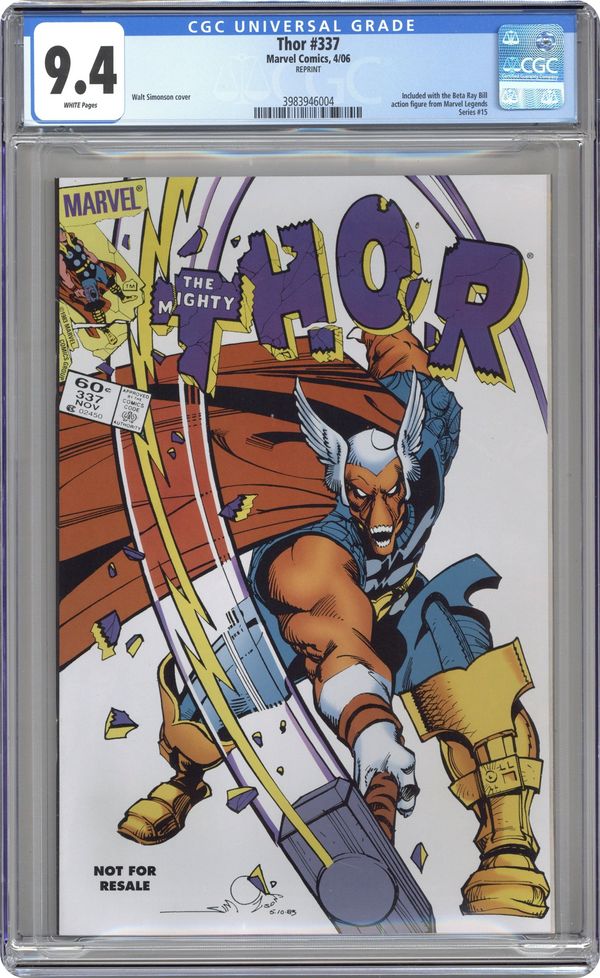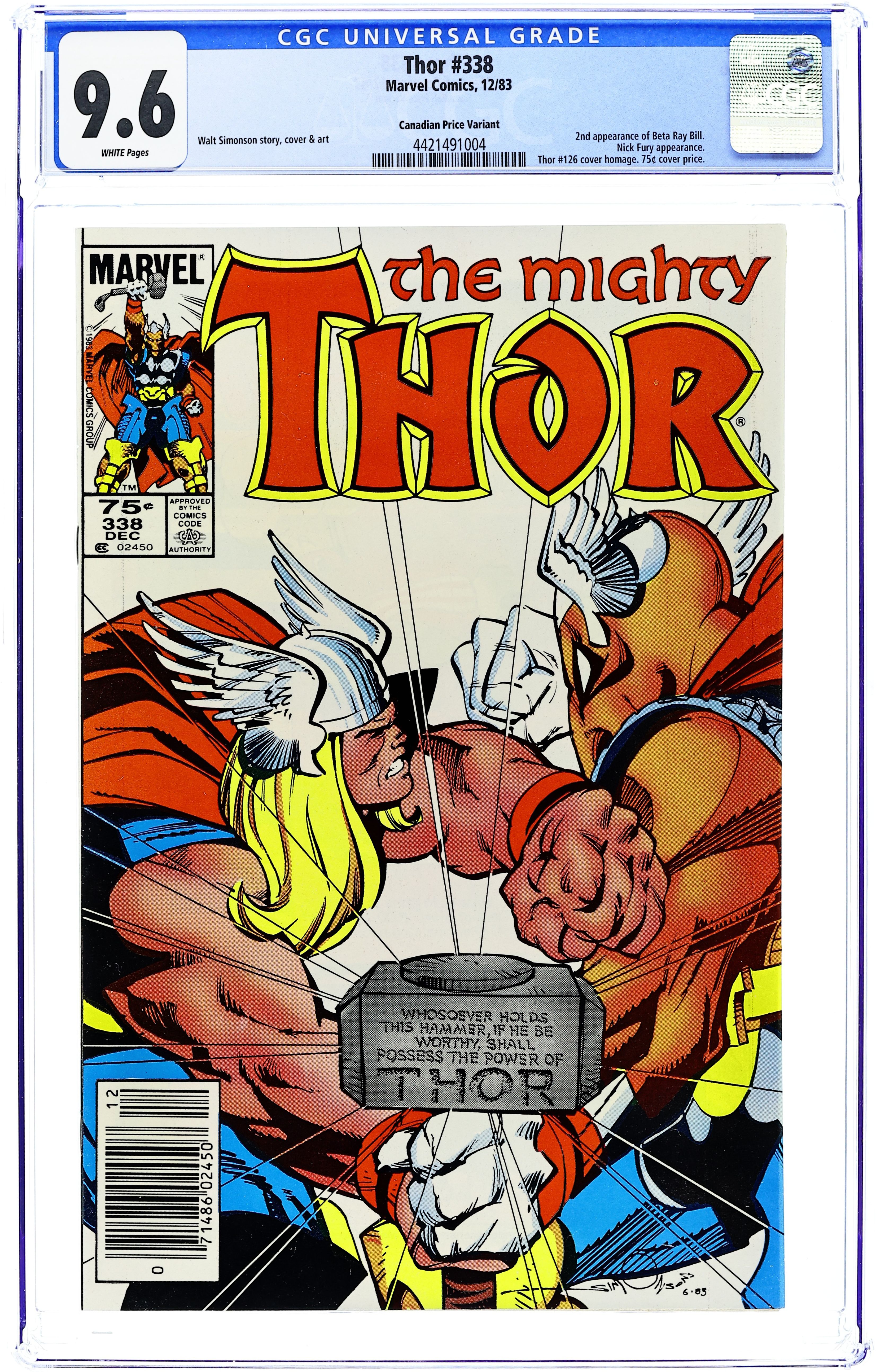 Canadian edition with $.75 cover price. Cover by Walt Simonson. Beta Ray Bill (first appearance) becomes Thor in "Doom!", script and art by Walt Simonson; Nick Fury asks Thor's aid in investigating an alien ship heading for earth; Thor arrives and triggers the awakening of an alien protector, Beta Ray Bill; Bill bests Thor and takes up his hammer only to be accidentally summoned to Asgard by Odin who thinks he is summoning Thor. Brief appearances by Nick Fury, Loki, Sif, Balder, Heimdall, Volstagg, and Odin. First appearance of Lorelei (sister of the Enchantress). Begins Walt Simonson's run on Thor (through #382). Bullpen Bulletins. Star Frontiers TSR ad. 36 pgs., full color. Cover price $0.75.
