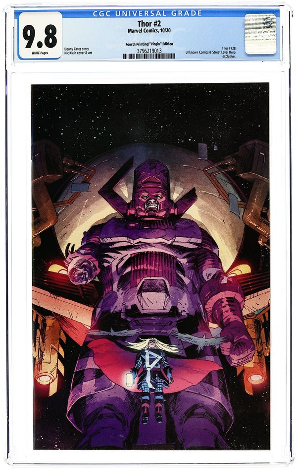 Limited 1 for 25 Retailer Incentive Variant Cover. Written by Donny Cates. Art by Nic Klein. Cover by Ryan Stegman. THOR'S GREATEST ENEMY - AND THE UNIVERSE'S ONLY SAVIOR - REVEALED! The Black Winter is coming - the end of the entire vast universe - and only one entity can stop it. The only one who has survived it before, Galactus the World-Eater, has come to Midgard…in search of a herald for the end of everything. 28 pages, full color. Rated T+ Cover price $3.99.