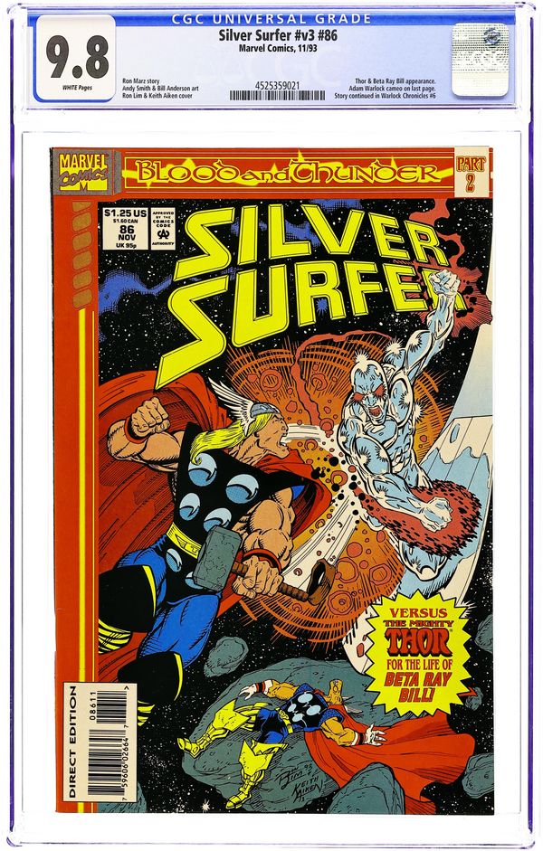 Direct Edition. Blood and Thunder. Part 2 of 13. "Friends and Foes!" Guest-starring Thor and Beta Ray Bill. Adam Warlock cameo. Story by Ron Marz. Art by Andy Smith and Bill Anderson. Cover by Ron Lim and Keith Aiken. Story continued from Thor 468. Seduced by the whispers of the Dark Valkyrie, the Mighty Thor has gone mad. He has beaten his oath-brother Beta Ray Bill almost to death, and now he must face the Silver Surfer and the Power Cosmic. Story continues in Warlock Chronicles #6. 32 pages. Cover price $1.25.