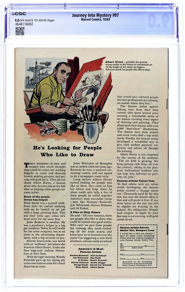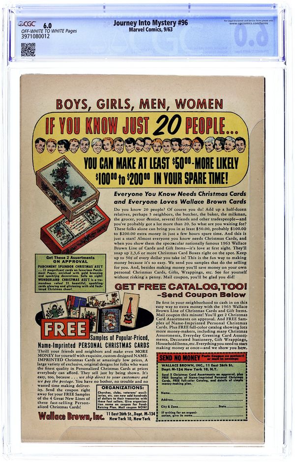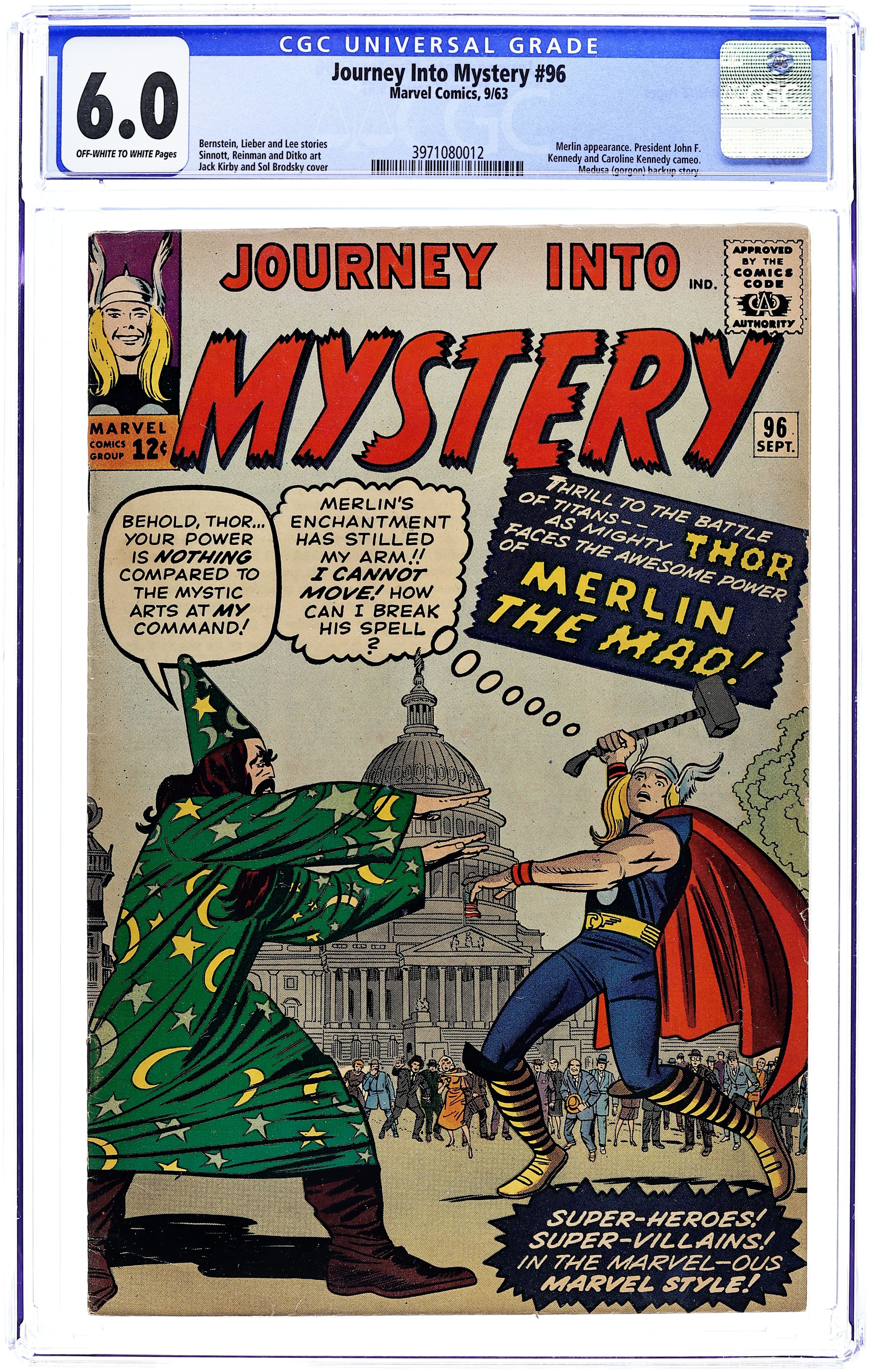 Cover pencils by Jack Kirby, inks by Sol Brodsky. "Defying the Magic of... Mad Merlin!", script by Stan Lee (plot) and Robert Bernstein (script), art by Joe Sinnott; Merlin is awakened after a thousand years and immediately decides to try and take over the world; He battles Thor using familiar Washington D.C. monuments; Jane Foster appearance; Cameos by King Arthur and his knights, John F. Kennedy, Pierre Salinger, and Caroline Kennedy. The first half of a two-page text story, "The Traveler." "Call Her...Medusa!":, script by Stan Lee (plot) and Larry Lieber (script), pencils by Larry Lieber, inks by Paul Reinman; The gorgons of myth were aliens and send an agent to modern Earth preceding an invasion. "Frederick Fenton's Future!", script by Stan Lee, art by Steve Ditko; An arrogant rich man builds a time machine in order gain the secret to eternal life from the future. 36 pgs., full color. $0.12. Cover price $0.12.
