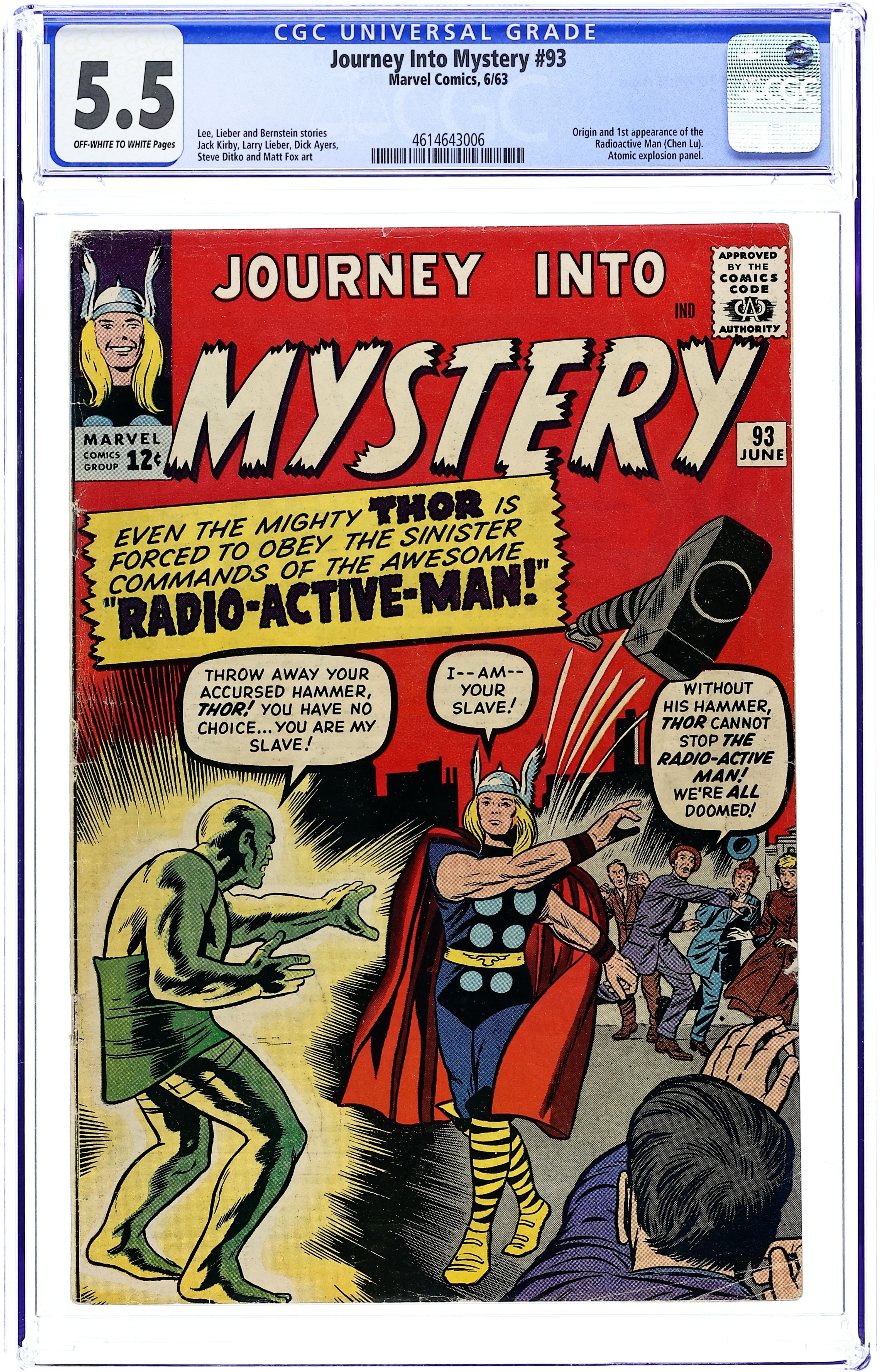 Cover pencils by Jack Kirby, inks by Dick Ayers. "The Mysterious Radio-Active Man!" (first appearance), script by Stan Lee (plot) and Robert Bernstein (script), pencils by Jack Kirby, inks by Dick Ayers; While on a medical mission to India, Dr. Blake becomes Thor to repel a Chinese attack; In order to fight Thor, a Chinese scientist irradiates himself to gain great power. "Over the Moon" two-page text story. "The Man Who Wouldn't Die!", script by Stan Lee (plot) and Larry Lieber (script), pencils by Larry Lieber, inks by Matt Fox; A selfish billionaire builds a fallout shelter deep beneath the Earth's surface, but when he insists on touring it alone he discovers a group of primitive humans that attack him and collapse the tunnel, trapping him. "I Saw a Martian!", script by Stan Lee, art by Steve Ditko; A man cannot convince the police that he saw an alien ship land. 36 pgs., full color. $0.12. Cover price $0.12.