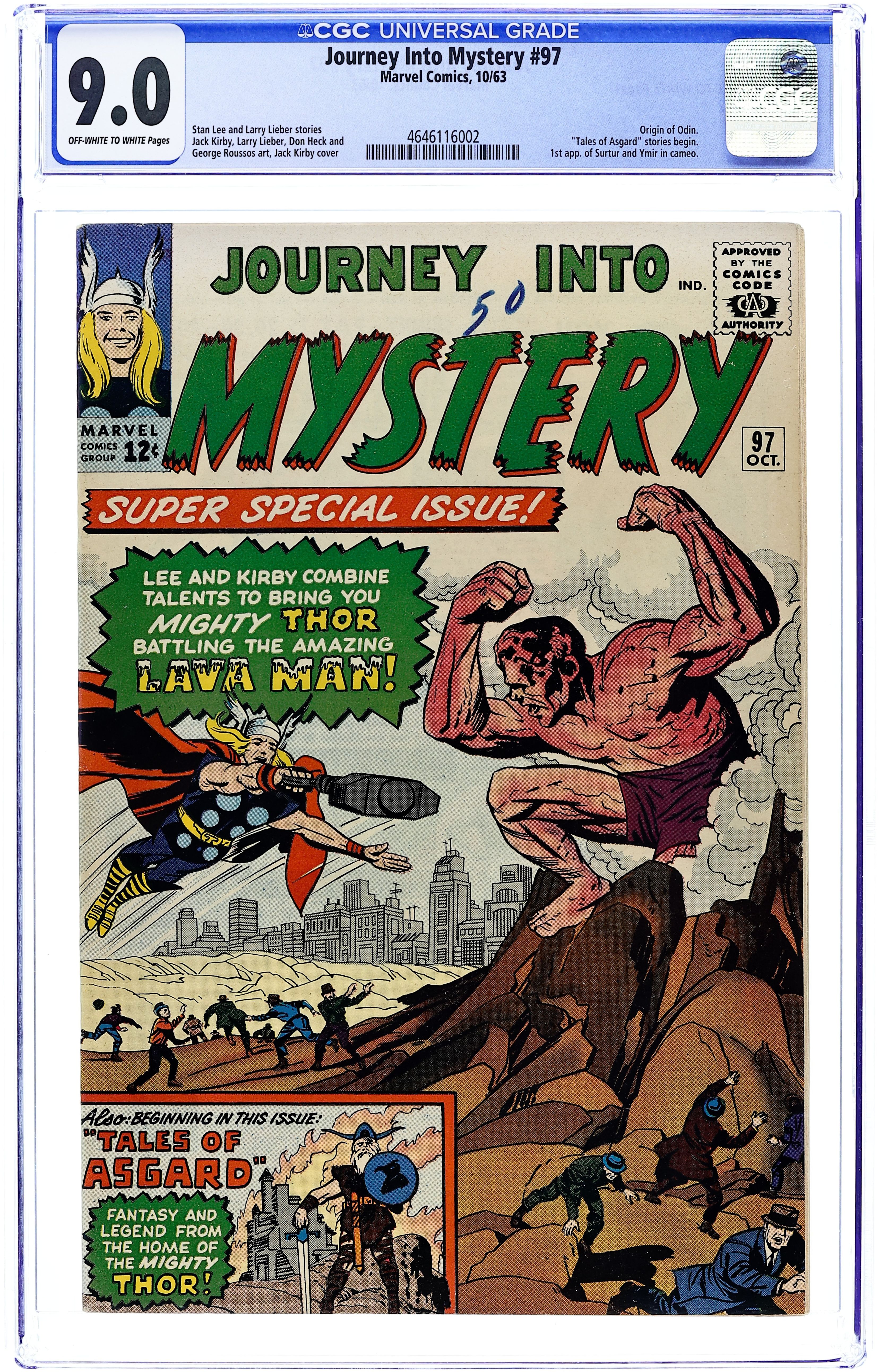 Cover pencils by Jack Kirby, inks by George Roussos. First appearance of the Lava Man in "The Mighty Thor Battles the Lava Man!", script by Stan Lee, pencils by Jack Kirby, inks by Don Heck; Thor battles the Lava Man, a monster brought to the surface by Loki, who claims all the dry surface of Earth for his people; Odin forbids Thor to love Jane Foster, leading to her leaving her job as Dr. Blake's nurse. "The Traveler" text story. "The Perfect Defense!", script by Stan Lee (plot) and Larry Lieber (script), pencils by Larry Lieber, inks by George Roussos (as George Bell); In the future, Earth has conquered all planets except one, which no expedition returns from; The military thinks they have some horrific defense, but in fact they are simply so kind to the humans that arrive to conquer that they don't want to leave. "Tales of... ...Asgard! Home of the Mighty Norse Gods," script by Stan Lee, pencils by Jack Kirby, inks by George Roussos (as G. Bell); Beneath Asgard lies the Well of Life. From it came Ymir, greatest of the Frost Giants and Buri, the first Norse God who gave life to Borr. Borr had three sons. Odin was one of them. 36 pgs., full color. Cover price $0.12.