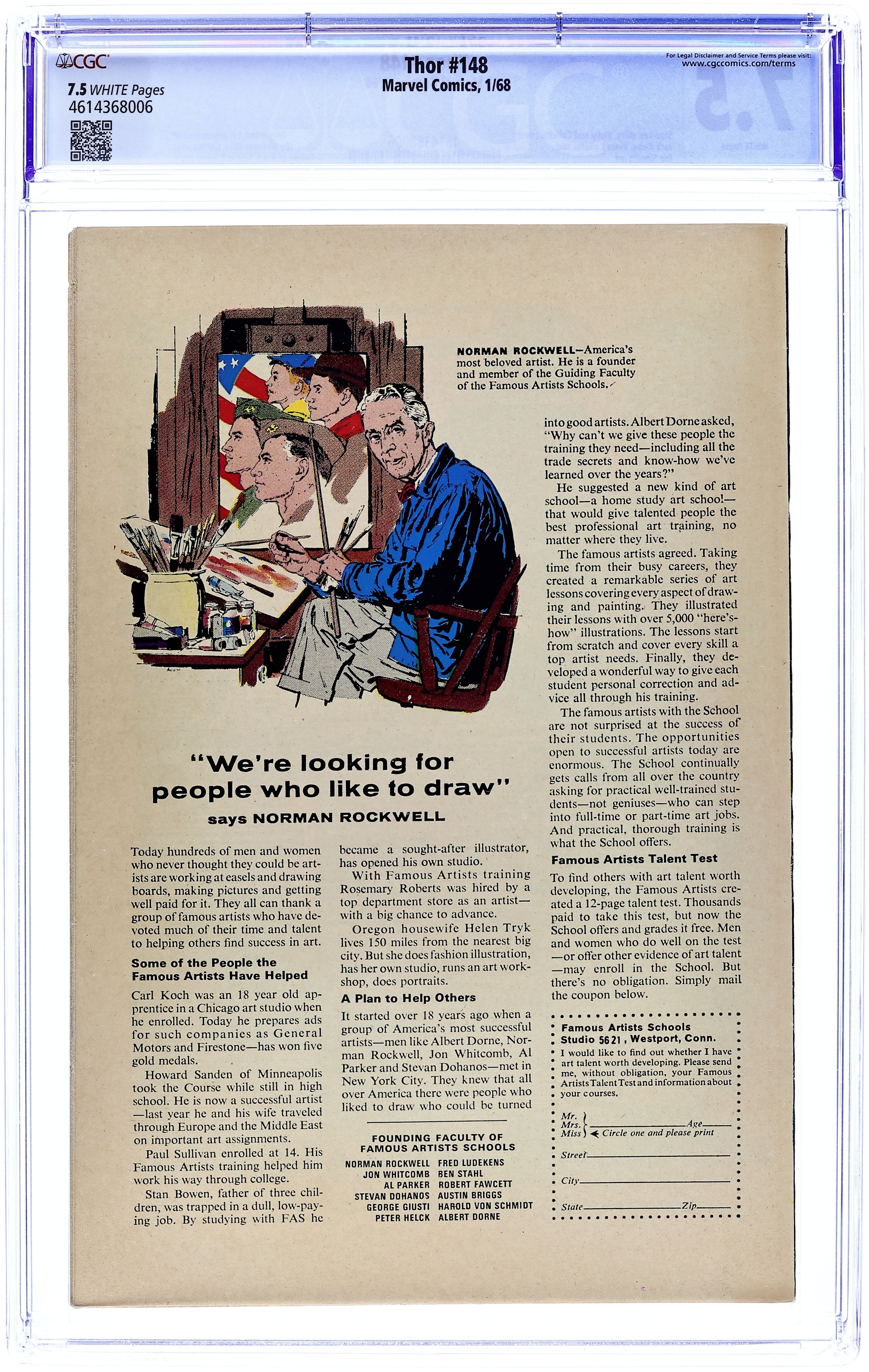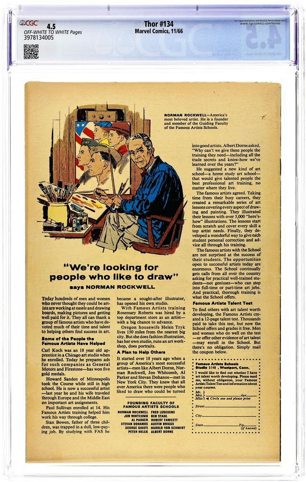 Ends Dec 8 9:42 PM CST Bid History 6 bids Current Bid $39 Your Secret Max Bid If you'd like to bid, please log in or register. Cover pencils by Jack Kirby, inks by Vince Colletta. Pluto (from Red Raven Comics #1, August 1940) is reintroduced in "The Hammer and the Holocaust!", script by Stan Lee, pencils by Jack Kirby, inks by Vince Colletta; The weakened and defeated Thor returns to Asgard where he finds Seidring has taken over; He battles the 'odin power' and defeats Seidring only to collapse himself. Appearances by Odin, Hercules, Jane Foster, Balder, and Heimdall. Marvel Bullpen Bulletins. Tale of Asgard: "The Meaning of... Ragnarok", script by Stan Lee, pencils by Jack Kirby, inks by Vince Colletta; The Asgardian gods have returned to Asgard where the prophetess Vollo relates the coming of Ragnarok! Odin and Balder appearances; Heimdall and Fandral cameos. 36 pgs., full color. $0.12. Cover price $0.12.