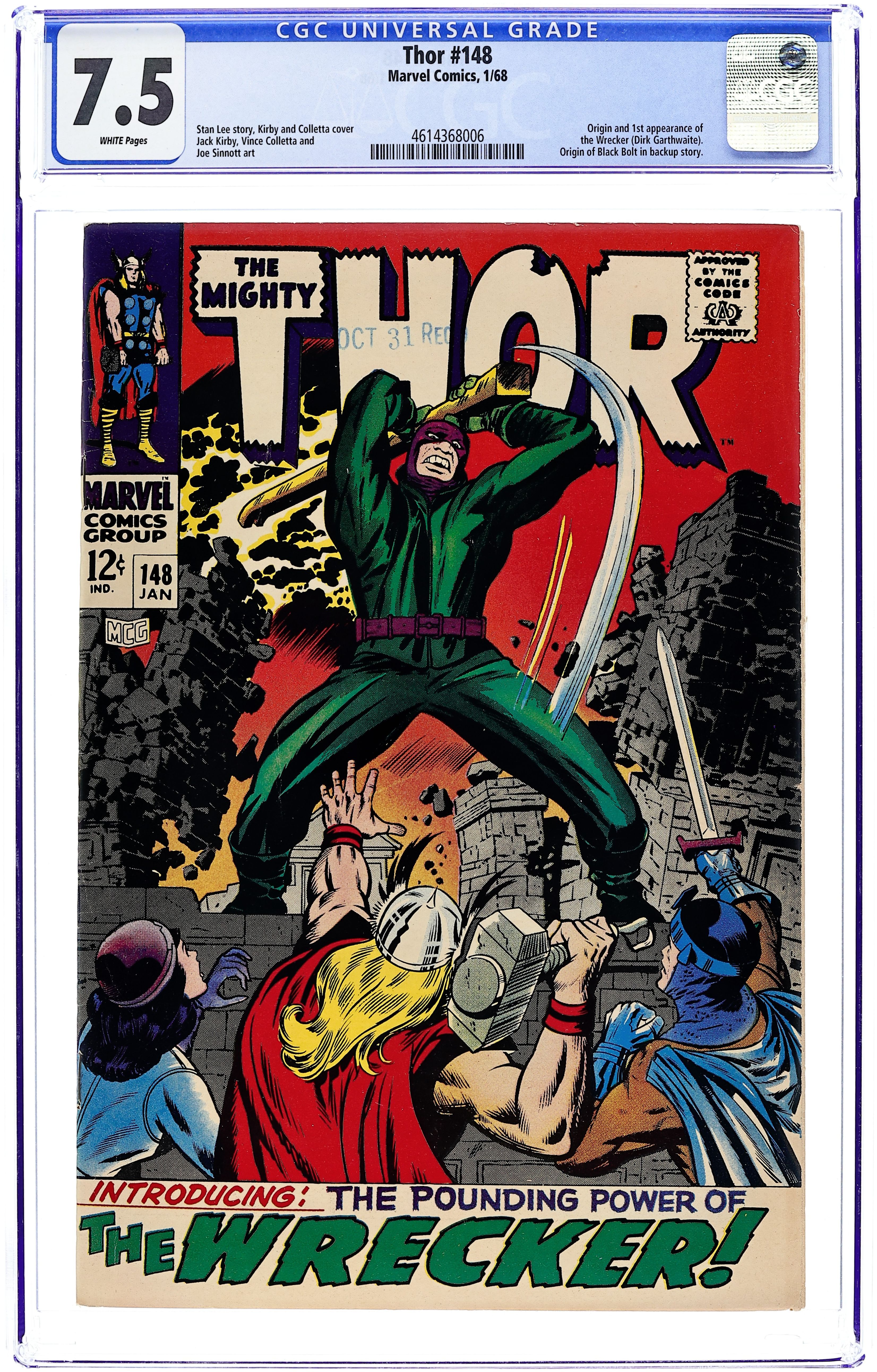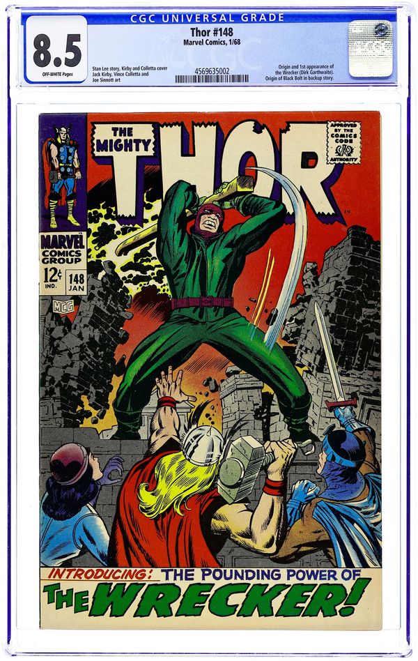Cover pencils by Jack Kirby, inks by Vince Colletta. First appearance of the Wrecker in "Let There Be... Chaos!", script by Stan Lee, pencils by Jack Kirby, inks by Vince Colletta; All the Asgardians on earth have their powers removed by Odin; Loki, trying to get power from Karnilla, accidentally creates the Wrecker who attacks Thor. Appearances by Balder, Sif, Odin, and Loki. Spider-Man cameo. Origins of the Inhumans back-up: "And Finally: Black Bolt!", script by Stan Lee, pencils by Jack Kirby, inks by Joe Sinnott; Agon and Rynda have altered their infant son's genetic pattern to give him the powers of levitation and electron manipulation, but they discover that he has a more dangerous and destructive power in his voice. 36 pgs., full color. $0.12. Cover price $0.12.