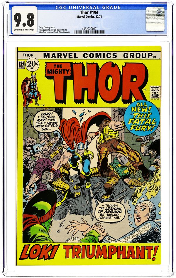 First 20-cent cover price. Cover pencils by John Buscema, inks by Frank Giacoia. "This Fatal Fury!", script by Gerry Conway, pencils by John Buscema, inks by Sal Buscema; Attempting to prevent the force marriage between Loki and Sif, Thor is knocked away from his hammer, as the 60 second limit ticks down, Thor is at risk of changing back into Donald Blake as three Storm Giants approach for the kill; One of the Storm Giants grabs Thor, however is forced to drop him when the transformation between Thor and Blake shocks the giants hand; This gives Donald Blake a moment to rush toward Thor's hammer and reclaim it and resume his Godly form. "The Golden Apples!", script by Stan Lee, pencils by Jack Kirby, inks by Vince Colletta; Asgardian version of Little Red Riding Hood; reprinted from Journey into Mystery #114. 36 pgs., full color. $0.20. Cover price $0.20.