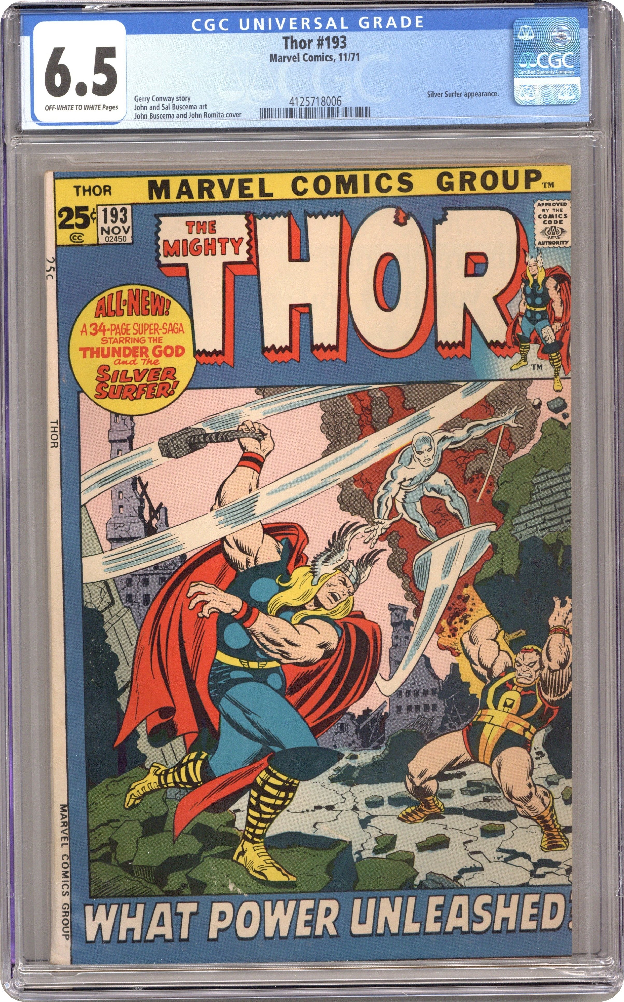 48-page giant. Cover pencils by John Buscema, inks by John Romita. "What Power Unleashed?", script by Gerry Conway, pencils by John Buscema, inks by Sal Buscema; High atop Mount Everest, Blader and Karnilla have summoned the Silver Surfer to come to the aid of Thor, who is now battling Durok, a powerful mystical creature created by Loki; The Surfer, after many betrayals from humans is apathetic to Balder's pleas for help, telling the God that he has no interest in the affairs of humans; Balder furiously pleads with the Surfer, telling the Zennlavian that he would give his life to Thor; Hearing this, Karnilla painfully reminds Balder that his life is sworn to her and her only; This prompts the Surfer to get involved, and when Karnilla is unable to strike the Surfer down, she frees Balder from the rocky confines she is crushing him in and the Surfer uses his Power Cosmic to heal him; Karnilla realizes to her horror what she had almost done and wonders if she would ever be deserving of Balders love. 52 pgs., full color. $0.25. Cover price $0.25.