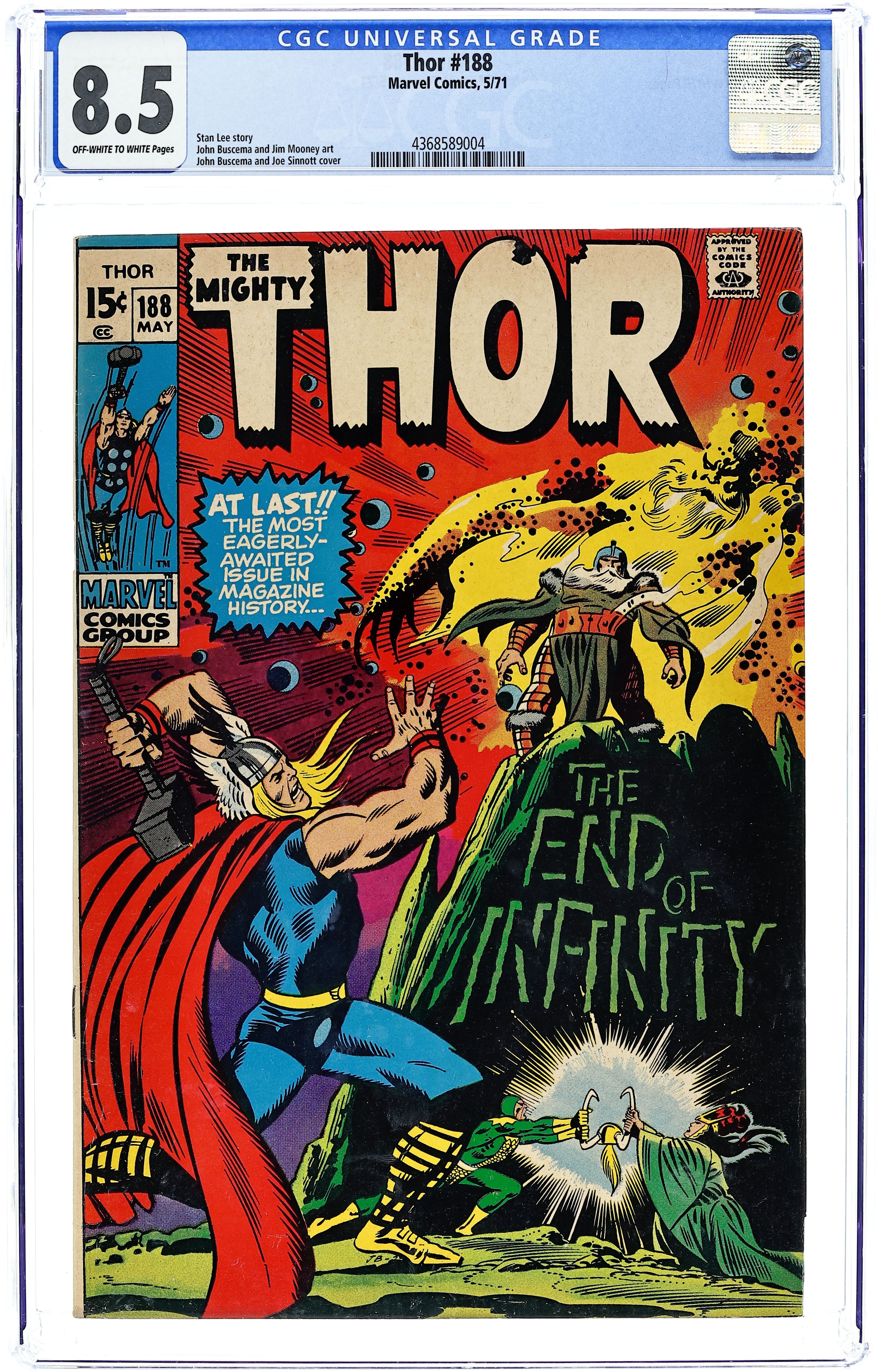 Cover pencils by John Buscema, inks by Joe Sinnott. "The End of Infinity!", script by Stan Lee, pencils by John Buscema, inks by Jim Mooney; As Odin fights for Infinity, the assembled warriors of Asgard fear for the worse as Infinity continues to absorb the universe into his World Beyond; The Odinsword continues it's slow progression out of its scabbard, and chaos erupts all over Earth and the unknown universe, including Asgard as Trolls and Giants storm the gates of the great kingdom; Balder and the Warriors Three go out to defend their home while Thor tells Sif the origins of Infinity. 36 pgs., full color. $0.15. Cover price $0.15.