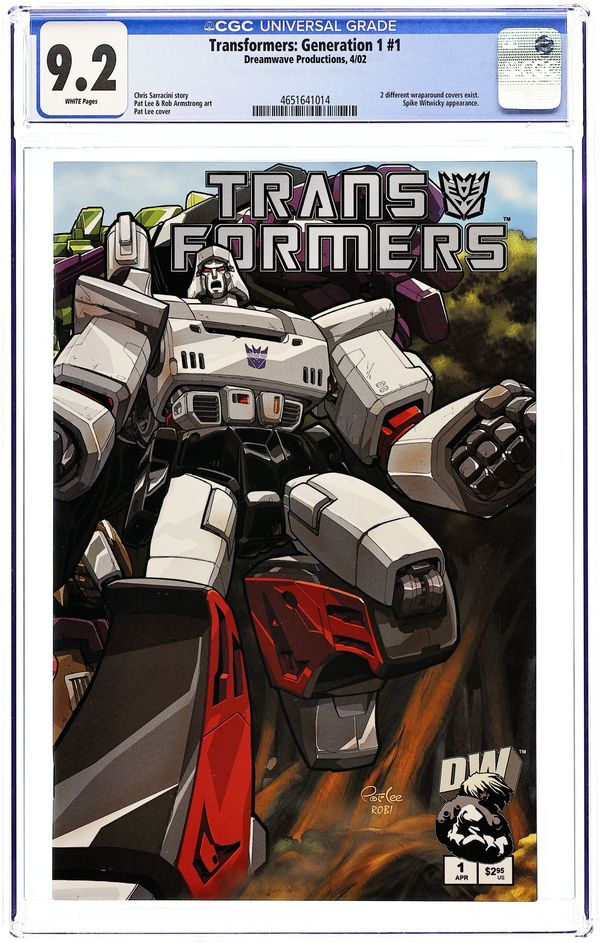 Ends Dec 8 9:48 PM CST Bid History 5 bids Current Bid $6 Your Secret Max Bid If you'd like to bid, please log in or register. Decepticon Cover! By Sarracini, Lee & Garcia, Armstrong, & TheRealT! The wait is finally over! Dreamwave presents the triumphant return of The Transformers! Long thought dead by the inhabitants of Earth, we discover that the classic metal warriors of Generation 1 are far from gone. But where have they been for so long, and why only now have they chosen to return? And who is the mysterious man called Lazarus and what is his plan? Issue #1 promises all of the intrigue, action and excitement Transformers fans have waited so long to see! Transformers: Generation 1 #1 is the first issue of a 6-issue mini-series that marks their victorious return to comic books. The fun and mayhem begin here. Don't miss out! This issue will feature two wraparound covers by Pat Lee shipped in an equal ratio! Transformers: Generation 1 #1 is also available in a Previews Exclusive wraparound holofoil cover by James Raiz! Cover price $2.95.
