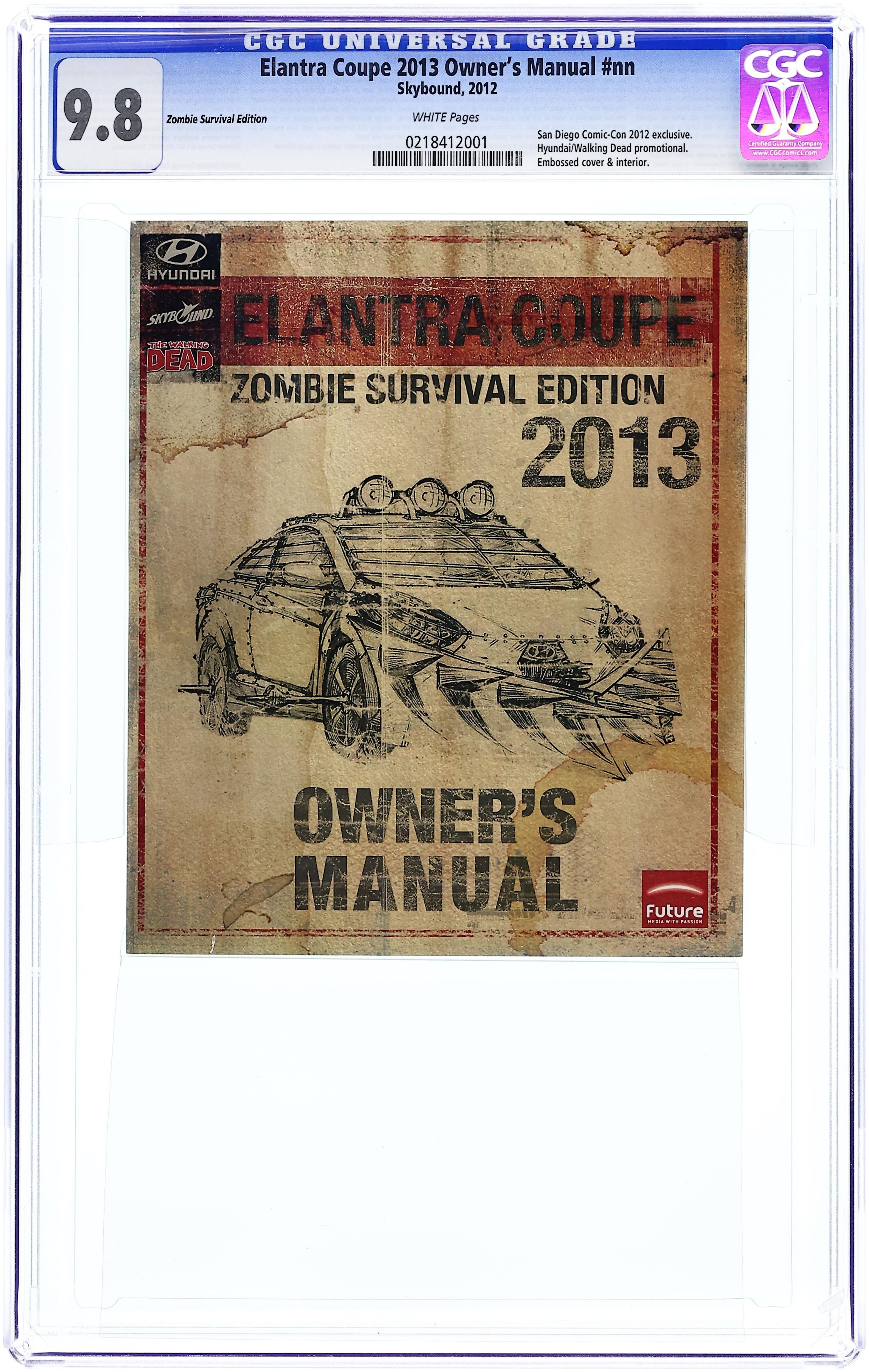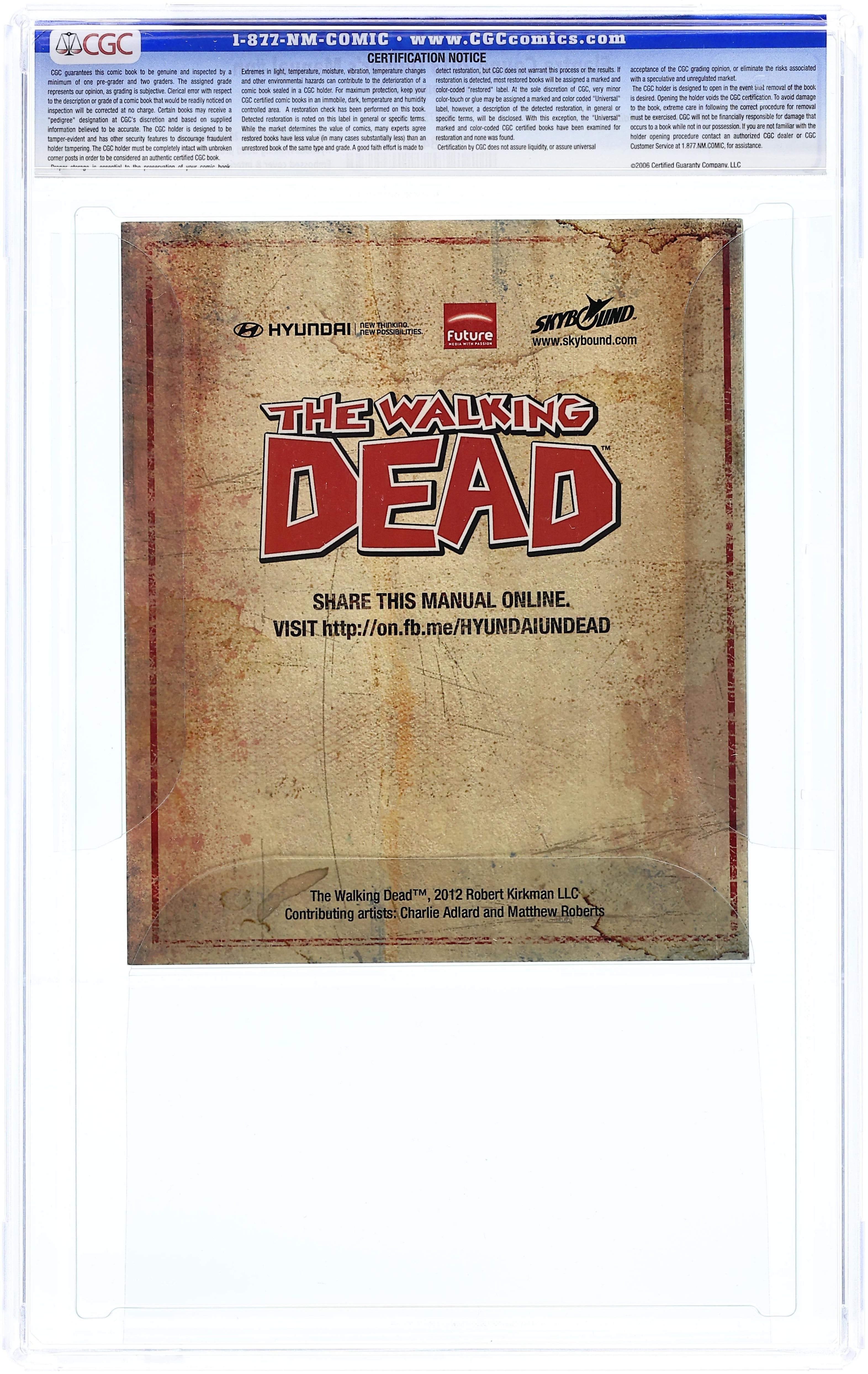 This is the promotional manual/survival guide for a custom-made "zombie-proofed" Hyundai Elantra designed by Robert Kirkman and displayed at the 2012 San Diego Comic Con. Including zombie artwork by Charlie Adlard and Matthew Roberts, the manual was limited to around 500 copies distributed exclusively at SDCC 2012. The Hyundai Undead program celebrated the release of the 100th issue of The Walking Dead comic.