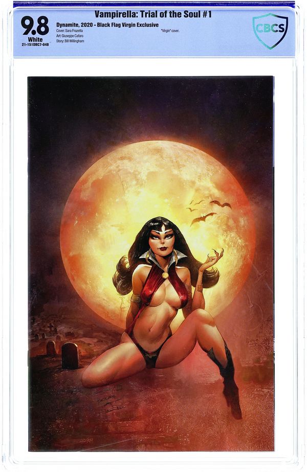 Black Flag Comics Exclusive Virgin Cover by Sara Frazetta. Written by Bill Willingham. Art by Giuseppe Cafaro. Does Vampirella have a soul? That is the question being asked by an immortal wizard-king who has come to determine her fate. If she does, she will be spared. If not, he must destroy her. No matter how charming he finds her... This can't-miss standalone tale introduces the latest member of Vampi's spine-tingling rogues' gallery! 40 pages, full color. Rated T