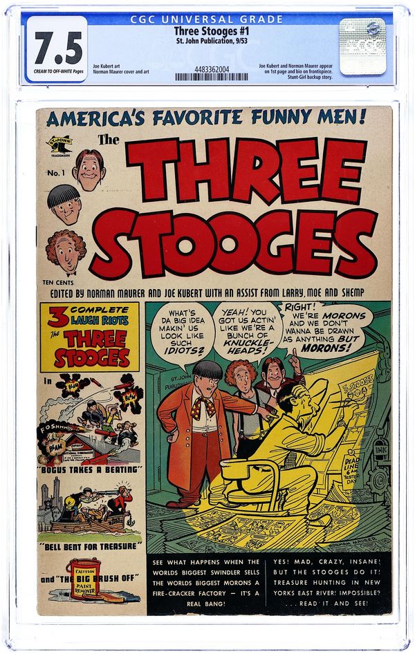 Starts Jan 3 Cover by Norman Maurer. Stories and art by Joe Kubert, Norman Maurer and Sandy Woolf. St. John, a pioneer of celebrity comics, puts Moe, Larry and Shemp on the four-color page. The world's biggest swindler sells the Stooges a firecracker factory, and it's only a matter of time until everything blows sky-high. The Stooges go treasure hunting in the East River. Action girl Jeanie finds trouble on the set when a jealous actress tries to have her eliminated, in a story with early art by comics legend Joe Kubert. Bogus Takes a Beating; Bumps for the Umps; Big Brush Off; Jeanie Steele, Hollywood Stunt-Girl; Bell Bent for Treasure. 32 pages, Full Color. Cover price $0.10.