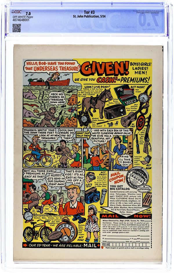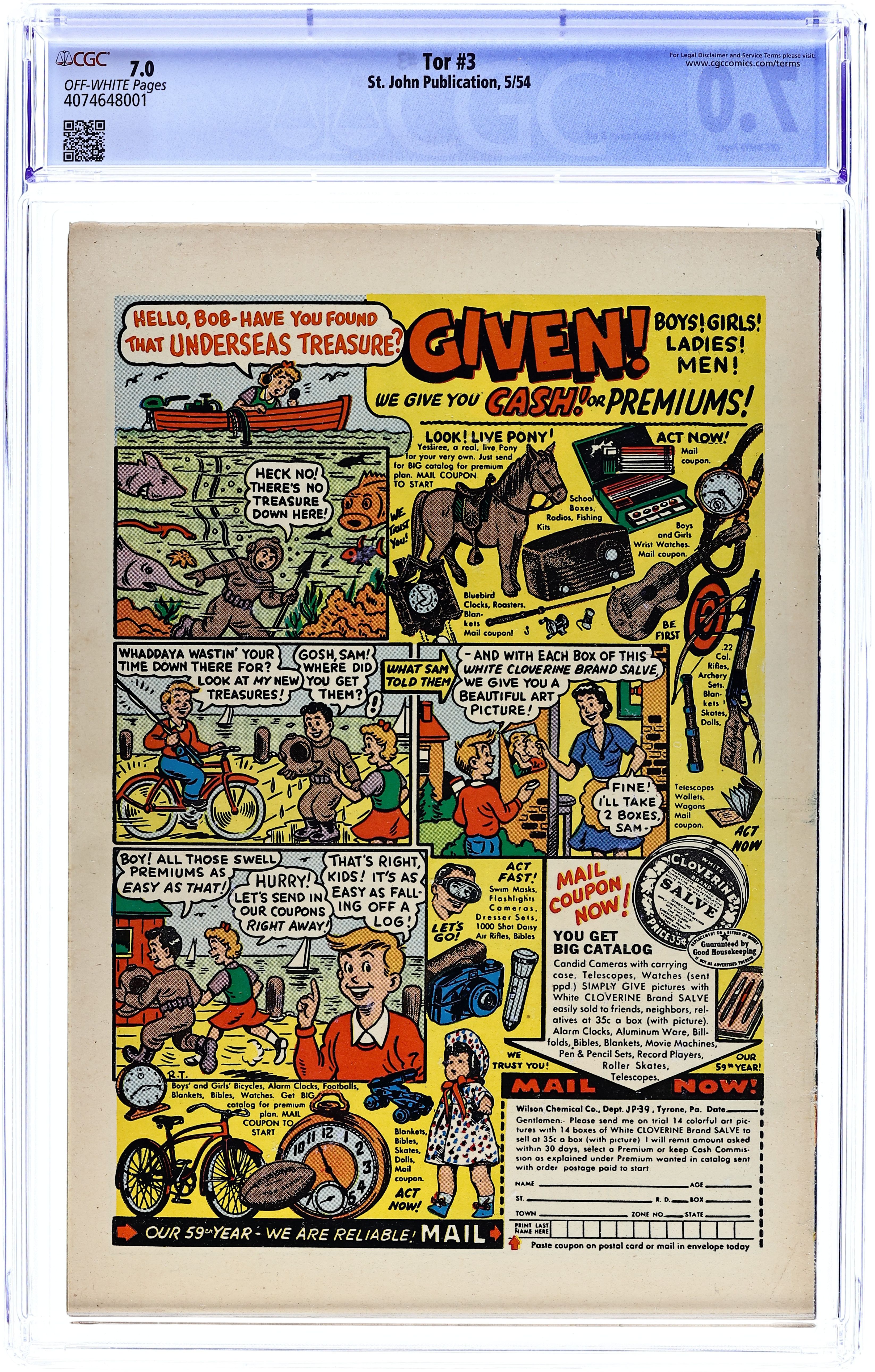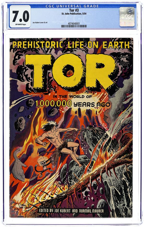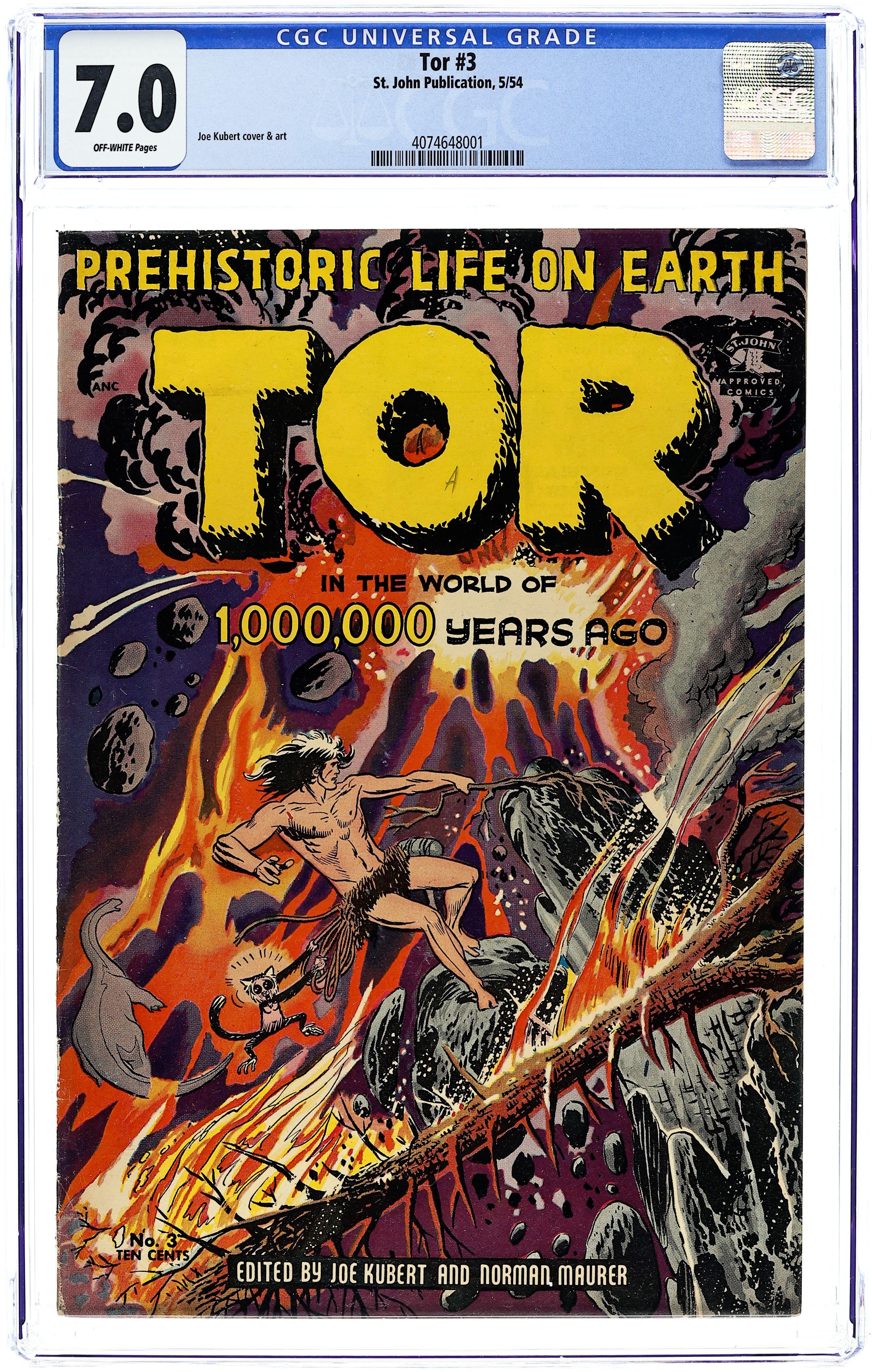 Cover by Joe Kubert. Stories and art by Joe Kubert, Alex Toth and Norman Maurer. Numbering continues from 3-D Comics Tor (1953 St. John) #2C. Comics legend Joe Kubert won fans early in his career with his tales of Tor, a caveman struggling for survival in a world where humans co-exist with dinosaurs. Tor tries to help a tribe escape a volcanic island that is collapsing into the sea. Tor defends a village from the raiding Flatnose tribe, and helps an all-female tribe settle differences with their neighbors. Co-creators Joe Kubert and Norman Maurer put themselves into the comic to discuss the science and history of the Tor series. Plus full-page dinosaur illustrations (including a pteranodon) by Kubert. Isle of Fire!; Snow Trap; Black Valley; 1,000,000 B.C. History of Prehistoric Animals: Pteranodon, Tylosaurus; Danny Dreams. 32 pages, Full Color. Cover price $0.10.