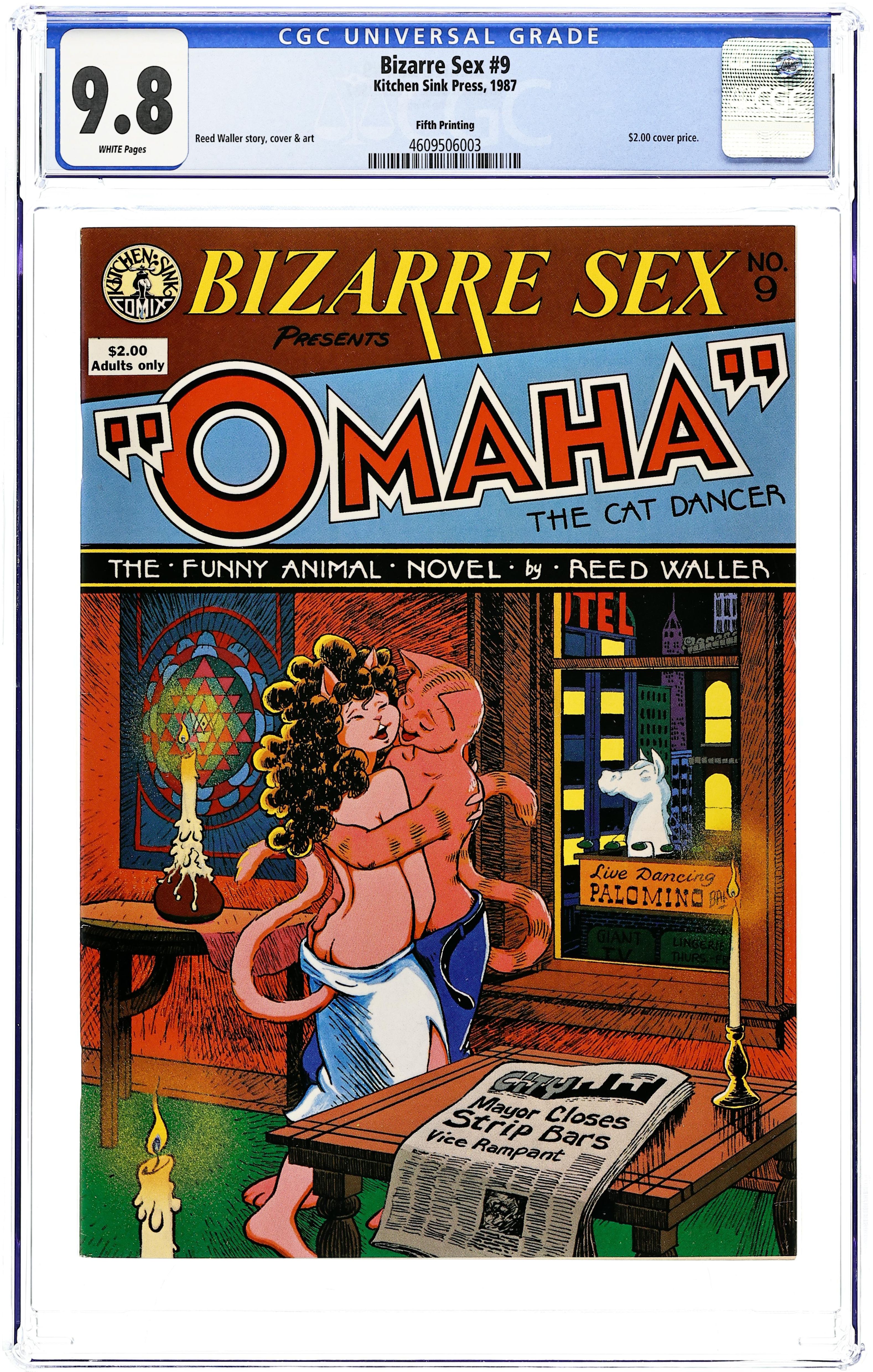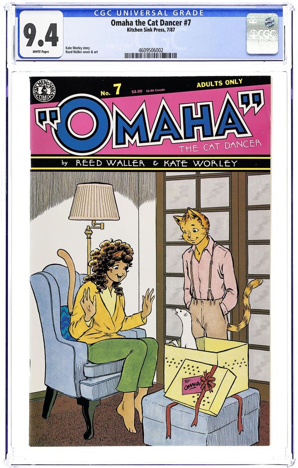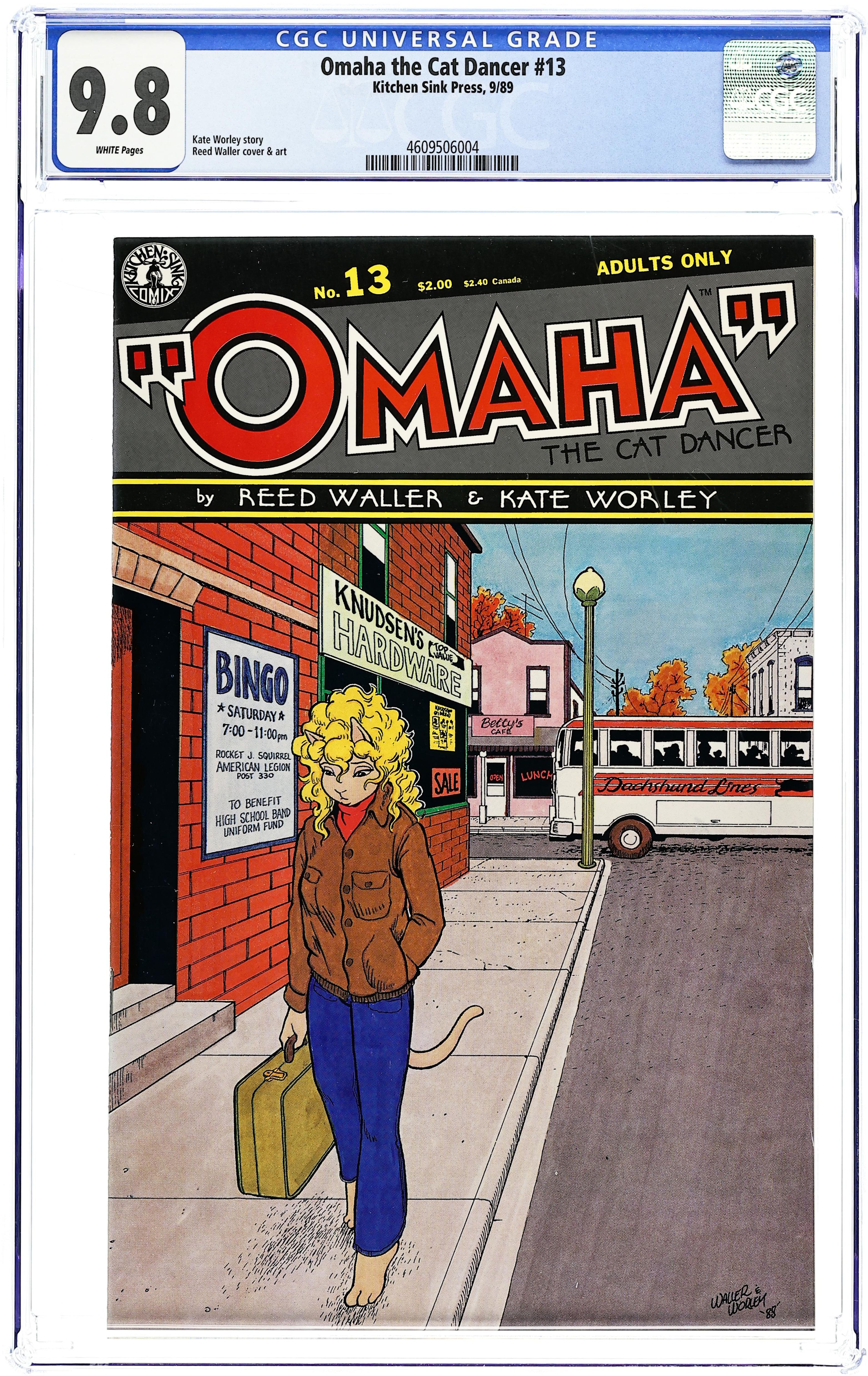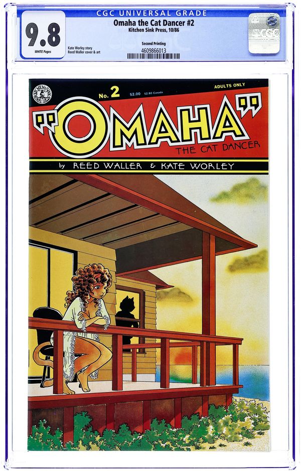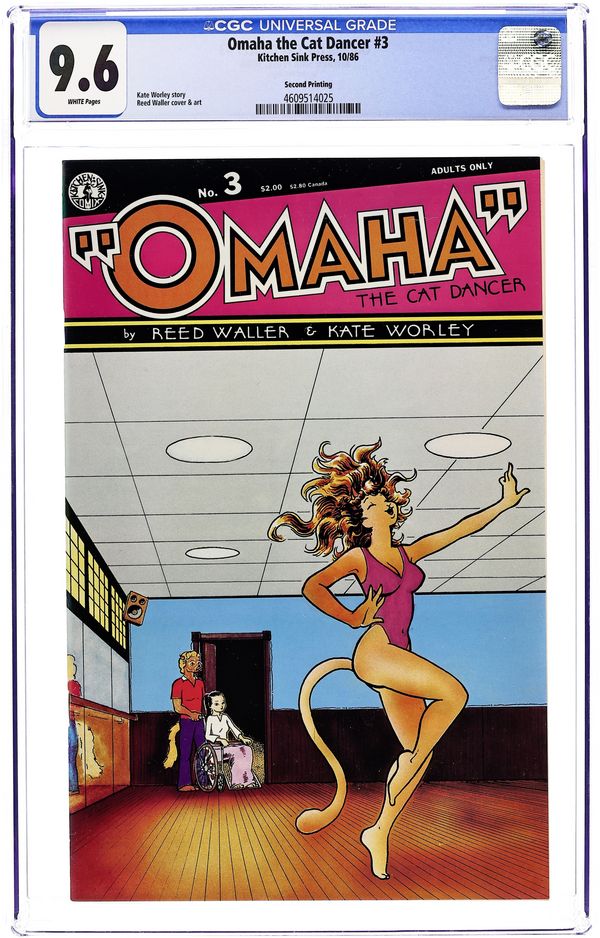 2nd or later printing by Kitchen Sink or Fantagraphics. Previously printed by Steeldragon Press. "Omaha" the Cat Dancer is an erotic comic strip and later comic book created by artist Reed Waller and writer Kate Worley. Set in fictional Mipple City, Minnesota in a universe populated by anthropomorphic funny animal characters, the strip is a soap opera focusing on Omaha, a feline exotic dancer, and her lover, Chuck, the son of a business tycoon. Mature Readers. 28 pages. Cover price $2.50.