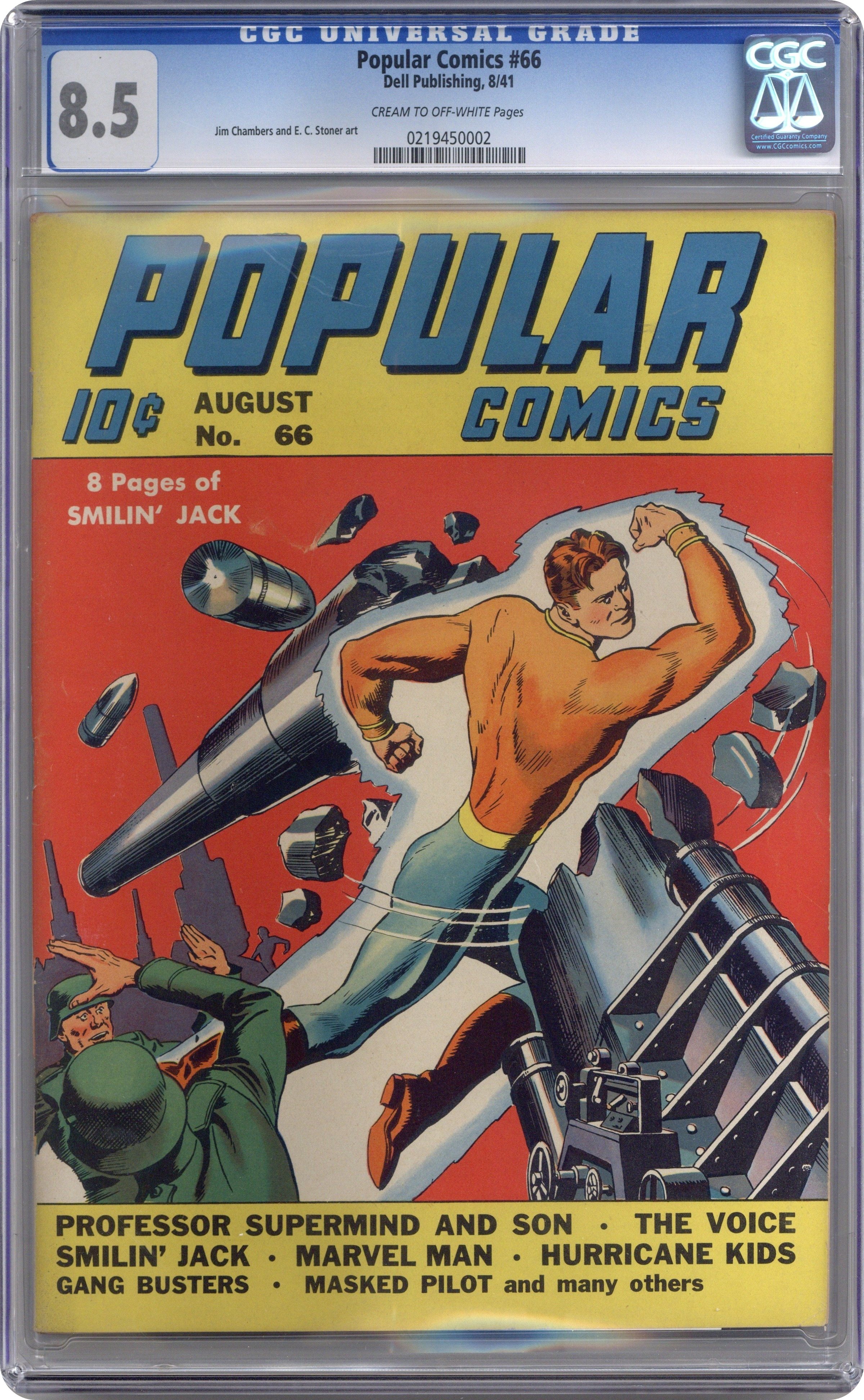 Stories and art by Frank King, Bill Holman, Zack Mosley, Boody Rogers, Maurice Kashuba, Bob Jenney, Jim Chambers, Jack Alderman, Dan Gormley, Victor Boni, Tom Hickey, Albert Hartje and Bill Ely. An early comic book from Dell, featuring reprinted newspaper comic strips alongside new material. As Frank King's Gasoline Alley returns to Popular Comics, Skeezix and his friend Tops try to go in halves on a car. But as costs add up, that gets extremely complicated. Professor Supermind and Son use all the advanced technology at their disposal to battle a foreign invasion. After Cotton goes to work for villainous Baron Bloodsoe, Smilin' Jack pursues them in a special pressurized suit for high altitudes. Plus a vintage ad for Quaker Oats merch featuring Little Orphan Annie, including a "Mysterious Magnifying Ring" featuring Annie's face. Did You Know That; Smilin' Jack; Professor Supermind and Son; The Voice, the Invisible Detective; Martan the Marvel Man; Wally Williams, American Boy; Gasoline Alley; Smokey Stover; True Spy Stories: Thompson, the Masquerading Yeoman, Yoshio Matsuda of the Japanese Navy; The Masked Pilot; Gang Busters; The Hurricane Kids. 64 pages, Full Color. Cover price $0.10.
