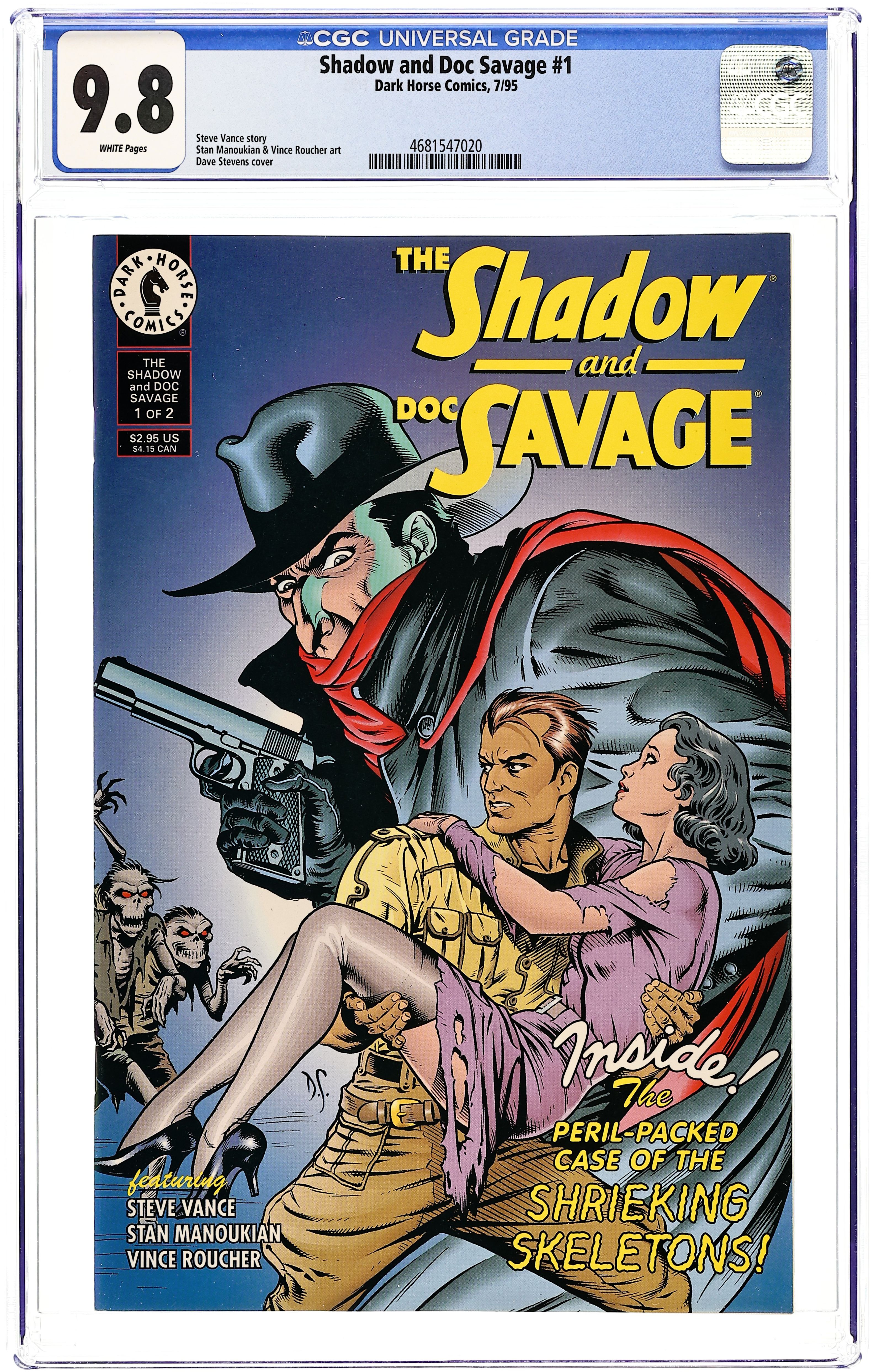 Written by Steve Vance. Art by Stan Manoukian and Vince Roucher. Cover by Dave Stevens. New York has always been a dangerous city, even as far back as the 1930s. But zombie-esque creatures and ape-like men are big news even for the Big Apple! When a gorgeous dame narrowly escapes their rotting clutches, she sends the bronze-skinned superman Doc Savage on the investigation of his lifetime! Who knows where the trail of corpses will lead? Who knows what evil lurks behind this rash of oddness? Savage isn't sure, but all fingers point to... The Shadow! FC. Cover price $2.95.