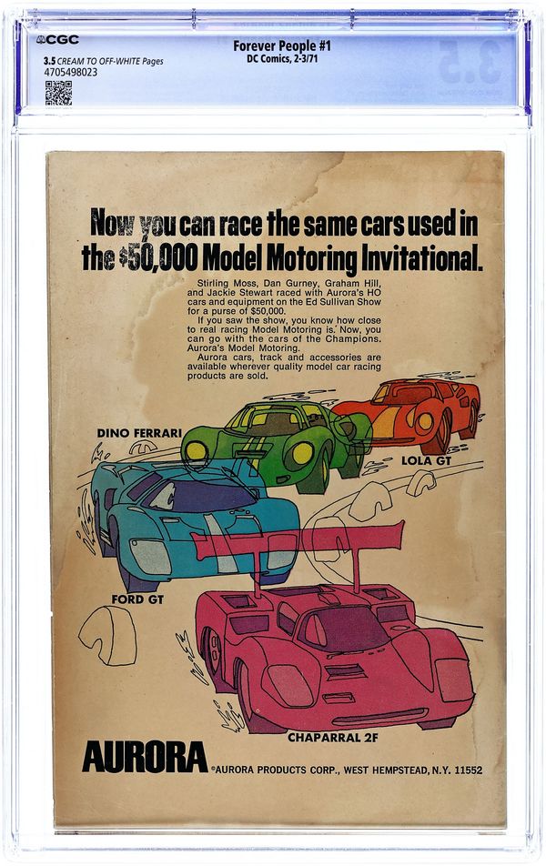 Cover pencils by Jack Kirby, inks by Mike Royer. The Power!, script and pencils by Jack Kirby, inks by Mike Royer; Billion-Dollar Bates has used his portion of the Anti-Life Equation that is lodged in his brain to force people to do his will; The Forever People are drawn to him at the same time that Darkseid is attempting to capture him. Comic-style advertisement for Aurora's "Prehistoric Scenes" family of model kits. Adventure Comics #77 ad with Sandman, pencils by Jack Kirby, inks by Joe Simon. Dreams of Doom, script and pencils by Jack Kirby, inks by Joe Simon; One of America's richest men is afraid of the dark and turns to the Sandman to solve his problem and hopefully end his horrific nightmares. 48 pgs. $0.25. Cover price $0.25.