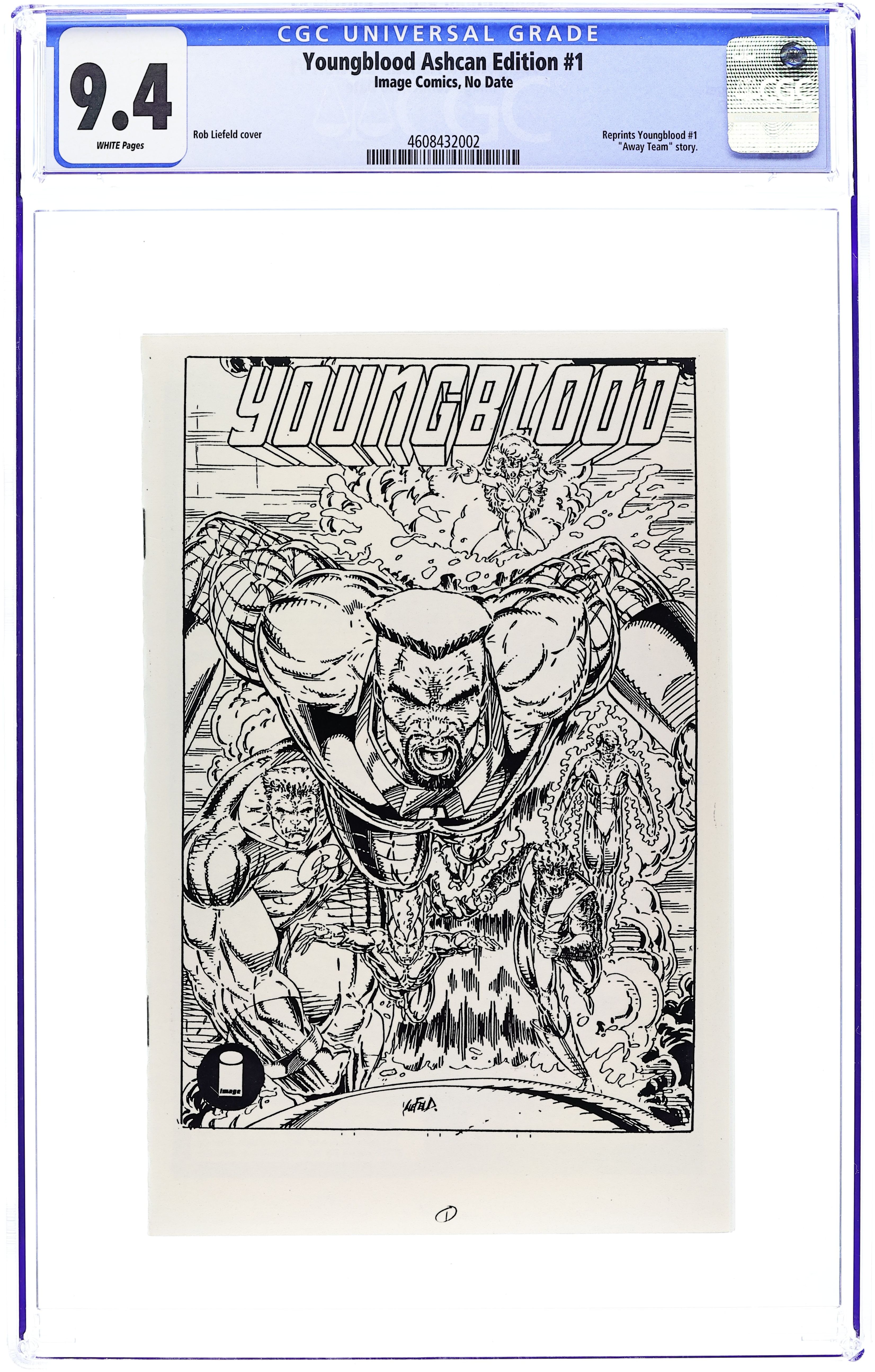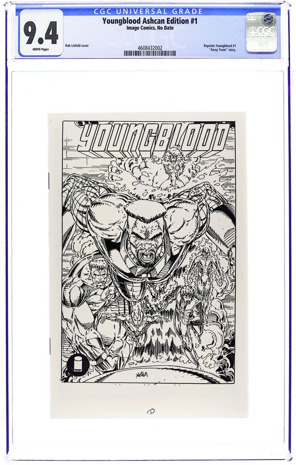 Signed by Rob Liefeld - Features the lead (B) story in Youngblood Youngblood (1992 1st Series) #1. Ashcan Edition, copyright 1991. Meet the Away Team! Sentinel, Brahma, Combat, Cougar, Psi-Fire and Riptide. First issue preview by Rob Liefeld and Hank Kanalz. 16 pg, B&W. Limited to 500 copies.