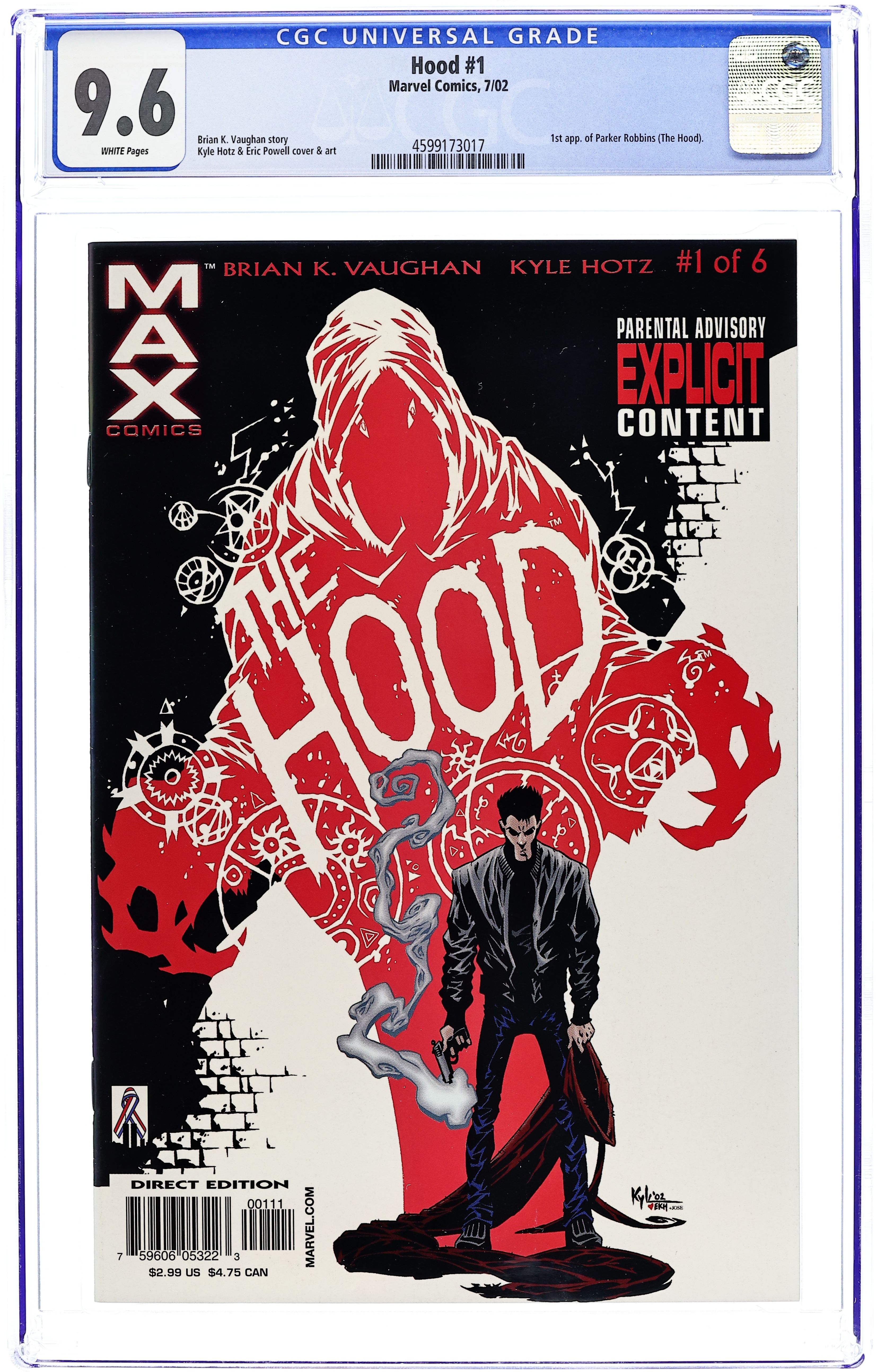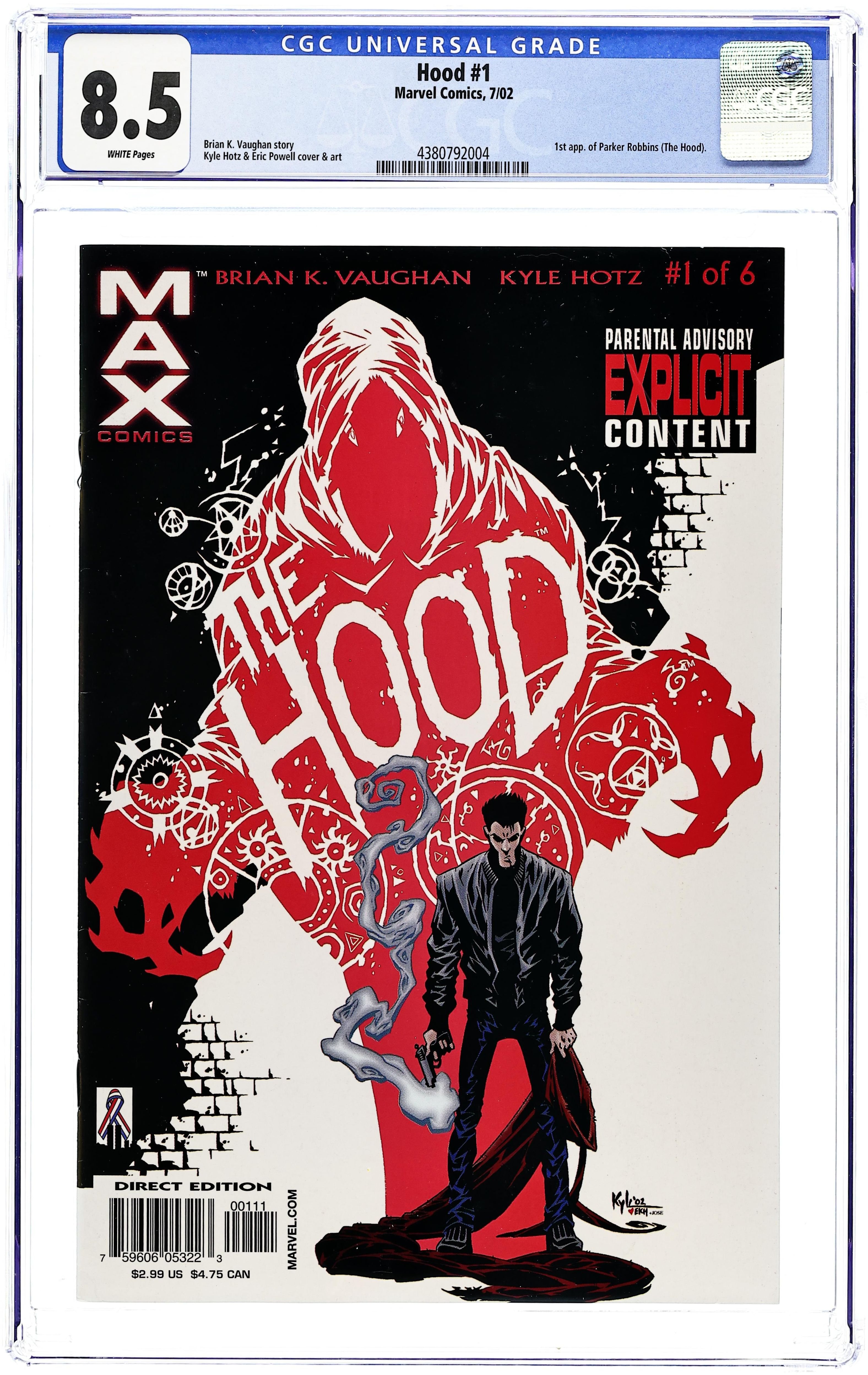 Cover by Kyle Hotz. Brian K. Vaughan (w). Kyle Hotz (p). Eric Powell (i). THE SCOOP: Enter the controversial and complex life of a brand-new super-villain in this hard-edged, MAX crime drama! THE STORY: 19-year-old Parker Robbins couldn't afford college, but he was able to buy a ski mask and a Lorcin .380 handgun. After dropping out of high school, the young man hoped to follow in the footsteps of his late father, a soldier in the Kingpin's vast criminal empire - but life in the mob isn't always as glorious as the movies make it seem. With a pregnant girlfriend, a demanding mistress, and an institutionalized mother to care for, Parker can barely make ends meet. So when the small time crook finds mystical apparel that grants him strange powers, he decides to forego organized crime for the more prestigious and financially rewarding world of costumed villainy. Because with great power... comes great opportunity! THE CREATORS: Writer Brian K. Vaughan (Swamp Thing, CYCLOPS) and artist Kyle Hotz (The Agency, THE INCREDIBLE HULK) conspire on this street-level MAX series! THE FORMAT: A monthly, six-part story. The debut issue will be 40 pages, with ads. Printed on glossy stock paper. THE WARNING: Contains explicit content. Recommended for adult readers. Cover price $2.99.
