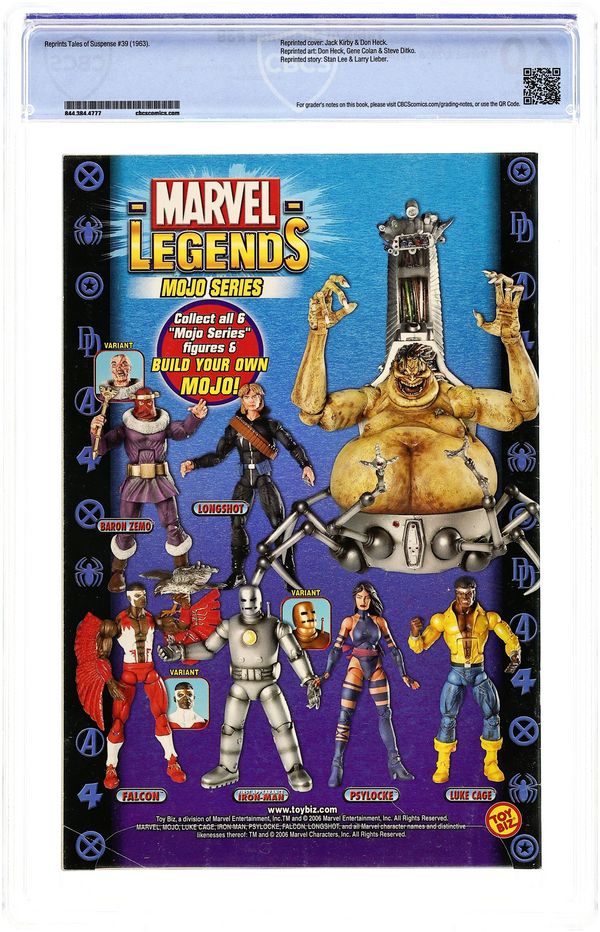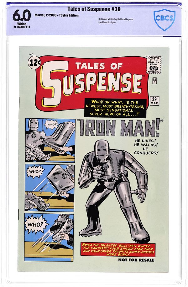 Reprint edition that originally came packaged with First Appearance Iron Man from Marvel Legends series 14 (Mojo Series). First appearance of Iron Man in "Iron Man is Born!" Plot by Stan Lee, script by Larry Lieber, layouts by Jack Kirby, pencils and inks by Don Heck. Back-up stories: "The Last Rocket" with Gene Colan art; "Gundar" with script by Stan Lee, art by Steve Ditko; and a text story, "The Treasure." Kirby/Heck cover. Cover price $0.12.