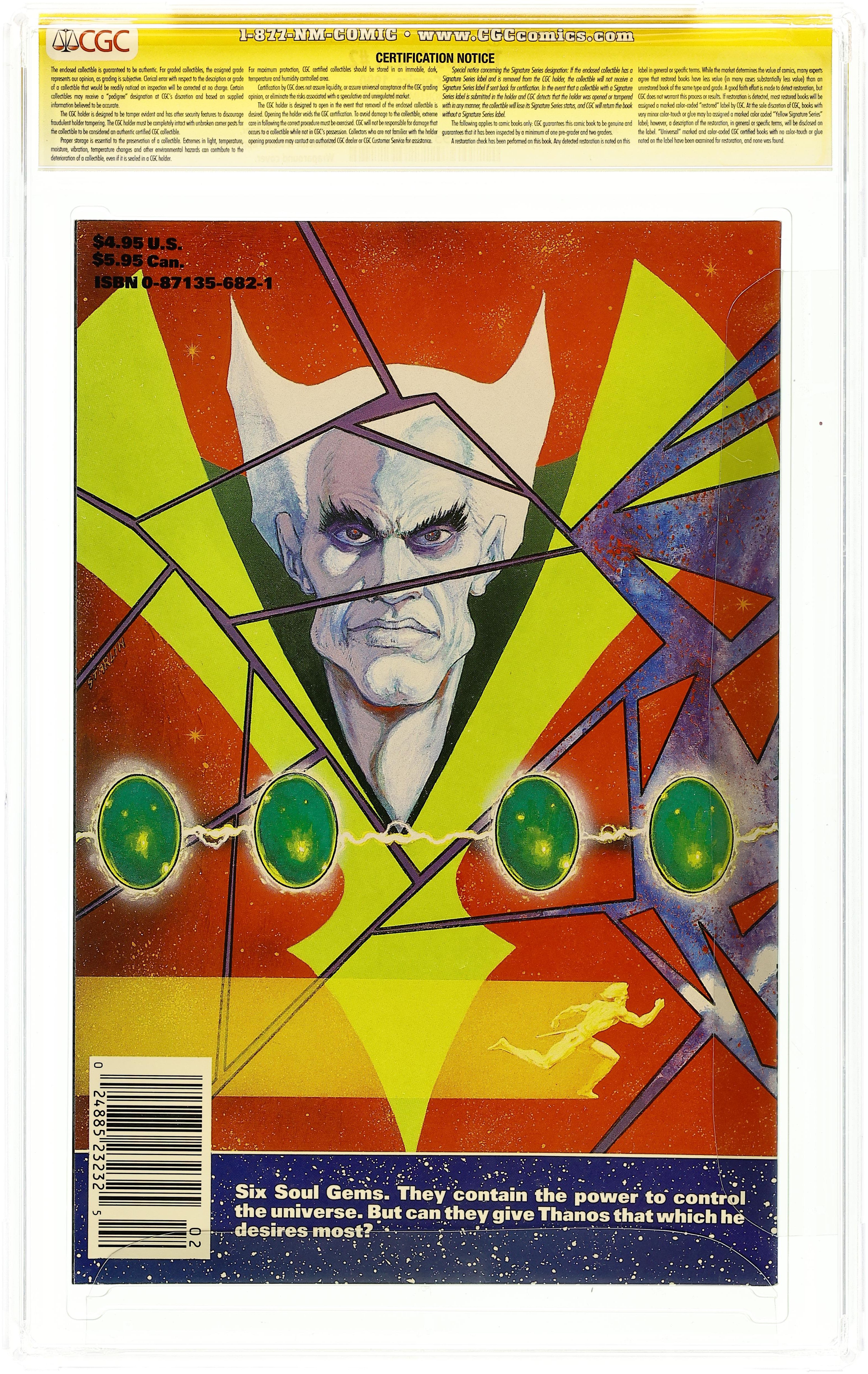 2nd Printing. "Schemes and Dreams!" Written by Jim Starlin. Art by Ron Lim John Beatty. Six Soul Gems. NOTE: This tale picks up after the events of Silver Surfer (1987 2nd Series) #38. Thanos the Mad Titan has been resurrected by the entity known as Death. Resurrected and given a dark mission. In order to accomplish this mission, Thanos will seek ultimate power - the Soul Gems! Individually, they contain power beyond comprehension. Together, they could destroy a universe. And Thanos must have them all. Featuring the Elders of the Universe Champion and Gardiner, and the nefarious In-Betweener. 48 pages, FC. Cover price $4.95.