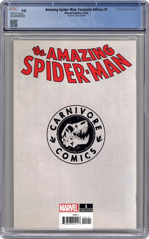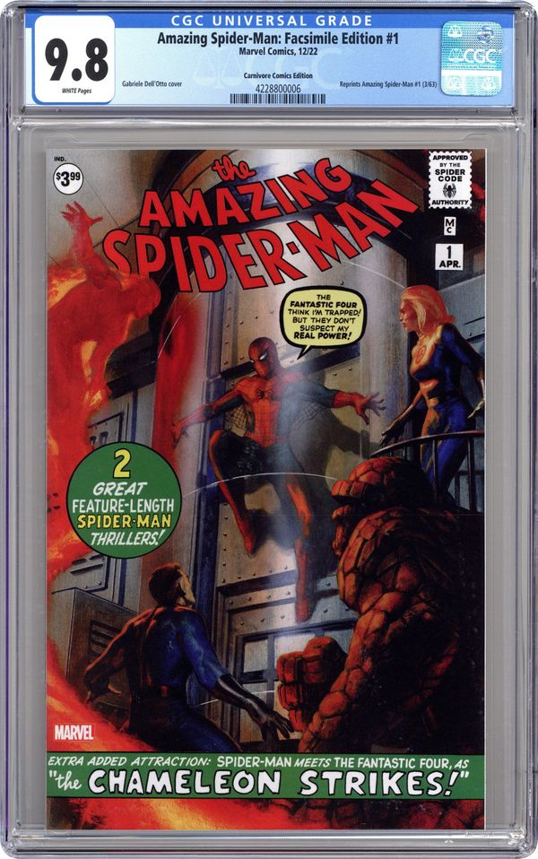 Carnivore Comics Exclusive Cover by Gabriele Dell'Otto. Written by Stan Lee. Art by Steve Ditko. Re-presenting the inaugural issue of Spider-Man's iconic ongoing series, which followed fast after the wall-crawler's blockbuster debut in AMAZING FANTASY #15! Peter Parker has been bitten by the radioactive spider, gained incredible abilities, donned his colorful costume and learned a tragic lesson about power and responsibility - and now it's time for him to swing into action! But can our young hero rescue a crew of astronauts aboard their malfunctioning shuttle? Even if he does, he'll still end up Public Enemy No. 1 as far as journalist J. Jonah Jameson is concerned! Then, Spidey shows off his skills in a bid to join the Fantastic Four - and comes face-to-faces with his very first super villain: the identity-stealing Chameleon! It's one of the all-time great Marvel comic books, boldly re-presented in its original form, ads and all! Reprinting AMAZING SPIDER-MAN (1963) #1. 32 pages, full color.