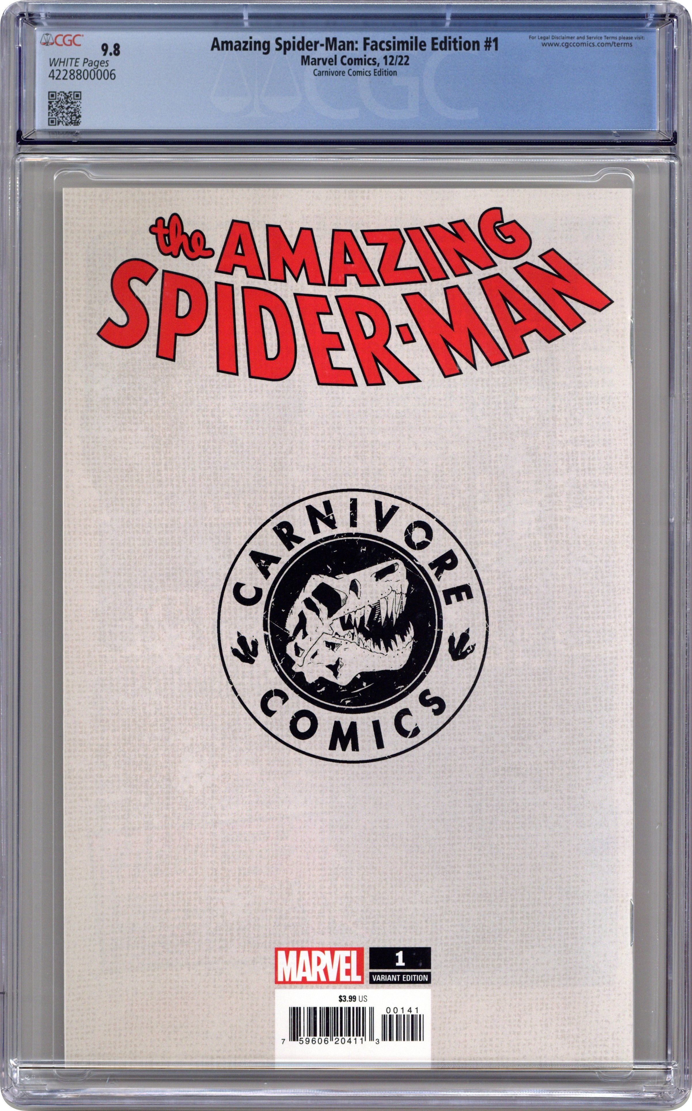 Carnivore Comics Exclusive Virgin Cover by Gabriele Dell'Otto. Written by Stan Lee. Art by Steve Ditko. Re-presenting the inaugural issue of Spider-Man's iconic ongoing series, which followed fast after the wall-crawler's blockbuster debut in AMAZING FANTASY #15! Peter Parker has been bitten by the radioactive spider, gained incredible abilities, donned his colorful costume and learned a tragic lesson about power and responsibility - and now it's time for him to swing into action! But can our young hero rescue a crew of astronauts aboard their malfunctioning shuttle? Even if he does, he'll still end up Public Enemy No. 1 as far as journalist J. Jonah Jameson is concerned! Then, Spidey shows off his skills in a bid to join the Fantastic Four - and comes face-to-faces with his very first super villain: the identity-stealing Chameleon! It's one of the all-time great Marvel comic books, boldly re-presented in its original form, ads and all! Reprinting AMAZING SPIDER-MAN (1963) #1. 32 pages, full color.