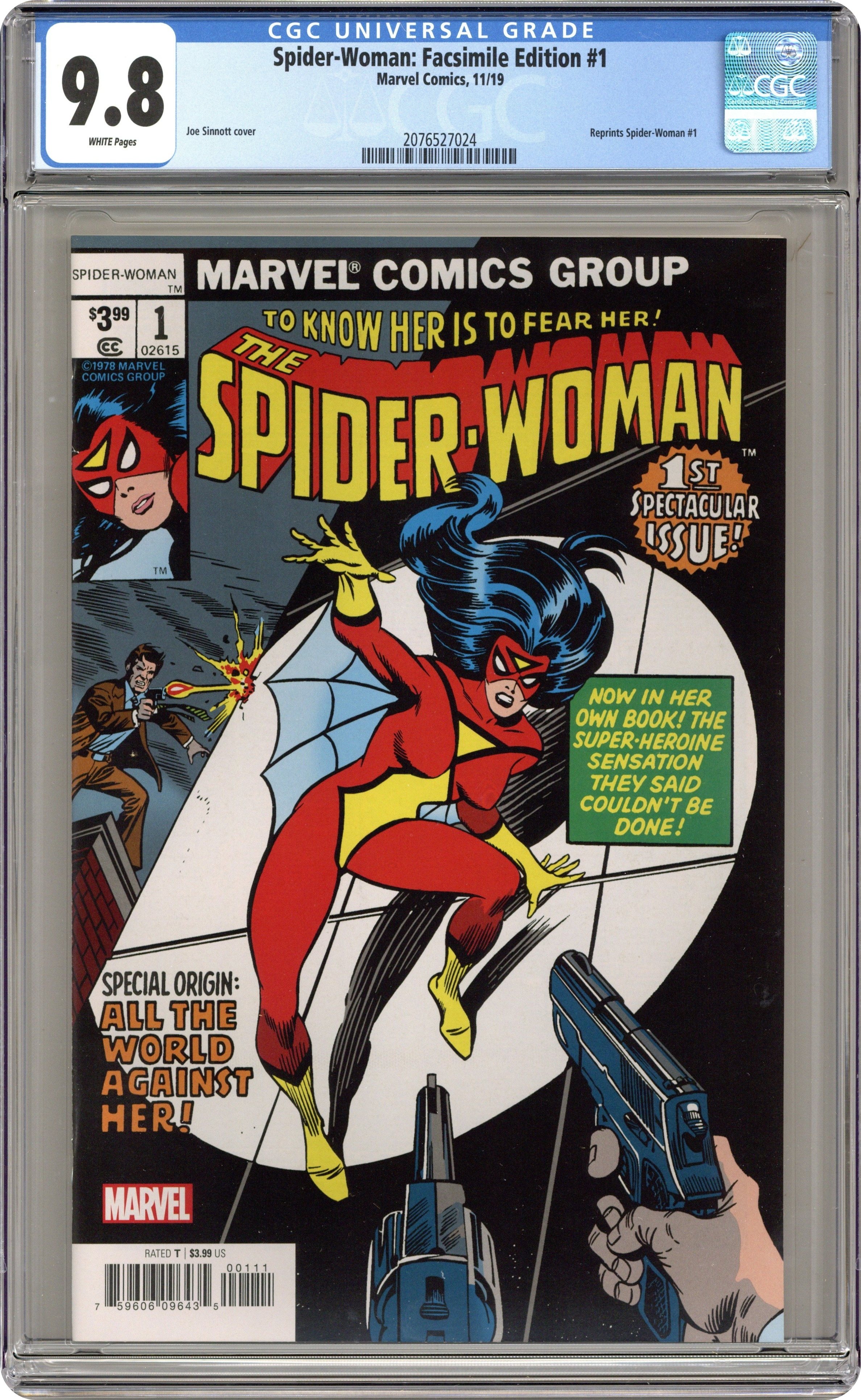 Written by Marv Wolfman. Art by Carmine Infantino. Cover by Joe Sinnott. To know her is to fear her! She's Jessica Drew - the sensational Spider-Woman! Jessica was born human, but now she's something very different. Thanks to Hydra, her past lies in tatters - and she faces an uncertain future! But who will Jessica Drew become? A villain? A super hero? Or something else? One thing's for sure, she's about to make a very public splash - and catch the attention of S.H.I.E.L.D. Agent Jerry Hunt in a big way! Watch as the sensation called Spider-Woman emerges from the shadows to find her place in the world for the first time! It's one of the all-time great Marvel comic books, boldly re-presented in its original form, ads and all! Reprinting SPIDER-WOMAN (1978) #1. 32 pages, full color. Rated T Cover price $3.99.