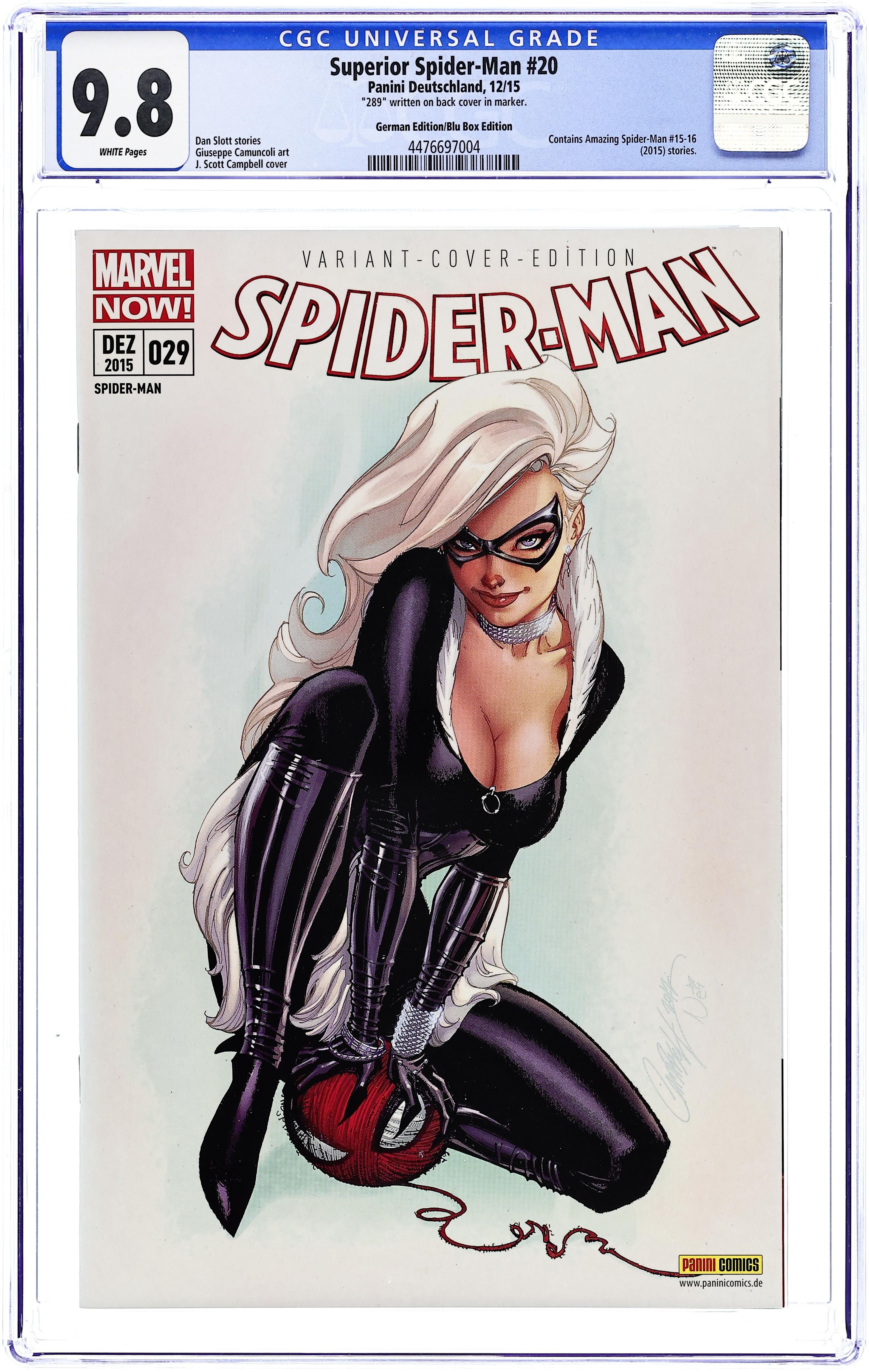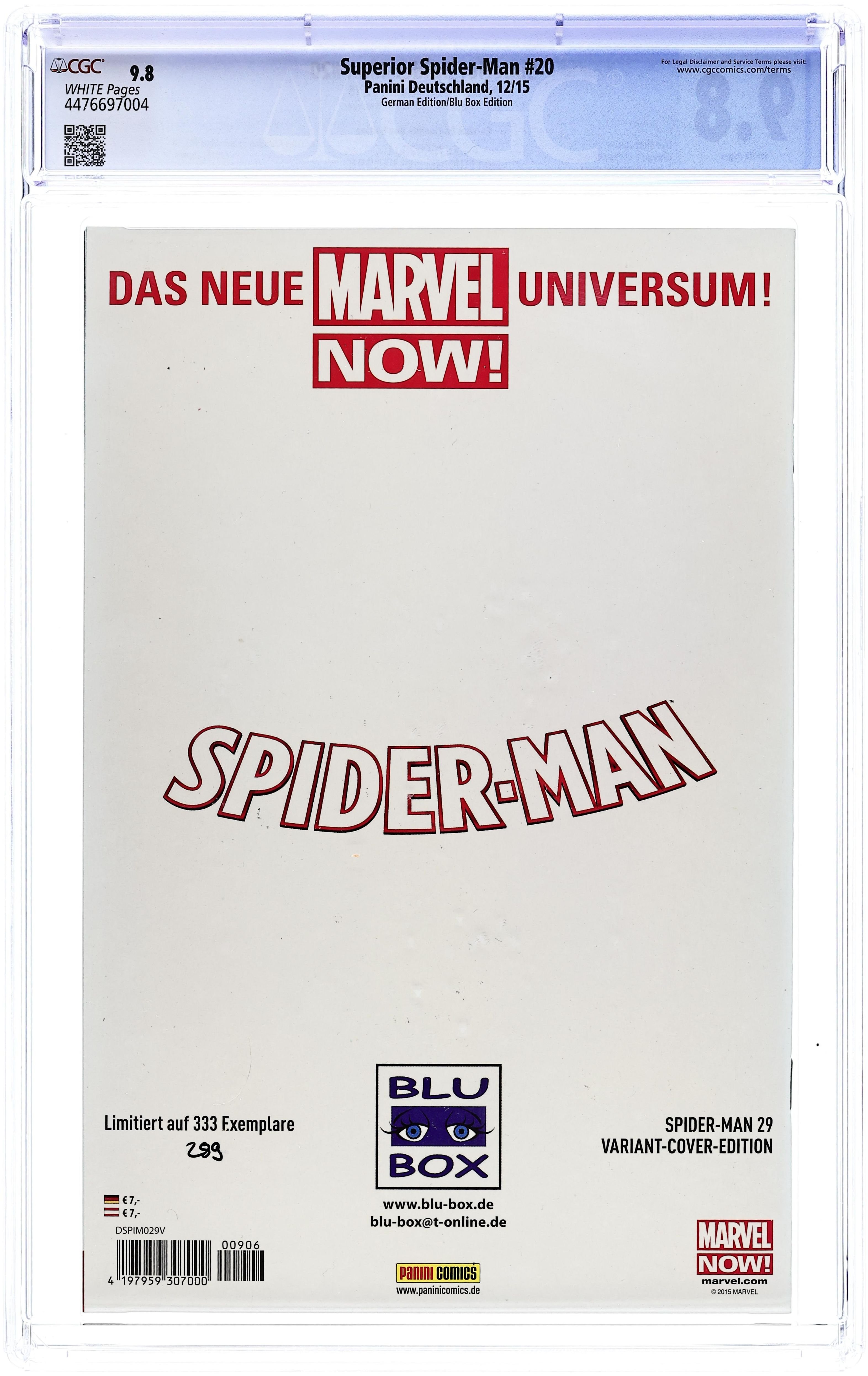 Blu Box German reprint of Amazing Spider-Man (2015 4th Series) #15. Limited to 333 copies, featuring variant cover art by J. Scott Campbell from Black Cat (2010 2nd Series Marvel) 1B. Written by Dan Slott. Art by Giuseppe Camuncoli.There's an accident at Parker Industries! • What will Peter Parker do to save his employees, both as CEO AND Spider-Man?! Rated T