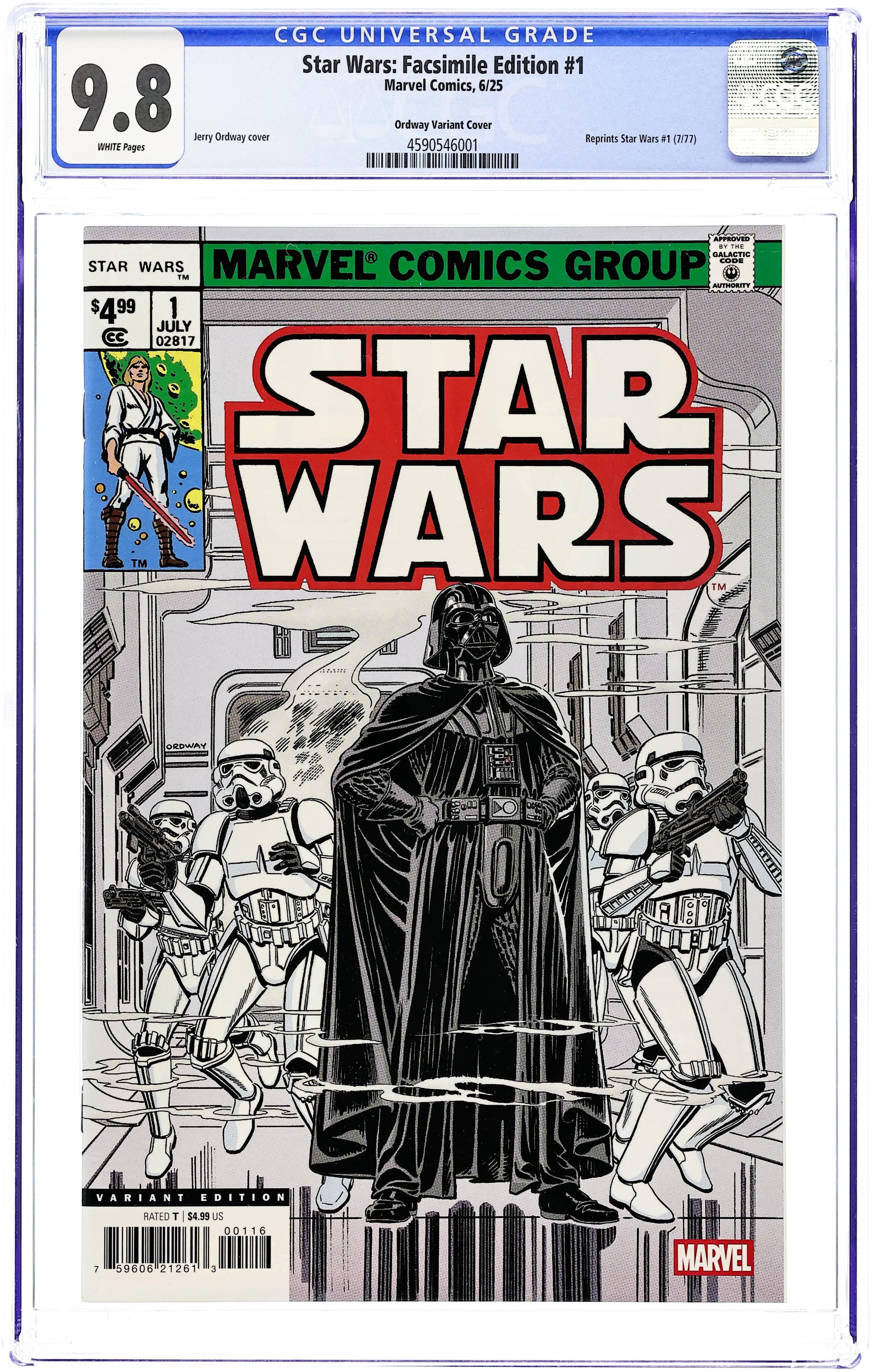 Limited 1 for 25 Retailer Incentive Variant Cover. Written by Roy Thomas. Art by Howard Chaykin. Cover by Jerry Ordway. Months before the first Star Wars movie had even arrived in theaters, Marvel Comics STAR WARS #1 hit the stands and introduced eager readers to a galaxy far, far away! Its cover asked: Luke Skywalker: Will he save the galaxy or destroy it? – and inside, readers eager to know the answer joined Luke on the first, fateful steps of his epic journey from the deserts of Tatooine to the very heart of the Rebellion! This opening chapter of Marvels adaptation of George Lucas cinematic masterpiece features the debuts of some of the most beloved characters in cinematic history – including Princess Leia, R2-D2, C-3PO and, of course, the ruthless enforcer of the Galactic Empire, Darth Vader! Its one of the all-time great Marvel comic books, boldly re-presented in its original form, ads and all! Reprinting STAR WARS (1977) #1. 32 pages, full color. Rated T Cover price $4.99.