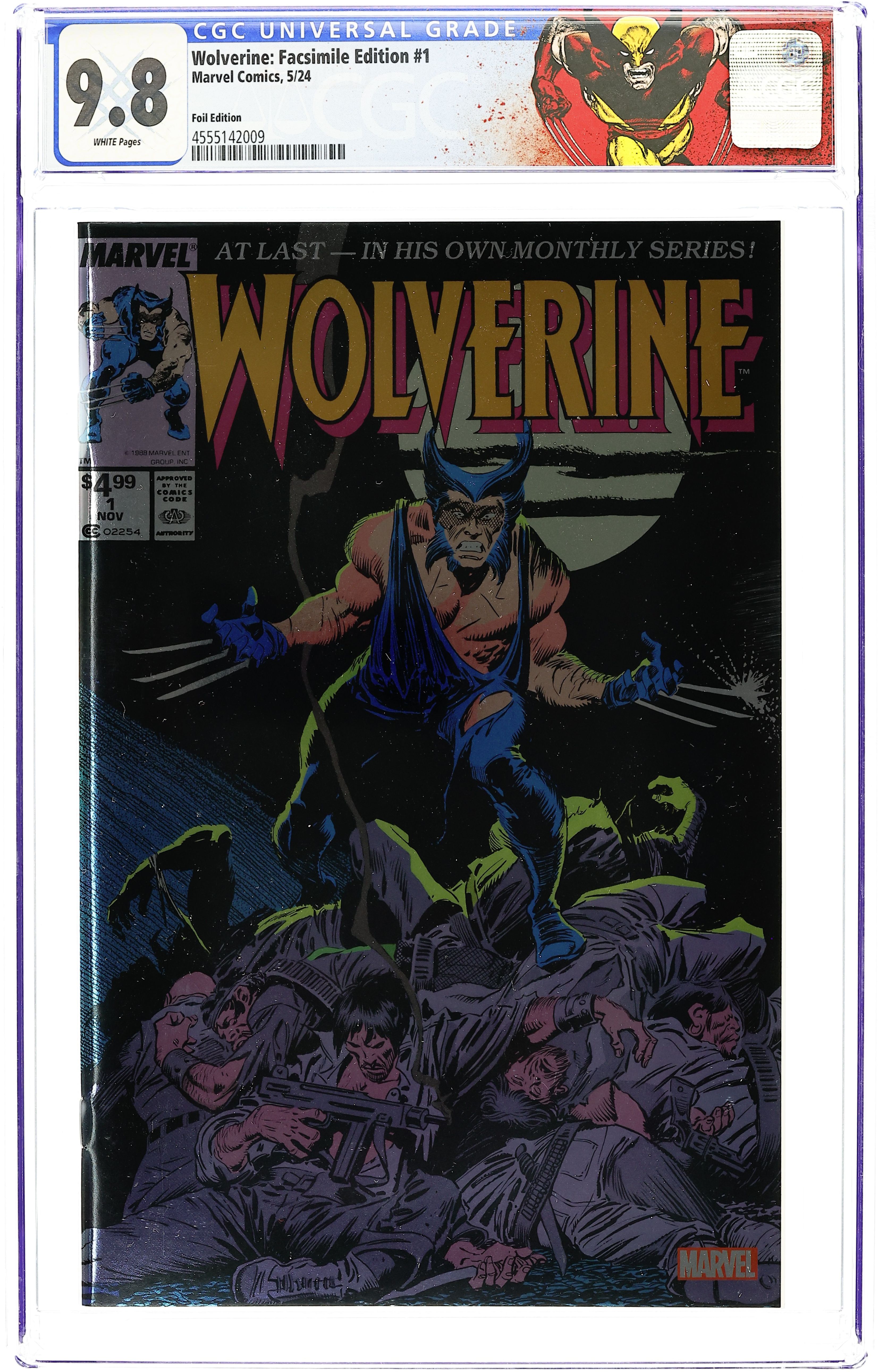 Foil Cover. Written by Chris Claremont. Art by John Buscema. Cover by John Buscema. The debut issue of Wolverine's first-ever, long-running ongoing series! Chris Claremont teams with comic-book giant John Buscema to send Logan on a sword quest - fighting pirates in Indonesia! From there, the action heads to Madripoor, where a cult seeks the black blade known as the Muramasa Sword. Whether wearing his stripped-down black suit and no mask or donning his signature "Patch" disguise, this is a Wolverine unlike anything ever seen before - slicing and dicing armies of pirates and cultists! It's one of the all-time great Marvel comic books, boldly re-presented in its original form, ads and all! Reprinting WOLVERINE (1988) #1. 32 pages, full color. Rated T Cover price $9.99.