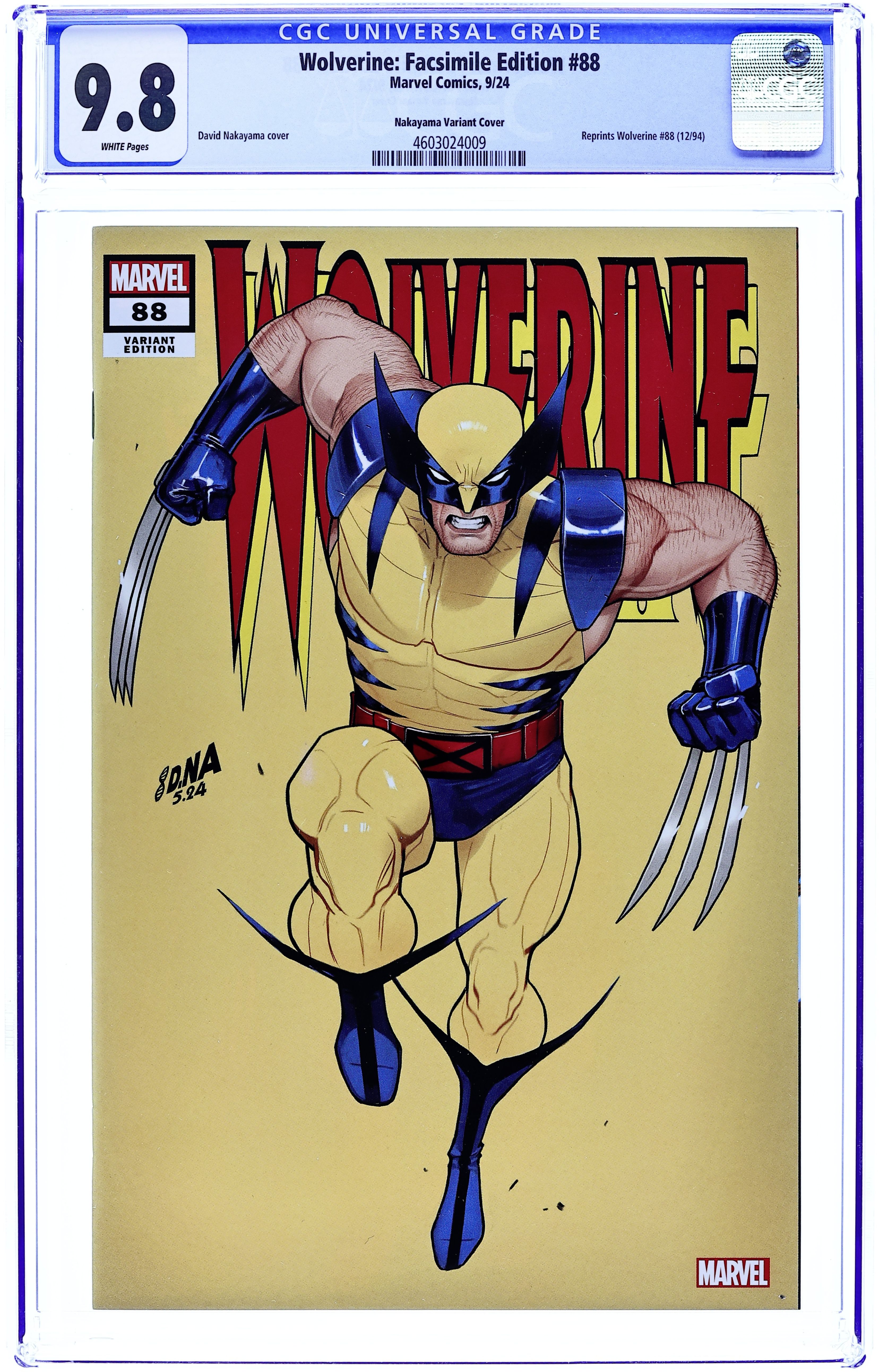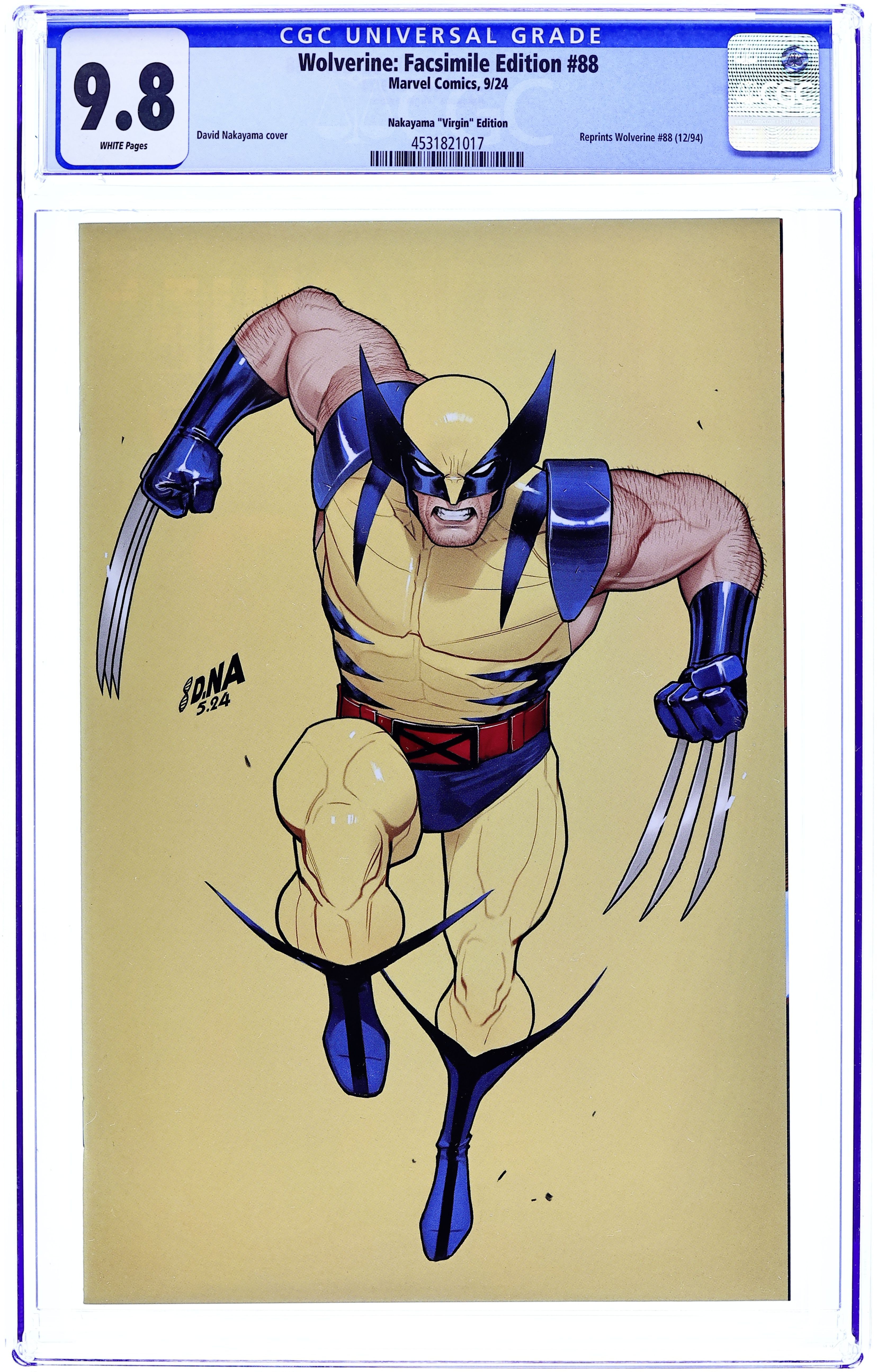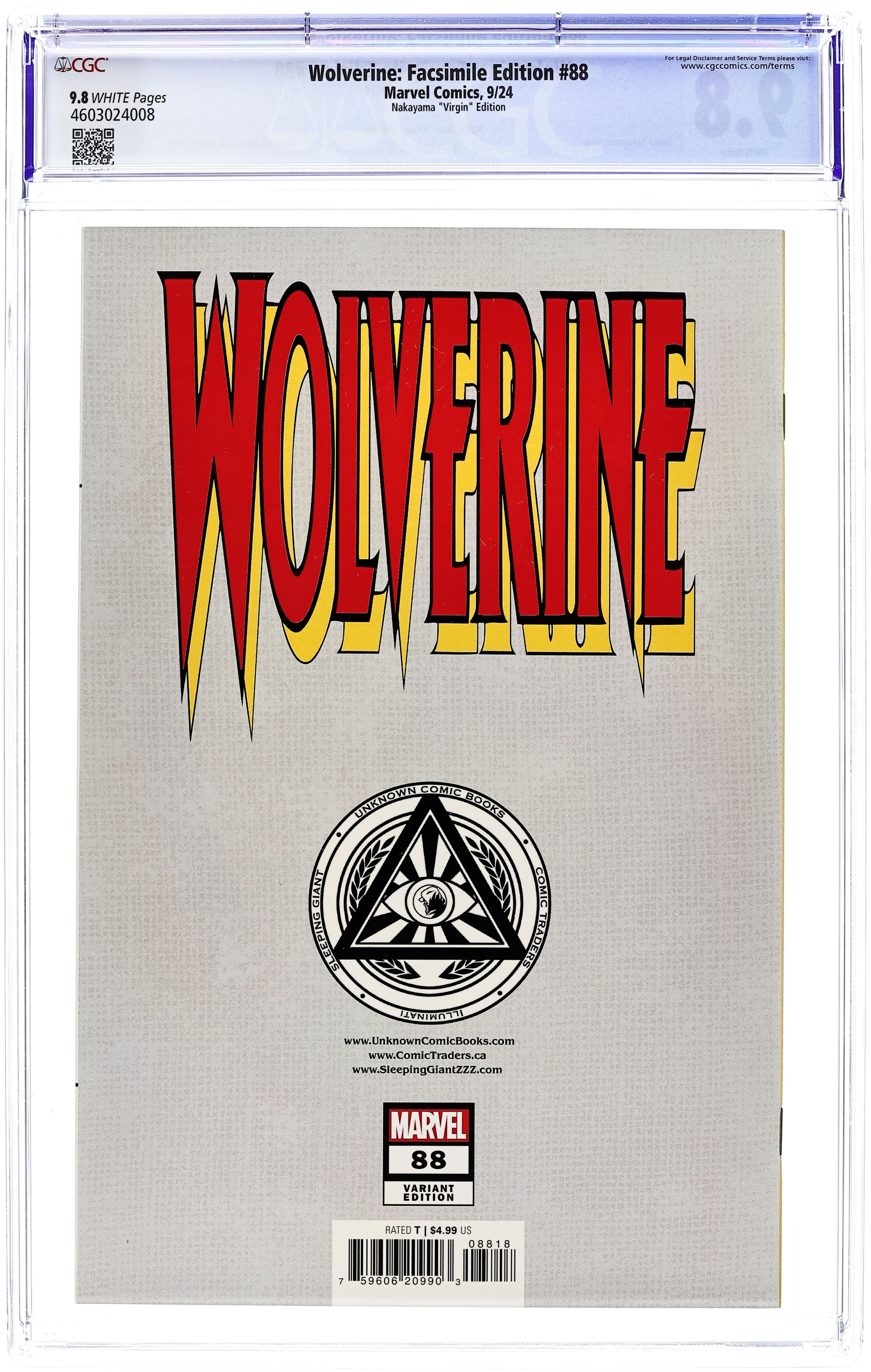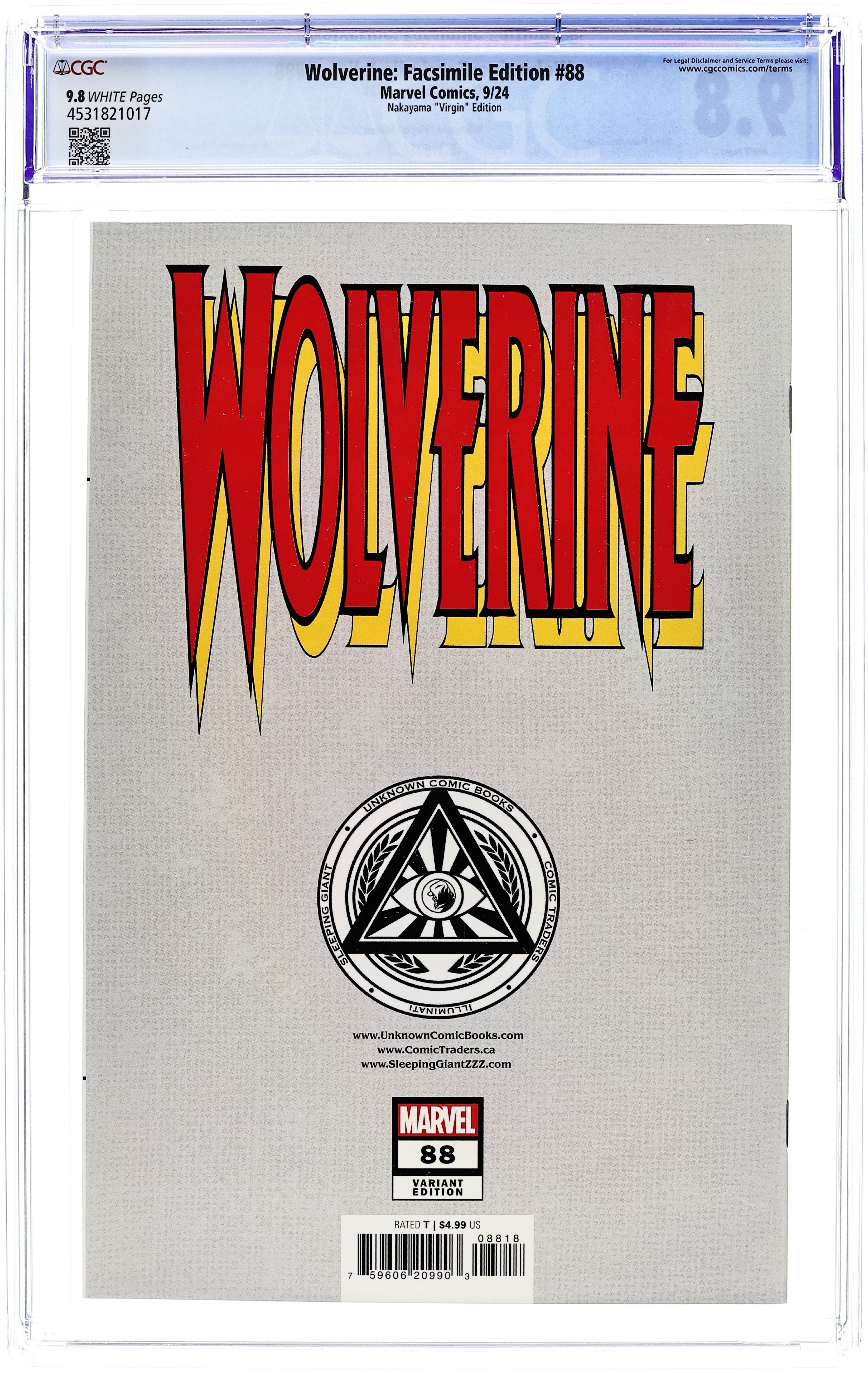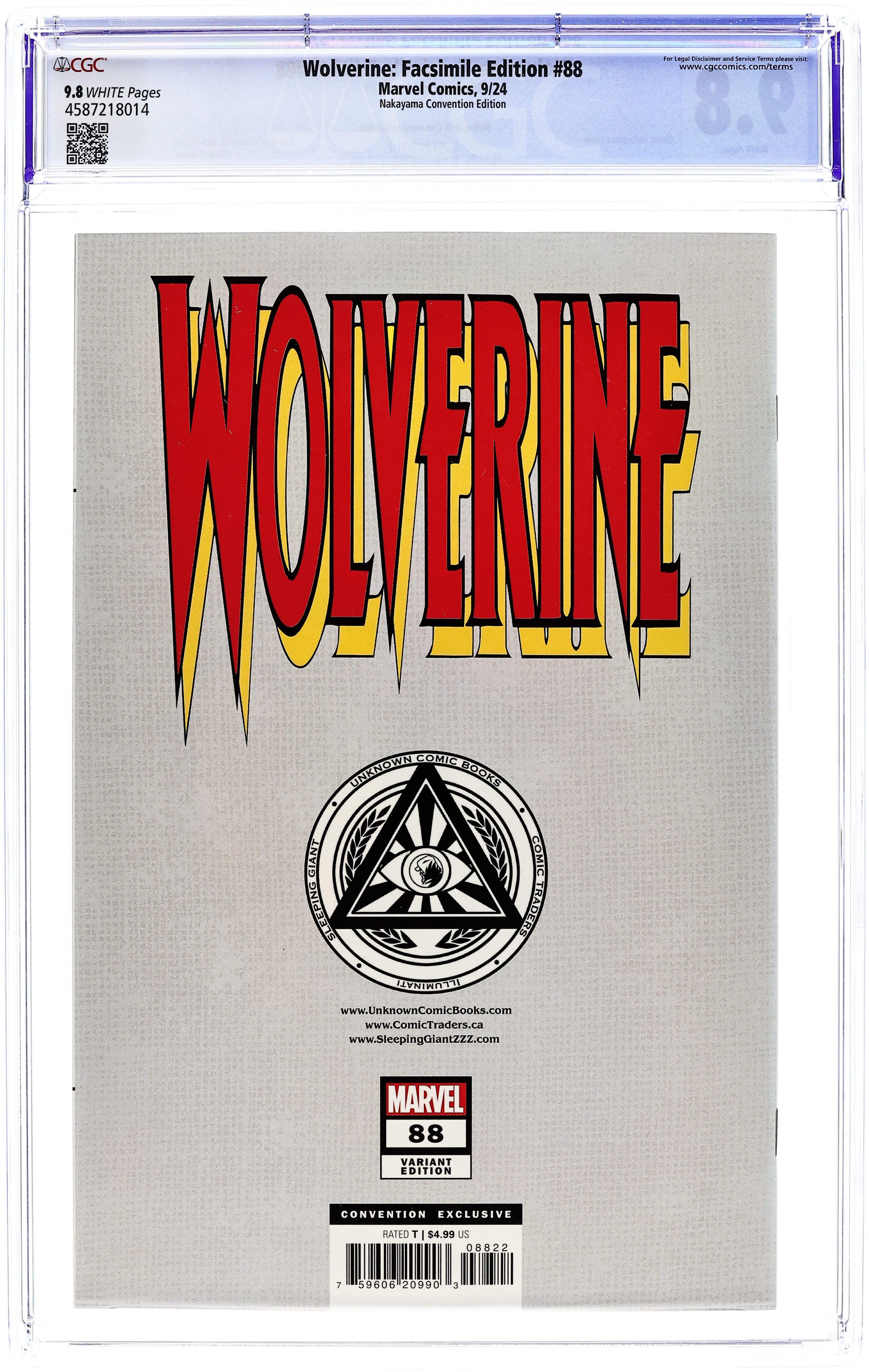 Comics Illuminati (Unknown Comic Books, Comic Traders, and Sleeping Giant) Convention Exclusive "White" Edition Virgin Cover by David Nakayama. Written by Larry Hama. Art by Adam Kubert; Fabio Laguna. The first comic-book meeting of Wolverine and Deadpool! And when Logan meets Wade Wilson, they don't waste time on introductions before they get right down to the business of trying to kill each other! But as Deadpool and Wolverine test their respective healing factors to their limits, they're not the only players on this stage: Garrison "Weapon X" Kane and Wade's ex-girlfriend Copycat are trying to have a normal life together, which includes joining a theater troupe! And as Deadpool enters stage right looking to exact painful revenge on Kane, Logan will have to act fast to save him! It's one of the all-time great Marvel comic books, boldly re-presented in its original form, ads and all! Reprinting WOLVERINE (1988) #88. 32 pages, full color. Rated T Cover price $4.99.