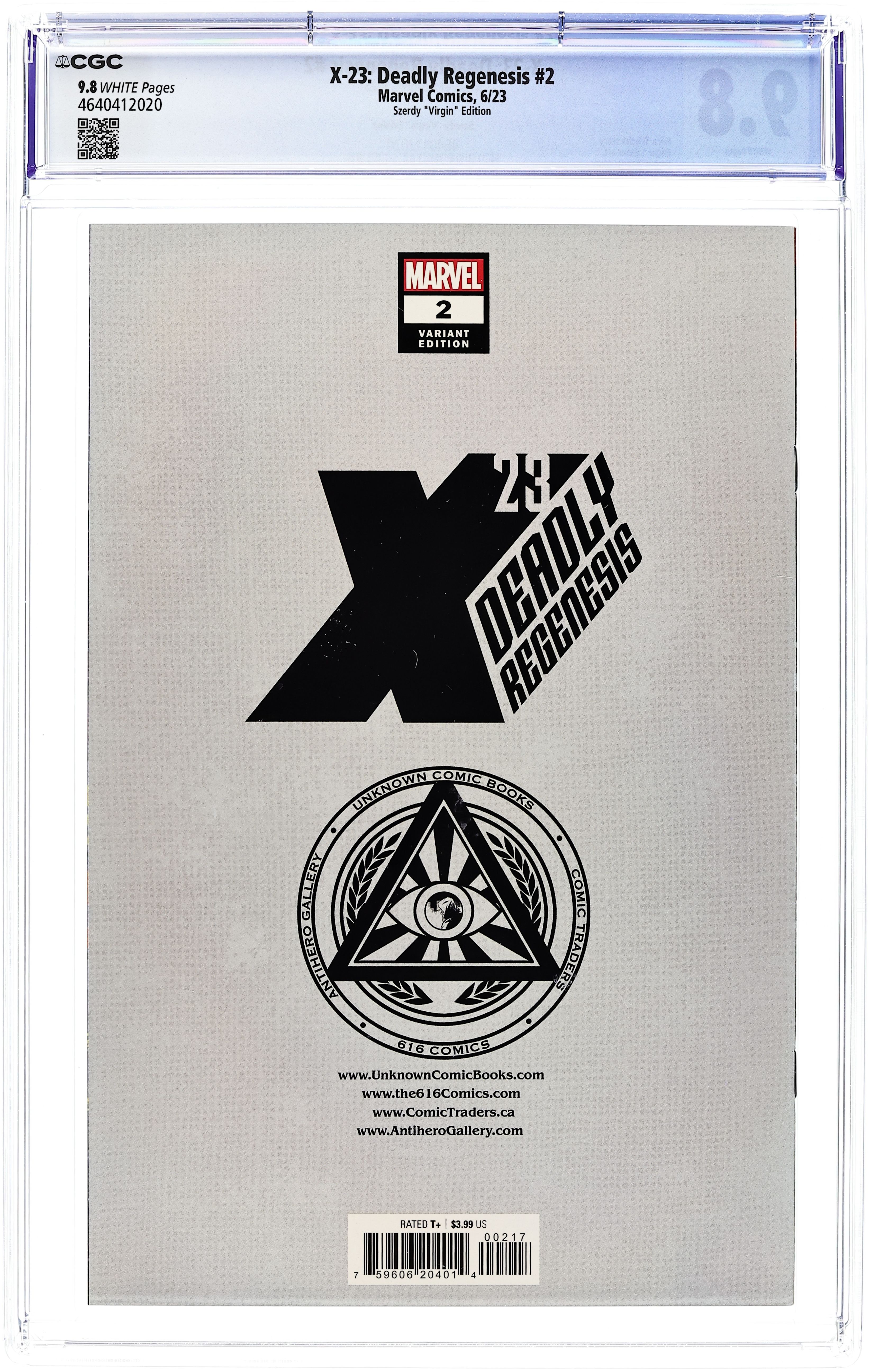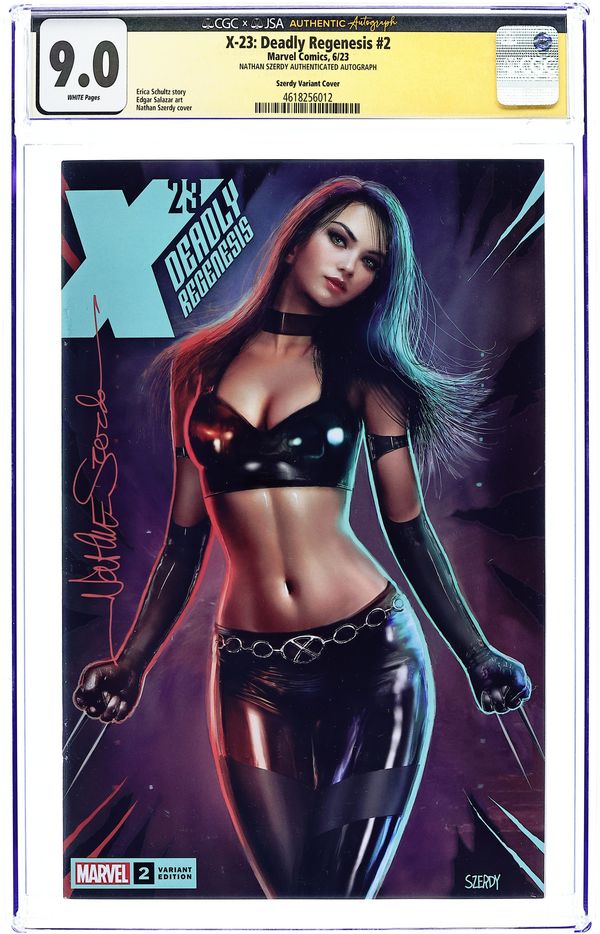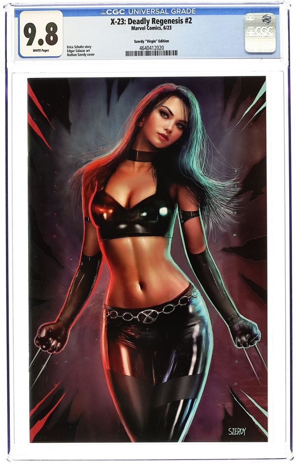 Comics Illuminati (Unknown Comics, AntiHero Gallery, The 616 Comics, and Comic Traders) exclusive Virgin Cover by Nathan Szerdy. Written by Erica Schultz. Art by Edgar Salazar. AN ALL-NEW VILLAIN IS OUT FOR X-23S BLOOD! • X-23 has made her share of enemies, but this time, REVENGE is PERSONAL! • Don't miss the debut issue of a never-before-seen X-villain in the further adventures from Laura Kinney's defining era! 28 pages, full color. Rated T+
