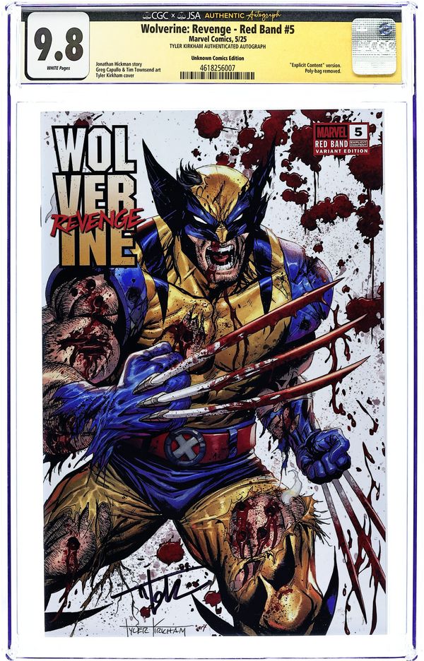 Unknown Comics Exclusive Variant Cover by Tyler Kirkham. Written by Jonathan Hickman. Art by Greg Capullo. Cover by Mike McKone. Witness the blood-soaked conclusion of WOLVERINE: REVENGE #5 - no-holds-barred! Expanded and bloodier in the Red Band edition featuring exclusive pages! Originally polybagged to contain the explicit violence! 32 pages, full color. Rated Explicit Content