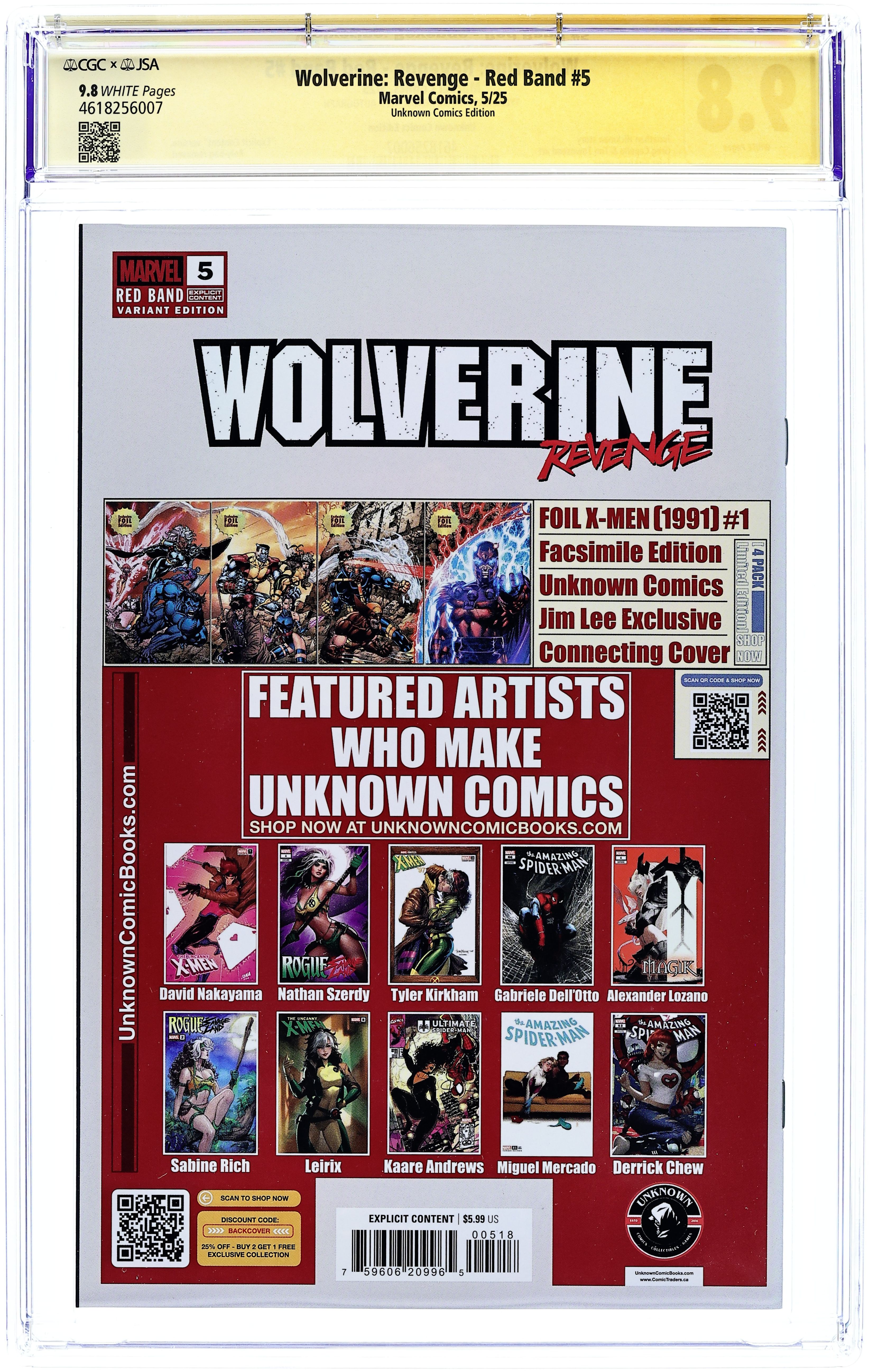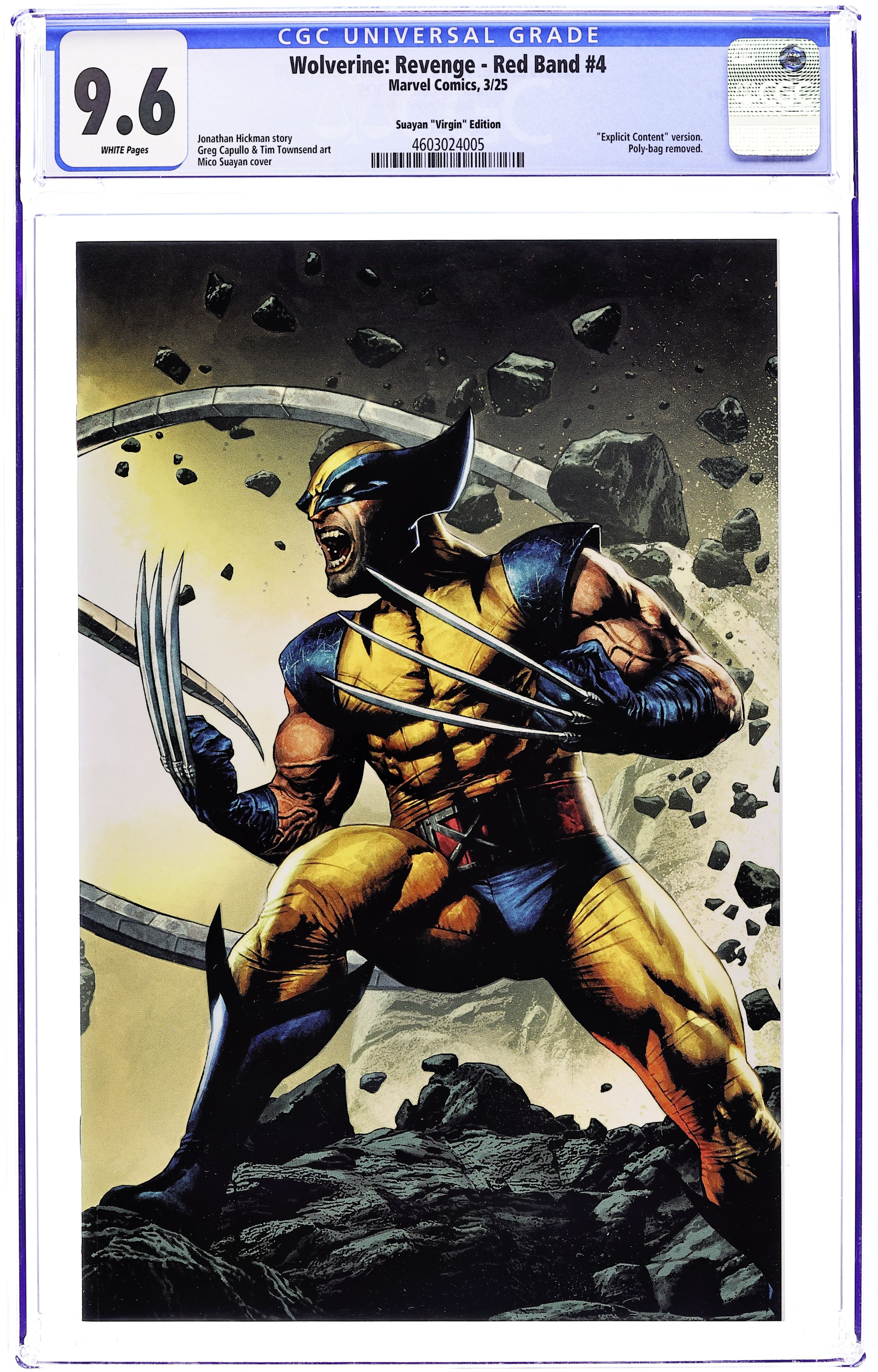 NOTE: May or may not be polybagged. Red Band Edition. Comics Illuminati (Unknown Comic Books, Comic Traders, and Sleeping Giant) Exclusive Virgin Cover by Mico Suayan. Written by Jonathan Hickman. Art by Greg Capullo. The same vicious vengeance unleashed in WOLVERINE: REVENGE #4 - only expanded and bloodier than ever in the Red Band edition featuring exclusive pages! Originally Poly-Bagged to contain the explicit violence! 32 pages, full color. Rated Explicit Content
