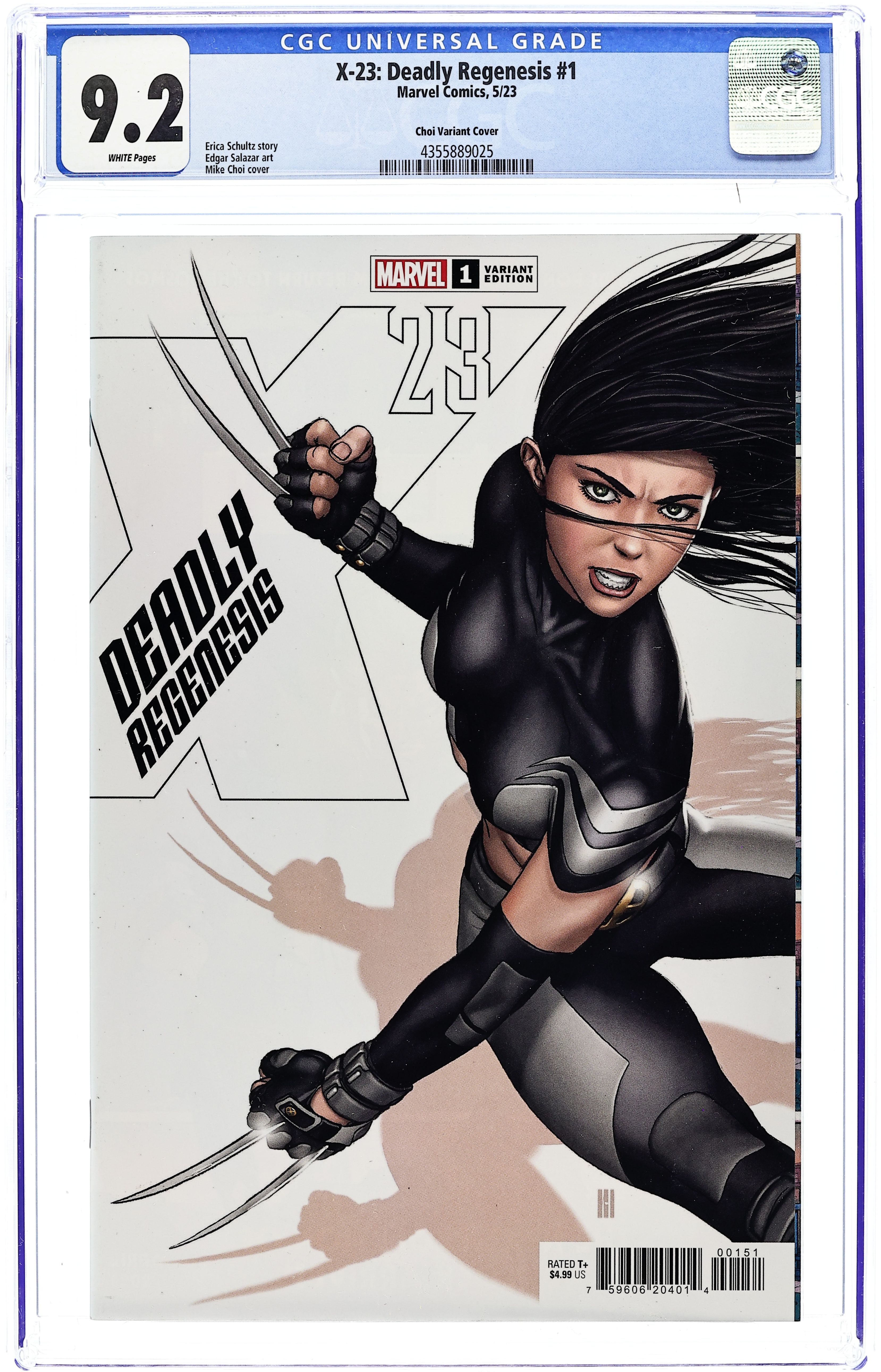 Limited 1 for 50 Retailer Incentive Variant Cover. Written by Erica Schultz. Art by Edgar Salazar. Cover by Mike Choi. ASSASSIN OR X-MAN? THE DEADLY DAYS OF X-23! LAURA KINNEY, A.K.A. X-23, was cloned from LOGAN and trained by the Facility to be a deadly assassin. Even as she tries to put that life behind her, forces will try to drag her back - and she'll fight them tooth and claw! Beset by NEW ENEMIES - as well as OLD FAVORITES! - and set during X-23's days as a member of X-MEN and X-FORCE, when she walked away from the island of UTOPIA to find where she truly belongs, join us for an ALL-NEW story in the fan-favorite saga of Laura Kinney! 40 pages, full color. Rated T+ Cover price $4.99.