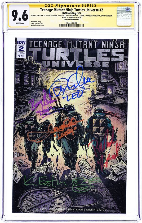 - Signed & Sketch by Kevin Eastman on 4/14/18 & Signed by Cam Clarke, Townsend Coleman, Barry Gordon & Rob Paulsen on 4/14/18. Subscription Edition B.