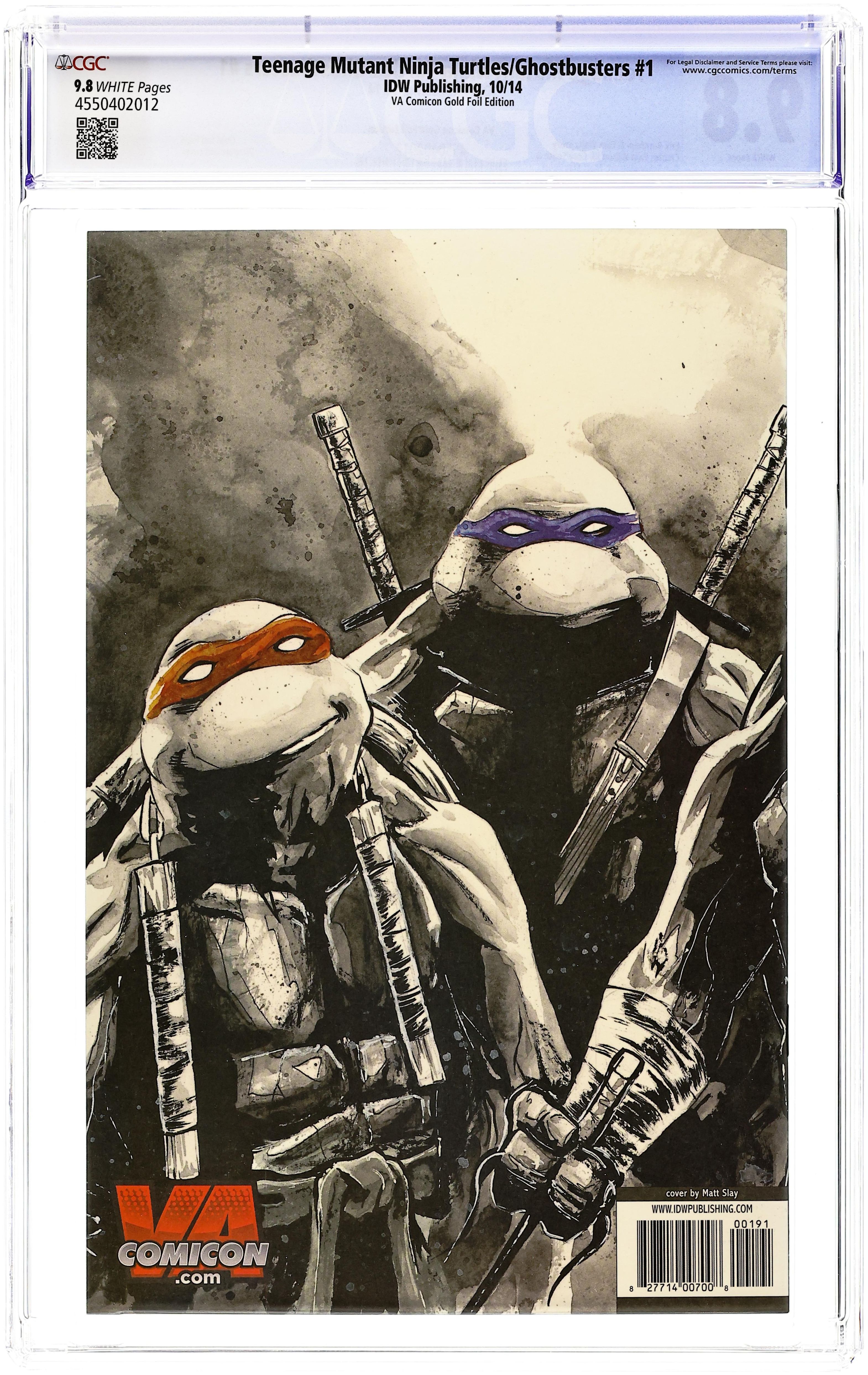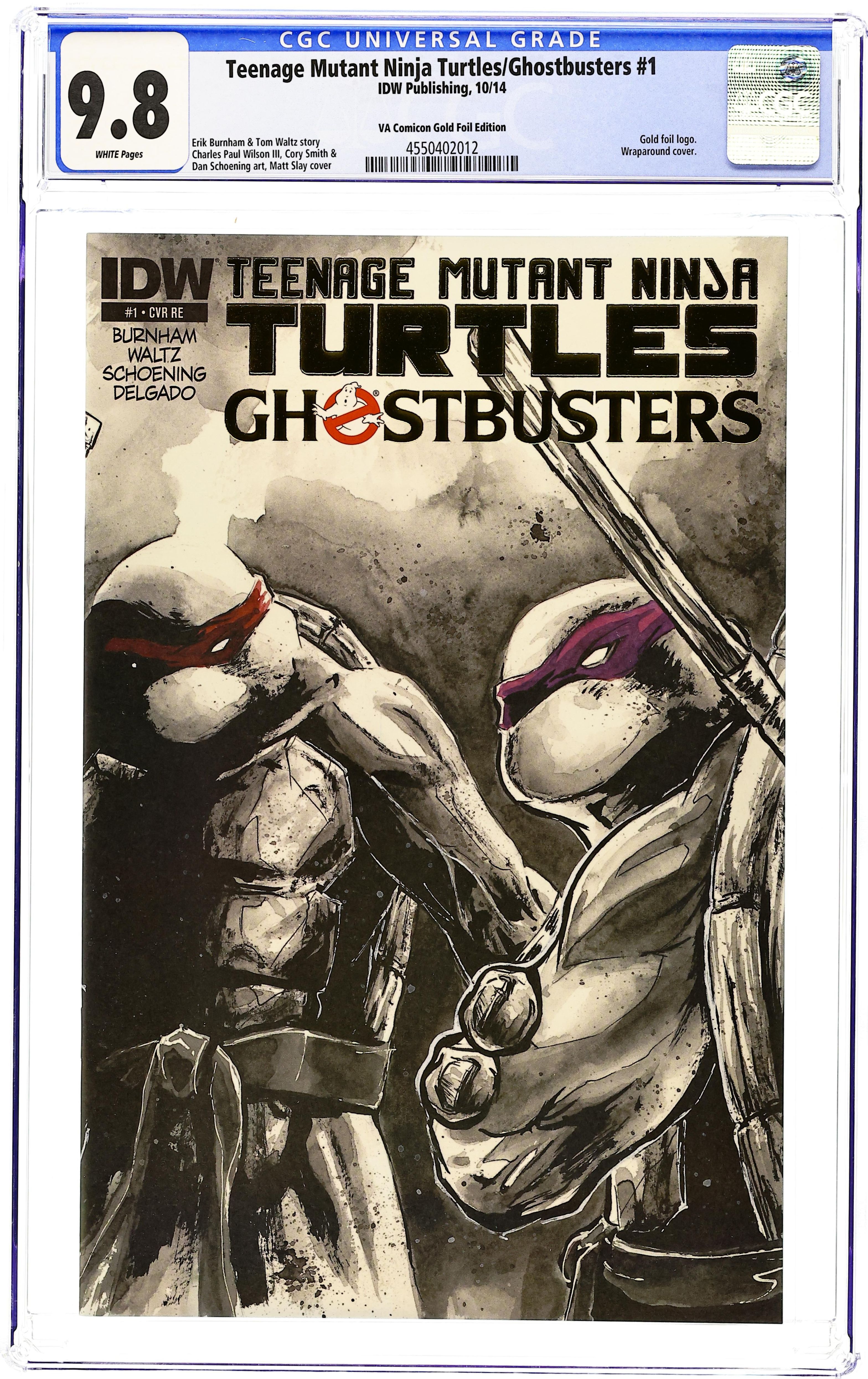 VA Comic-Con 2016 Gold Title variant cover by Matt Slay - Limited to 250 copies. Written by Erik Burnham and Tom Waltz. Art by Charles Paul Wilson III, Cory Smith and Dan Schoening. When a new invention goes haywire, the Turtles are sent to a whole new type of New York City. One with a whole lot more ghosts... and Ghostbusters! The two teams will have to learn to get along quickly, because a new foe from the Turtles past has followed them and aims to conquer NYC! 28 pages, full color.