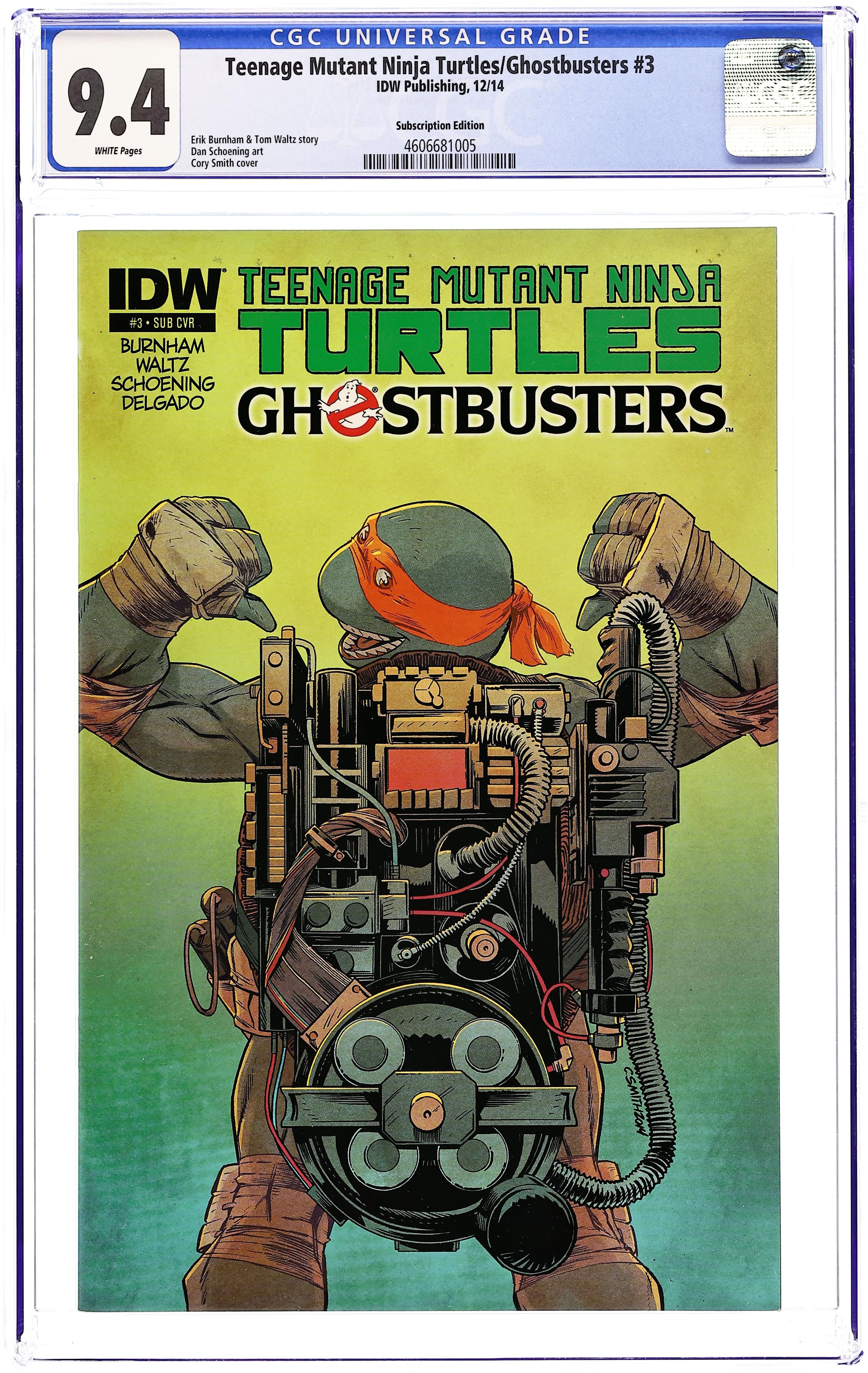 Limited 1 for 10 Retailer Incentive Variant Cover. Written by Erik Burnham and Tom Waltz. Art by Dan Schoening, Mark Torres, Pablo Tunica and Tadd Galusha. Cover by Donny Tran. As the teams split up to evade their spectral pursuers, Michelangelo and Peter Venkman enter a dimension populated by anthropomorphic animals… including Turtle Ghostbusters! 28 pages, full color. Mature Readers Cover price $3.99.