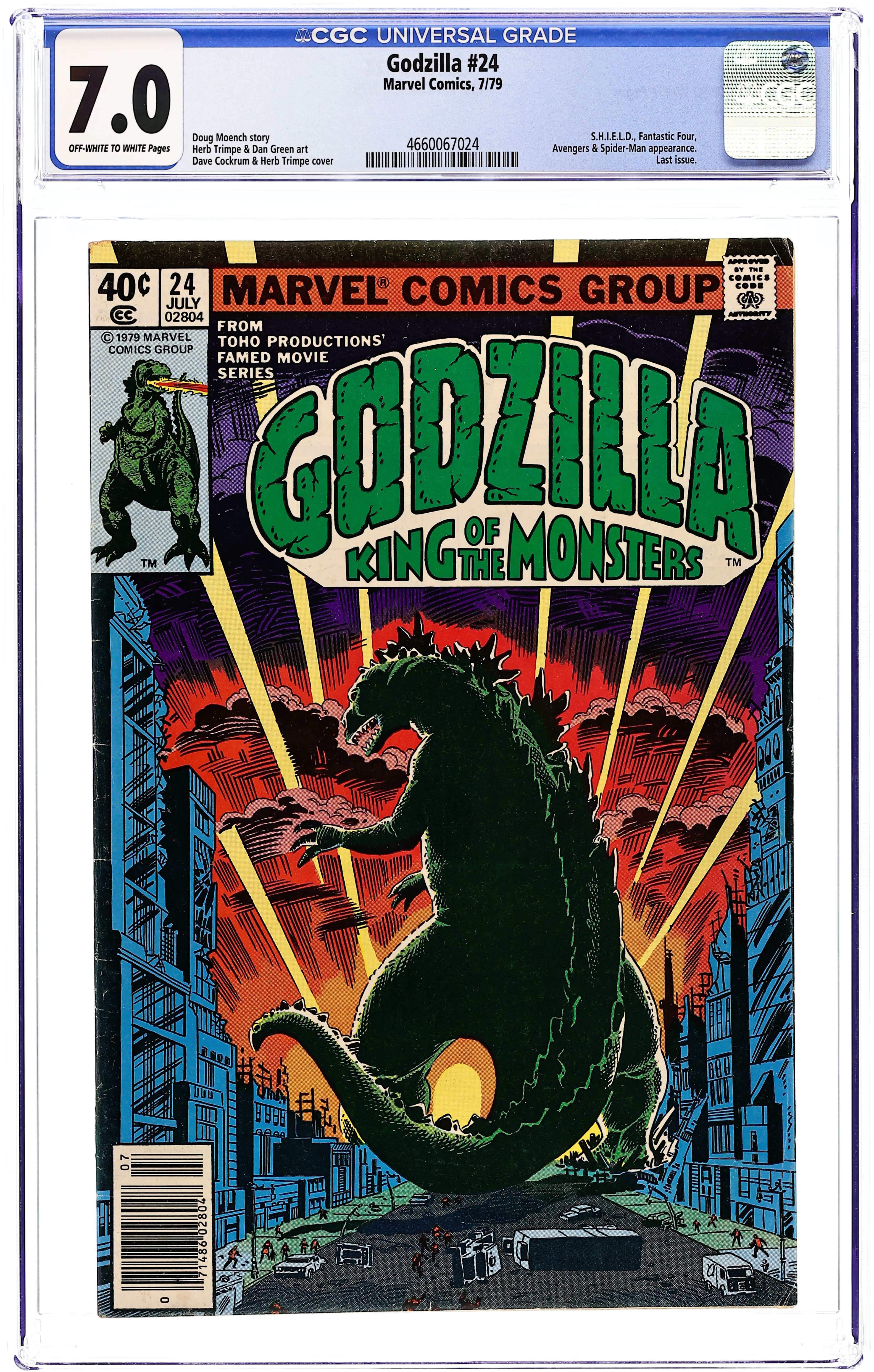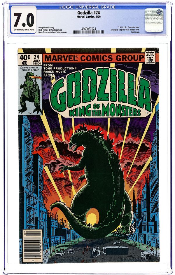 Newsstand Edition. Final issue. "And Lo, A Child Shall Lead Them!" Part 8 of 8. Guest-starring the Avengers and Fantastic Four. Spider-Man cameo. Story by Doug Moench. Art by Herb Trimpe and Dan Green. Godzilla's epic American Tour comes to an earth shattering end. Can the combined might of the Avengers, Fantastic Four, and S.H.I.E.L.D. hope to contain this titanic beast before he destroys the Big Apple, or will they have to finally use lethal force to bring the beast down? This is it, the final farewell for Godzilla, King of the Monsters. Cover price $0.40.