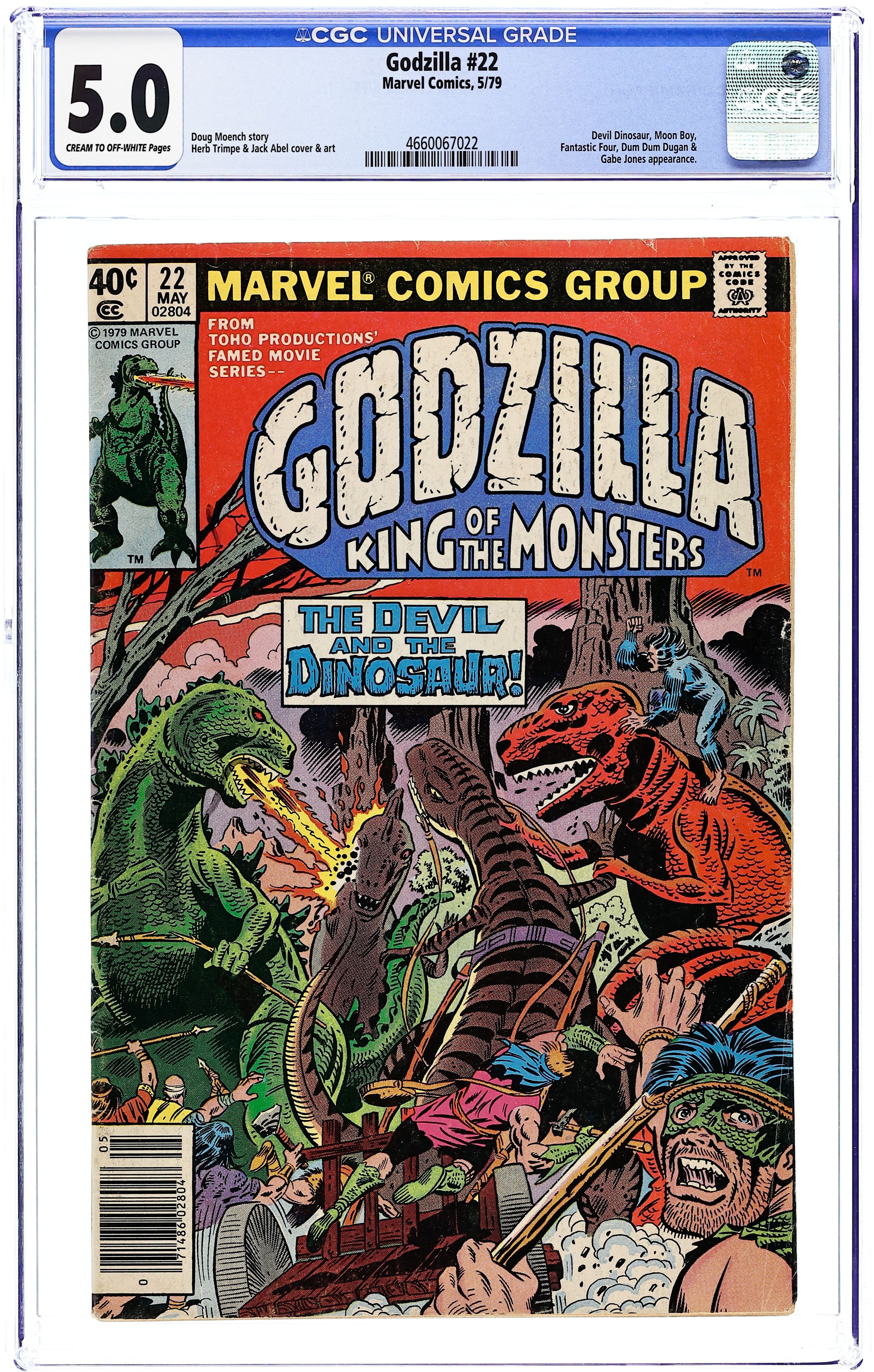 "The Devil and the Dinosaur!" Part 6 of 8. Guest-starring the Fantastic Four, Moon Boy, and Devil Dinosaur. Story by Doug Moench. Art by Herb Trimpe and Dan Green. Godzilla must fight side-by-side with Moon boy and Devil Dinosaur to prevent a terrible tyrant from usurping control of the valley. Plus, a surprise ending that will leave your mouth agape. Cover price $0.40.