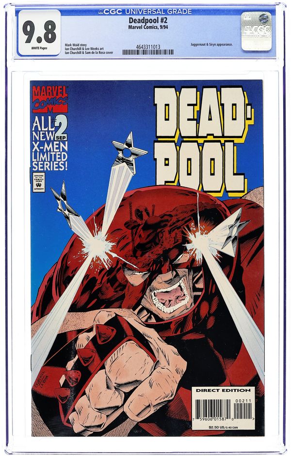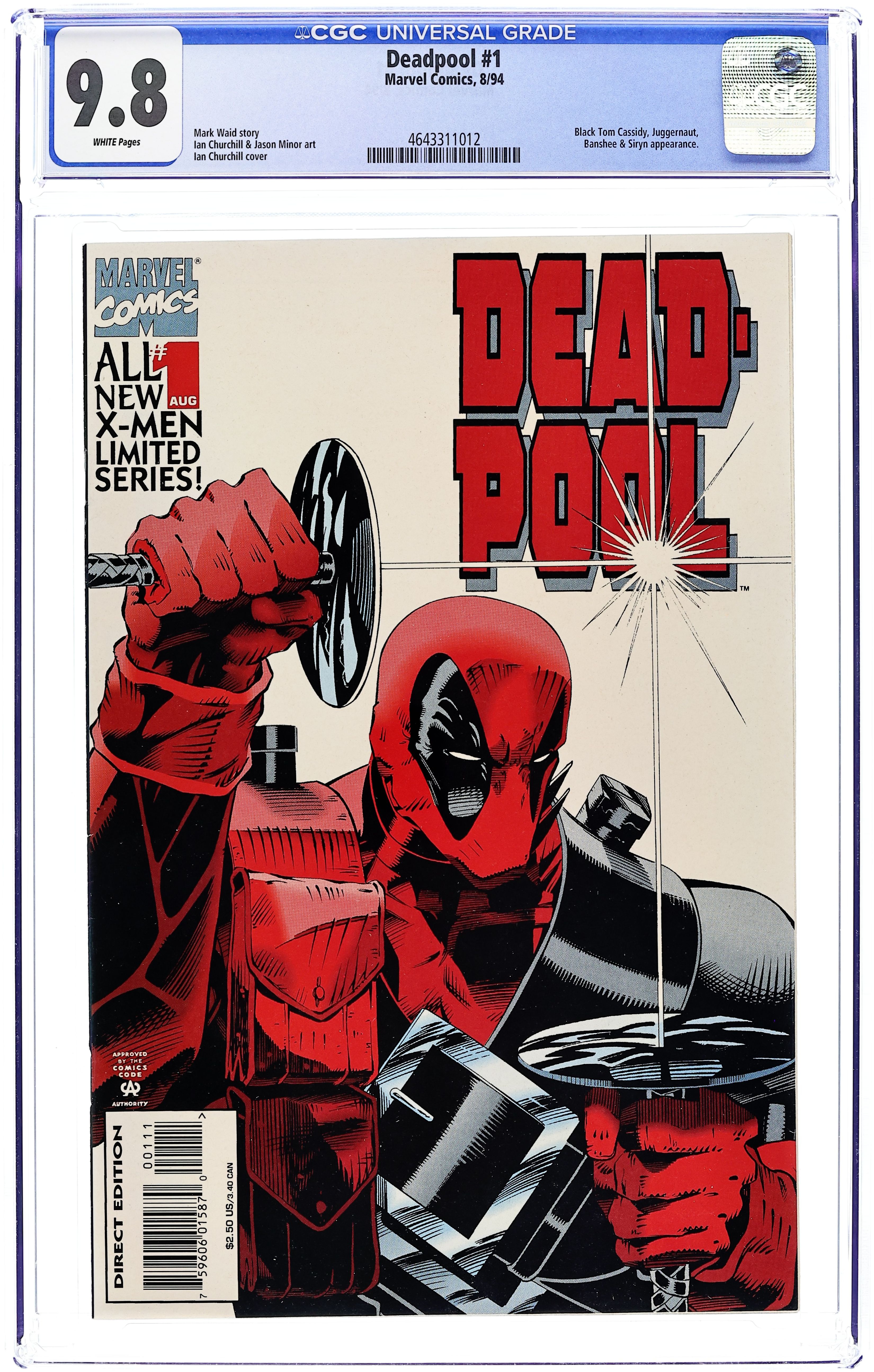 Direct Edition. Cover pencils by Ian Churchill. If Looks Could Kill, script by Mark Waid, pencils by Ian Churchill, inks by Jason Minor; Black Tom is dying from his wooden infection and Banshee has Dr. Killebrew, a specialist in cellular regeneration, treat him in prison; Juggernaut breaks in, rescues Tom and captures Killebrew; Deadpool is out for a quiet drink when he is assaulted by Black Tom's goons but he gets a timely assist from old pal Banshee and his daughter, Siryn; During the battle, DP's hand is cut off and he blacks out as his healing factor fails to regenerate it. Waid's 1st work for Marvel. Cover price $2.50.