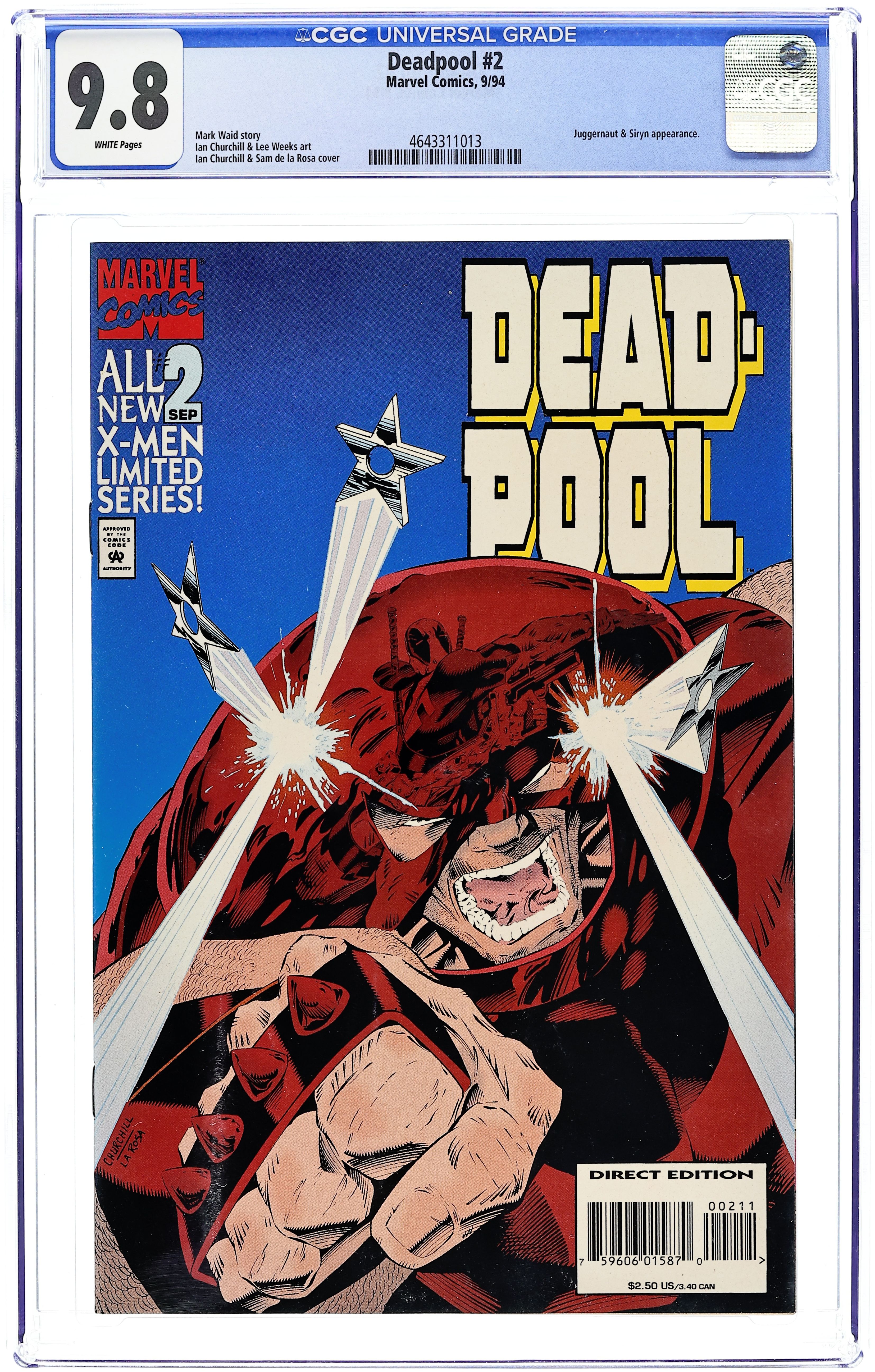 Direct Edition. Cover pencils by Ian Churchill, inks by Bud LaRosa. Luck of the Irish, script by Mark Waid, pencils by Ian Churchill and Lee Weeks., inks by Jason Minor, Bob McLeod, and Bud LaRosa; Black Tom sends Juggernaut to bring in Deadpool so that Killebrew can use the merc's regenerative powers to heal Tom's condition; Pool and Siryn get caught between Juggernaut and Daniel Peyer of Interpol. Cover price $2.50.