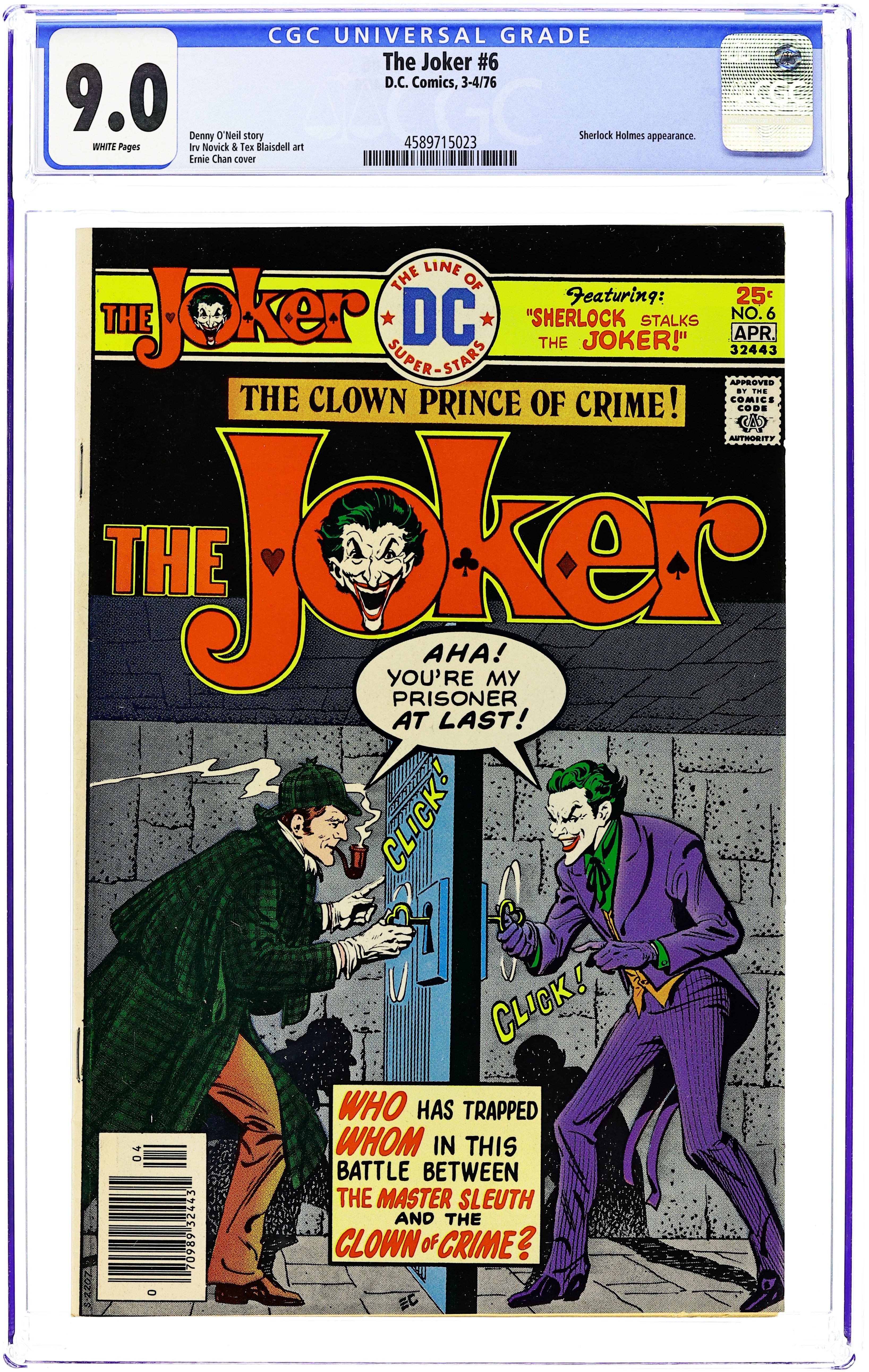 Cover by Ernie Chan. "Sherlock Stalks the Joker!," script by Denny O'Neil, pencils by Irv Novick, inks by Tex Blaisdell; The Joker's latest crime spree has him matching wits with Clive Sigerson, an actor convinced that he is his starring role - Sherlock Holmes! 36 pgs., full color. $0.25. Cover price $0.25.