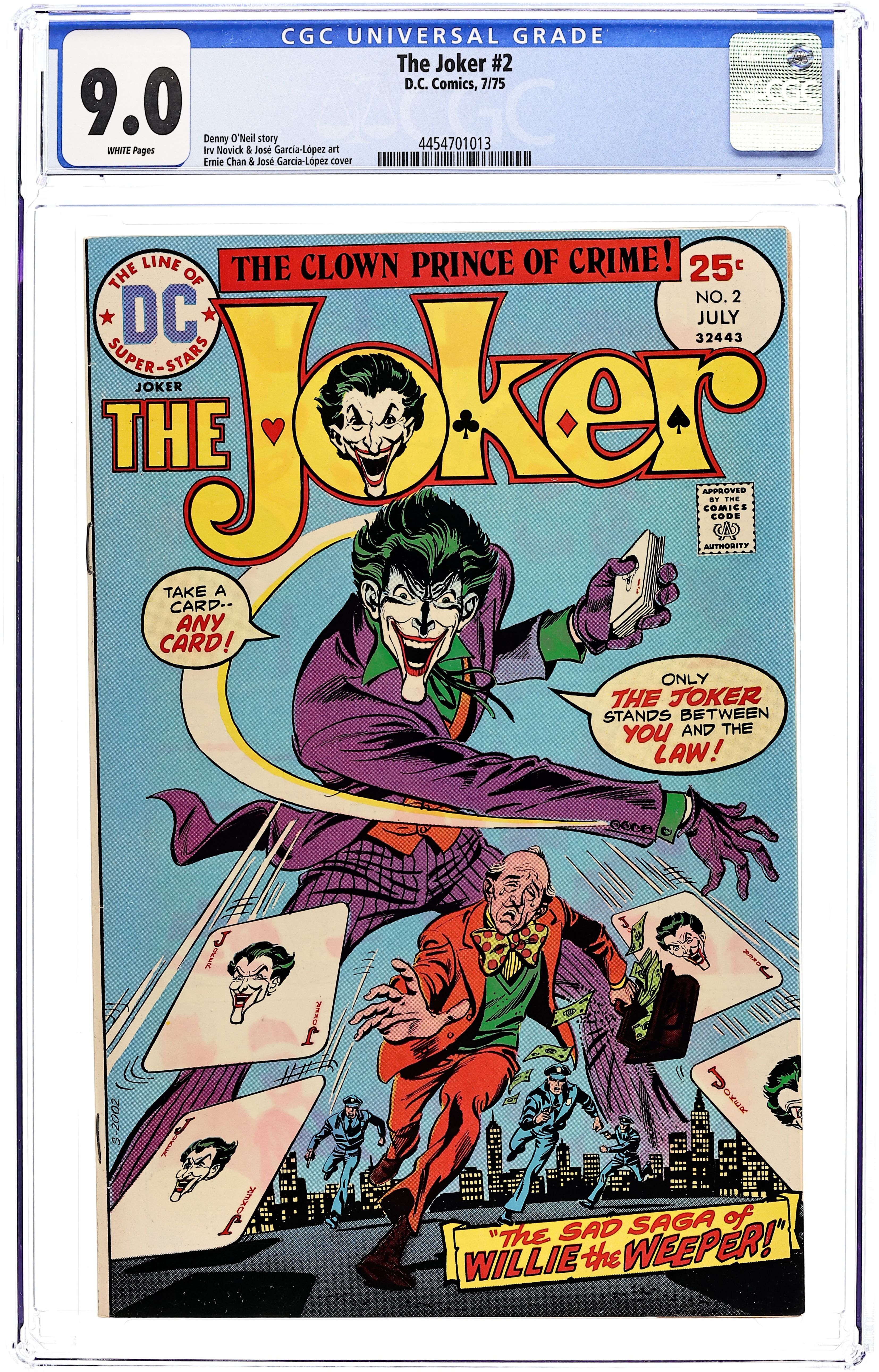 Cover pencils by Ernie Chan, inks by Jose Luis Garcia-Lopez. "The Sad Saga of Willy the Weeper!," script by Denny O'Neil, pencils by Irv Novick, inks by Jose Luis Garcia-Lopez; The Joker teams up with Willie the Weeper when Willie breaks him out of Arkham; The Joker then helps him steal platinum but is thwarted by Gordon. Superman ad. 1 page Joker text article "The Wildest Card, Part 2," about the history of the Joker. 36 pgs., full color. $0.25. Cover price $0.25.