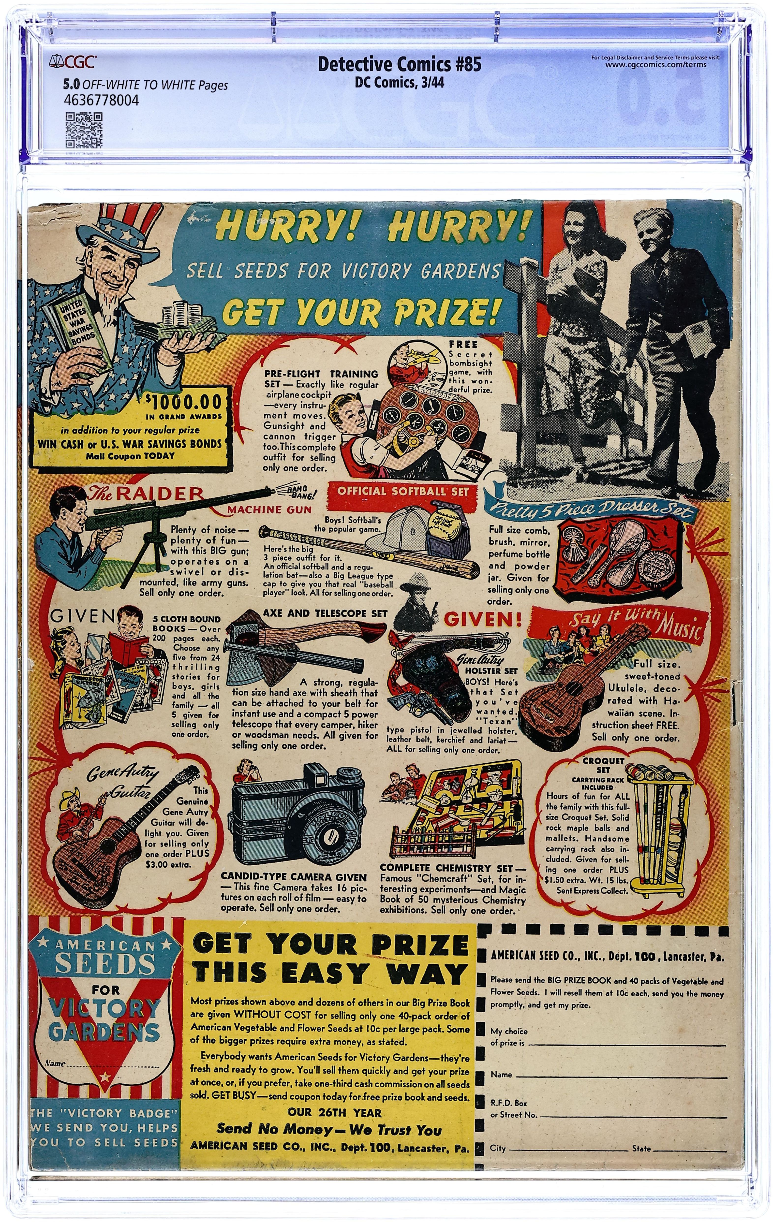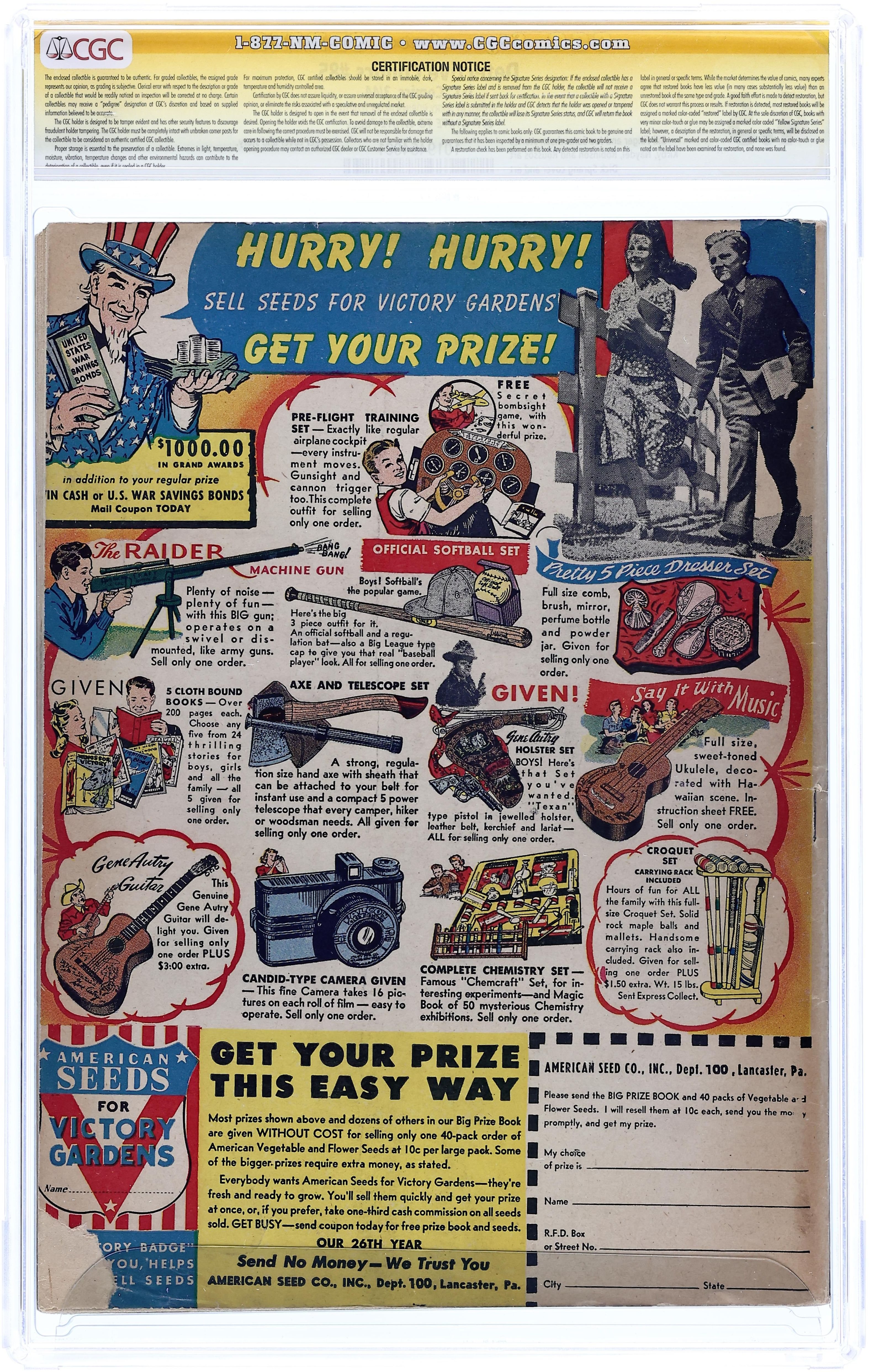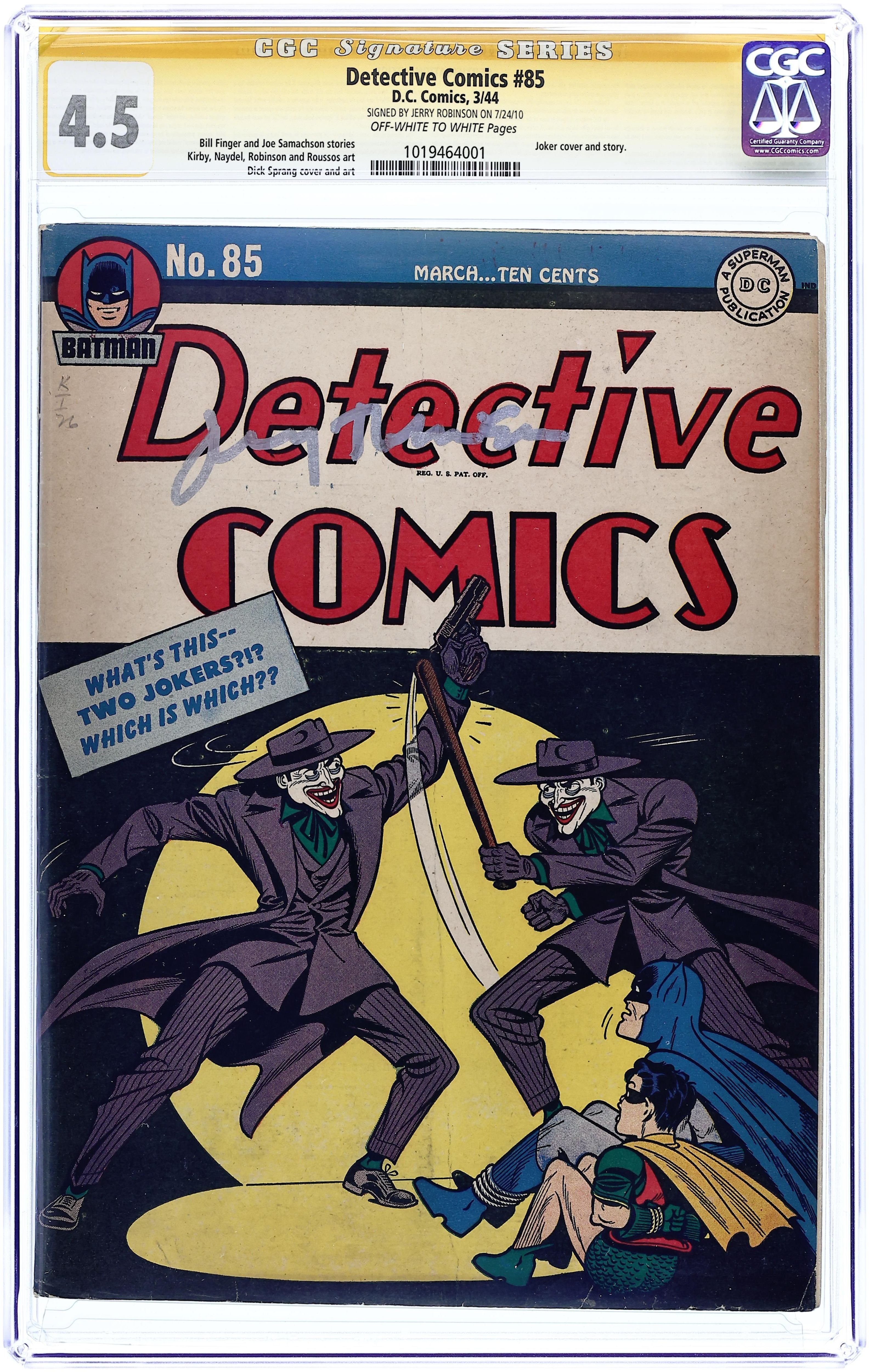 Joker cover art by Dick Sprang. The Joker's Double starring Batman and Robin, script by Bill Finger, pencils by Ed Kressy and Dick Sprang, inks by Dick Sprang. Batman and Robin public service announcement about paper. Three-Ring Binks story, script and art by Jack Farr. The Lone Wolf's Number starring The Crimson Avenger, art by John Daly. The Perfumed Diamonds starring Slam Bradley, art by Martin Naydel. The Short Wave of Crime starring Air Wave, script by Joe Samachson, art by George Roussos. Superman March of Dimes public service announcement, art by Joe Shuster. The Saboteur text story by Eric Carter. Curtain Call for Action starring The Boy Commandos, pencils by Jack Kirby, inks by George Klein. 60 pgs. $0.10. Cover price $0.10.