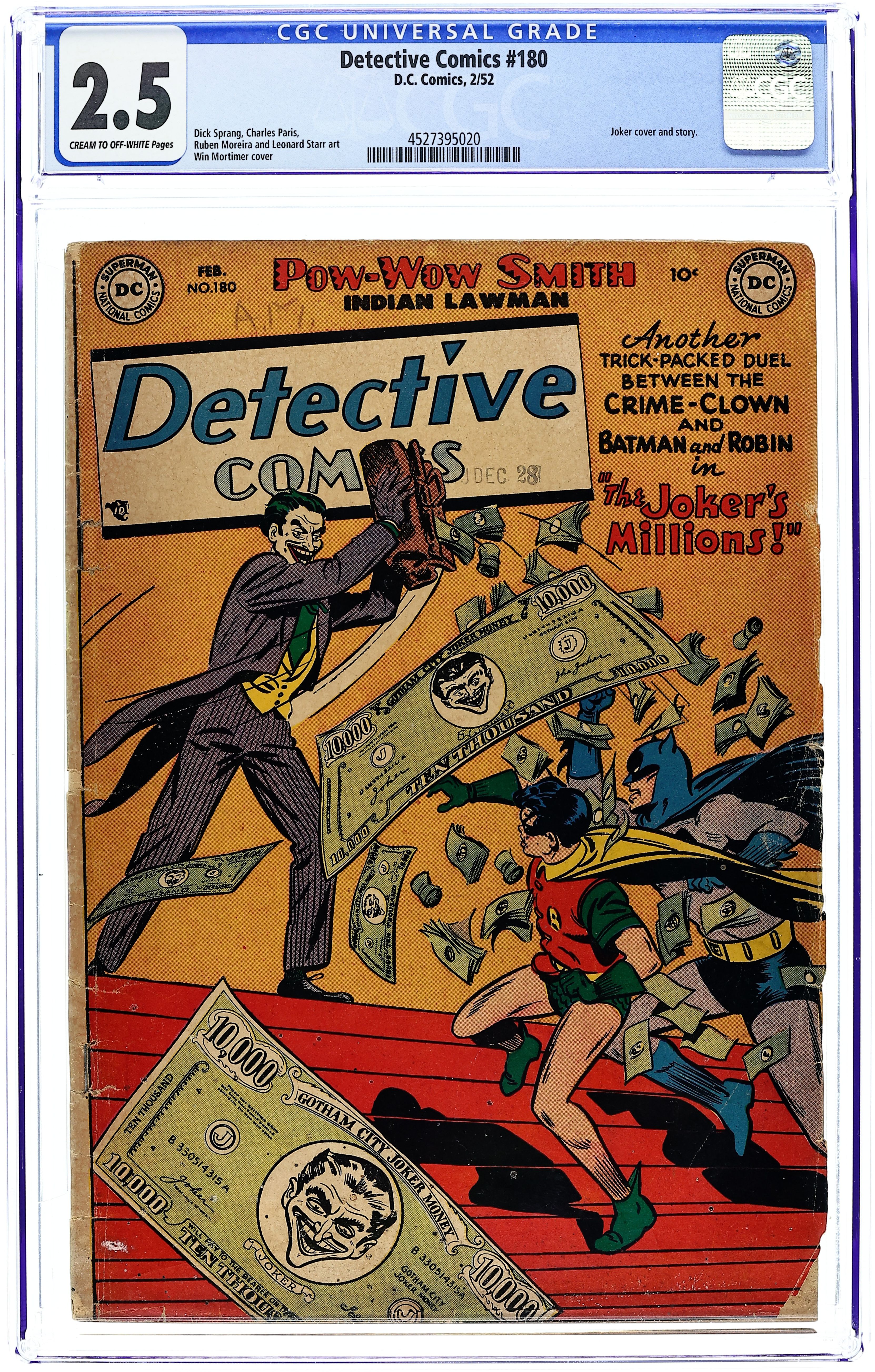 Cover by Win Mortimer. Stories by unknown. Art by Dick Sprang, Charles Paris, Leonard Starr, Ruben Moreira and unknown. Another trick-packed duel between the Joker and Batman and Robin in "The Joker's Millions!" with art by Dick Sprang and Charles Paris. Plus: Pow-Wow Smith, Indian Lawman in "The Ghost Chief's Secret!" with art by Leonard Starr; Robotman in "Displays for Crime!"; and Impossible -- But True! tale "The Man with the Cosmic Punch!" (featuring Roy Raymond) with art by Ruben Moreira. Also: Little Pete 1-pager by Henry Boltinoff; Peg 1-pager by Boltinoff; Casey the Cop 1-pager by Boltinoff; and 2-page text piece "Million-Dollar Burglaries" by David Kahn. 44 pages, full color. Cover price $0.10.