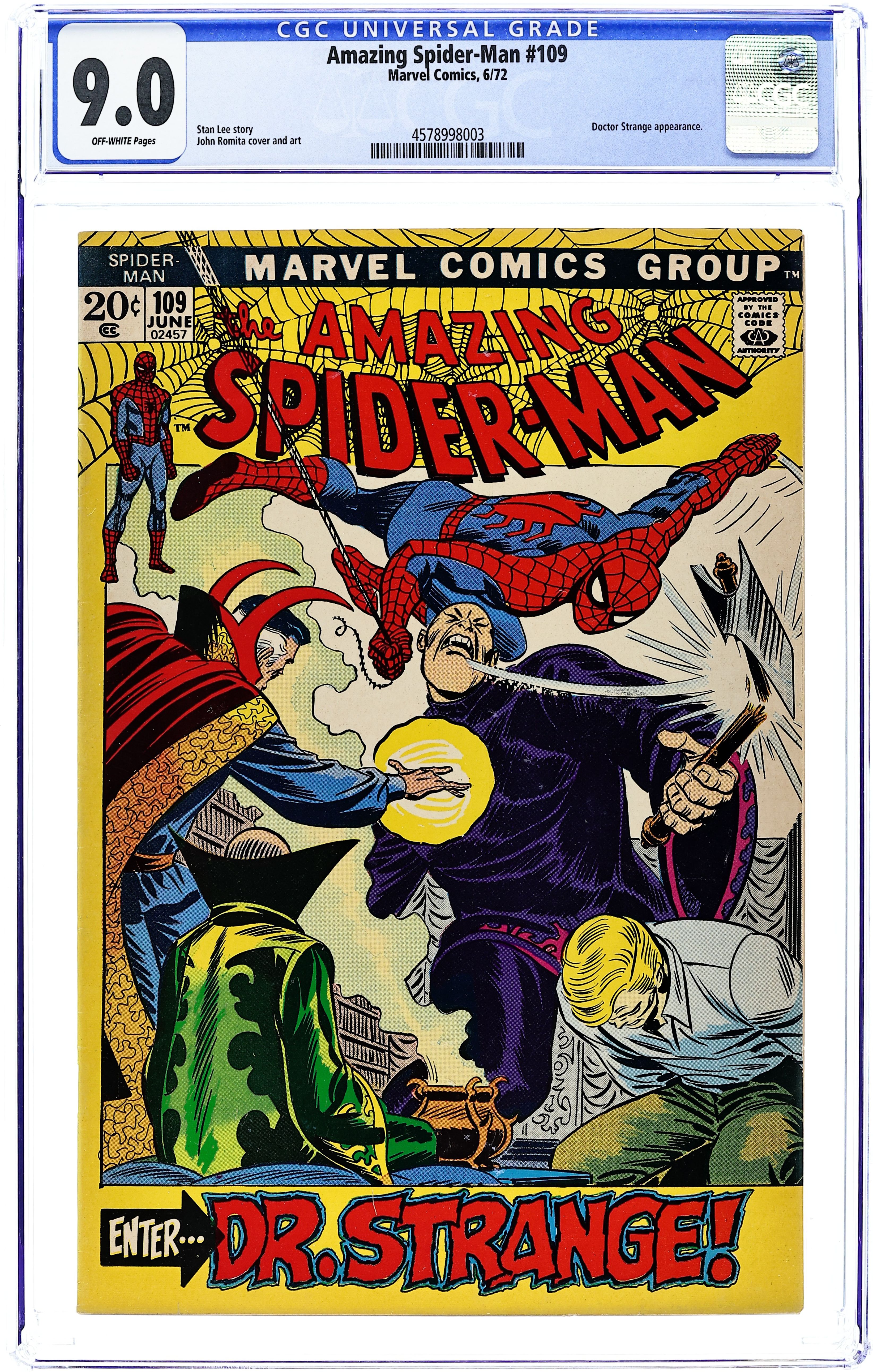 "Enter: Dr. Strange!" Part 2 of 2. Guest-starring Doctor Strange. Script by Stan Lee. Pencils by John Romita. Inks by John Romita and Tony Mortellaro (backgrounds). Cover by John Romita. The web-slinger frantically swings through the city trying to pick up a signal from his spider tracer! The amazing one tossed the tracer on the tall man who abducted Flash last issue. So, find the tracer...find Flash! But instead, Spider-Man picks up a message from the Master of the Mystic Arts! Somehow Dr. Strange knows were Flash has been taken. The duo rushes to the location, and the battle to rescue Flash begins! Cameo appearances by Gwen Stacy, Harry Osborn, Aunt May, and Sha Shan. (Notes: Spider-Man and Dr. Strange meet again in Marvel Team-Up #21. This story was reprinted in Marvel Tales #88.) 36 pages. Cover price $0.20.